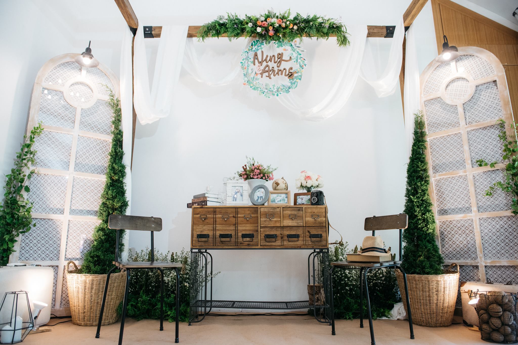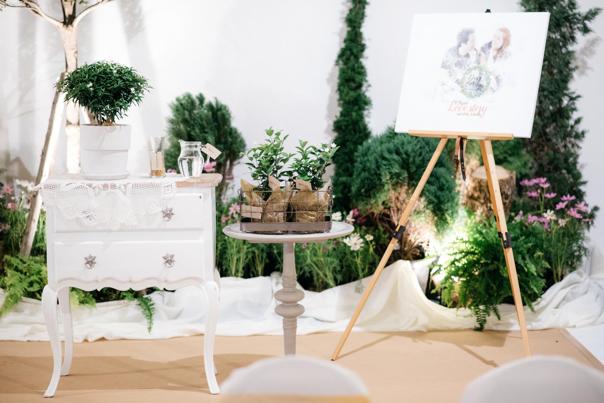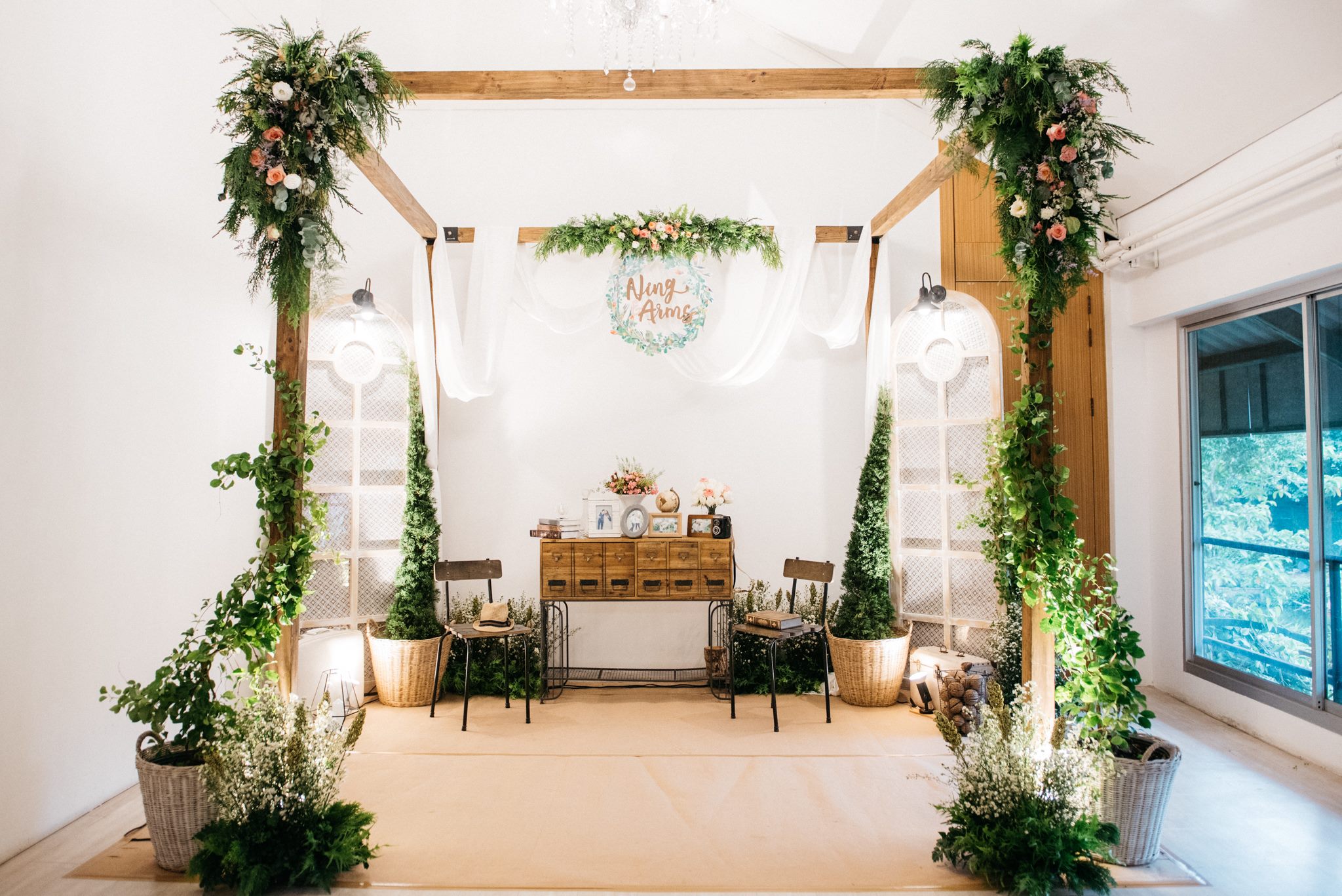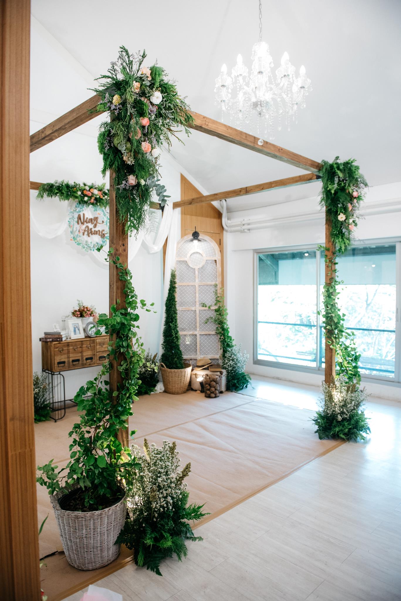 ก่อนอื่นต้องขอขอบคุณบ่าวสาวทั้งคุณอาร์มและคุณหนิงที่ไว้วาง ใจให้ Shabby Chic Gardens ได้ดูแลงานตกแต่งสถานที่ทั้งหมด งานนี้เหมือนเป็นการยกสวนไปไว้ในห้องจัดเลี้ยงกันเลยทีเดียว เนื่องจากเจ้าสาวเน้นว่าของสวนเอาซะมากๆ นุ่นเลยออกแบบให้เหมือนมีสวนเป็นฉากหลังในห้องสีขาวสะอาดตา ที่หนักหนาสาหัสหน่อยคือการยกต้นไม้ใหญ่เข้าไปไว้ในห้องจัดเลี้ยงที่อยู่บนชั้นสอง ไม่ใช่เรื่องง่ายแต่ก็ไม่ยากเกินความสามารถของพวกเรา 555555 ทีมงานเราสามารถค่ะ (ขอพักแพร๊บ) เวทีสำหรับงานพิธีการจึงออกมาสวยสมดังที่เจ้าสาวตั้งใจ ส่วนเจ้าบ่าวก็ไม่น้อยหน้า เพราะรูปภาพที่นำมาใช้ตกแต่งในงานเจ้าบ่าวเป็นคนคลีเอทโทนสีและปรับภาพให้ดูเข้ากับงานด้วยตัวเองเลย งานนี้จึงเหมือนเป็นการร่วมมือกันของทุกฝ่าย ลองไปชมภาพพร้อมๆ กันค่ะ
