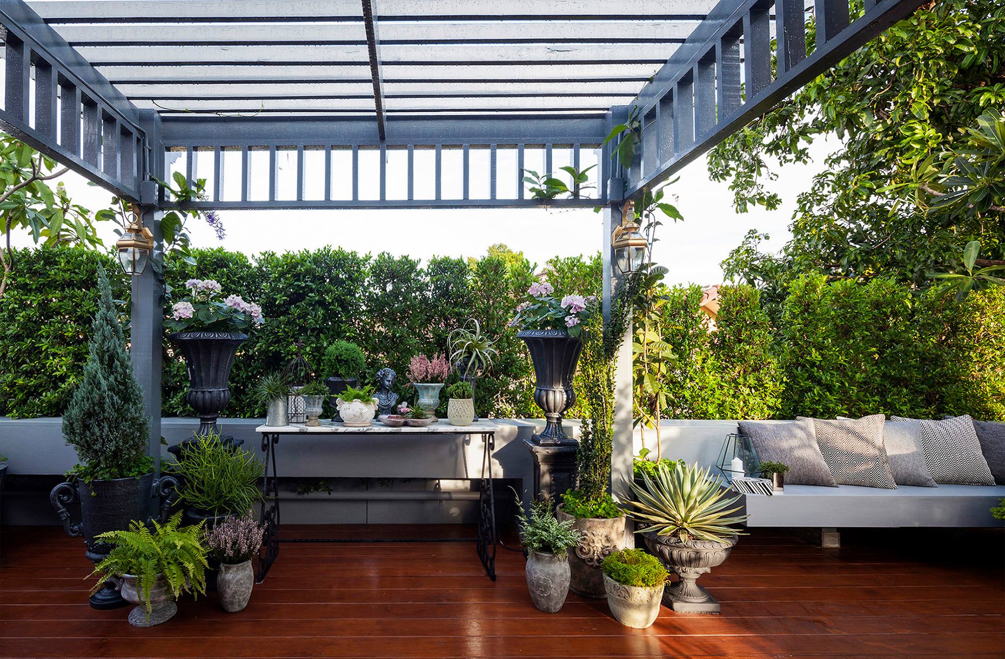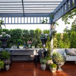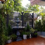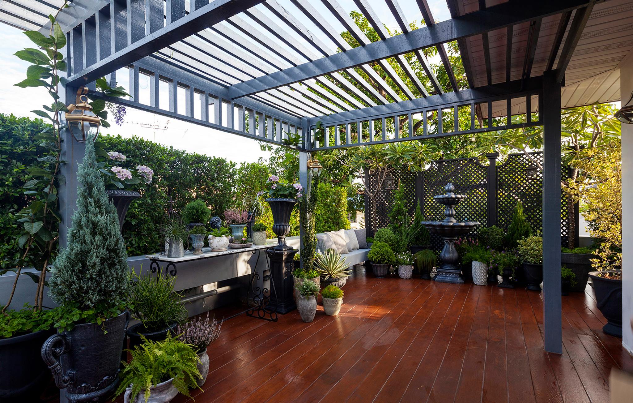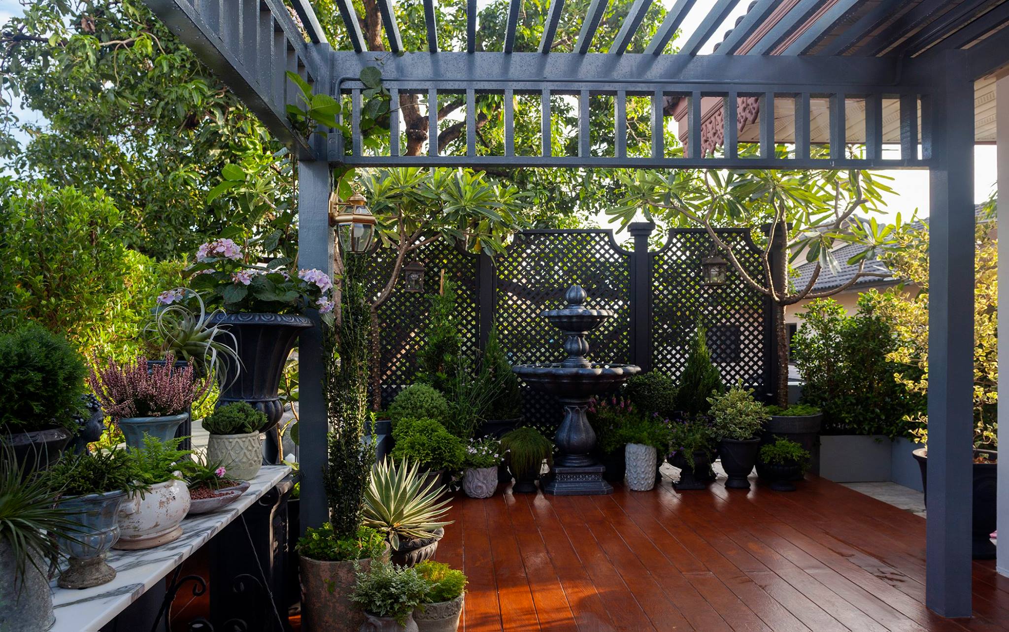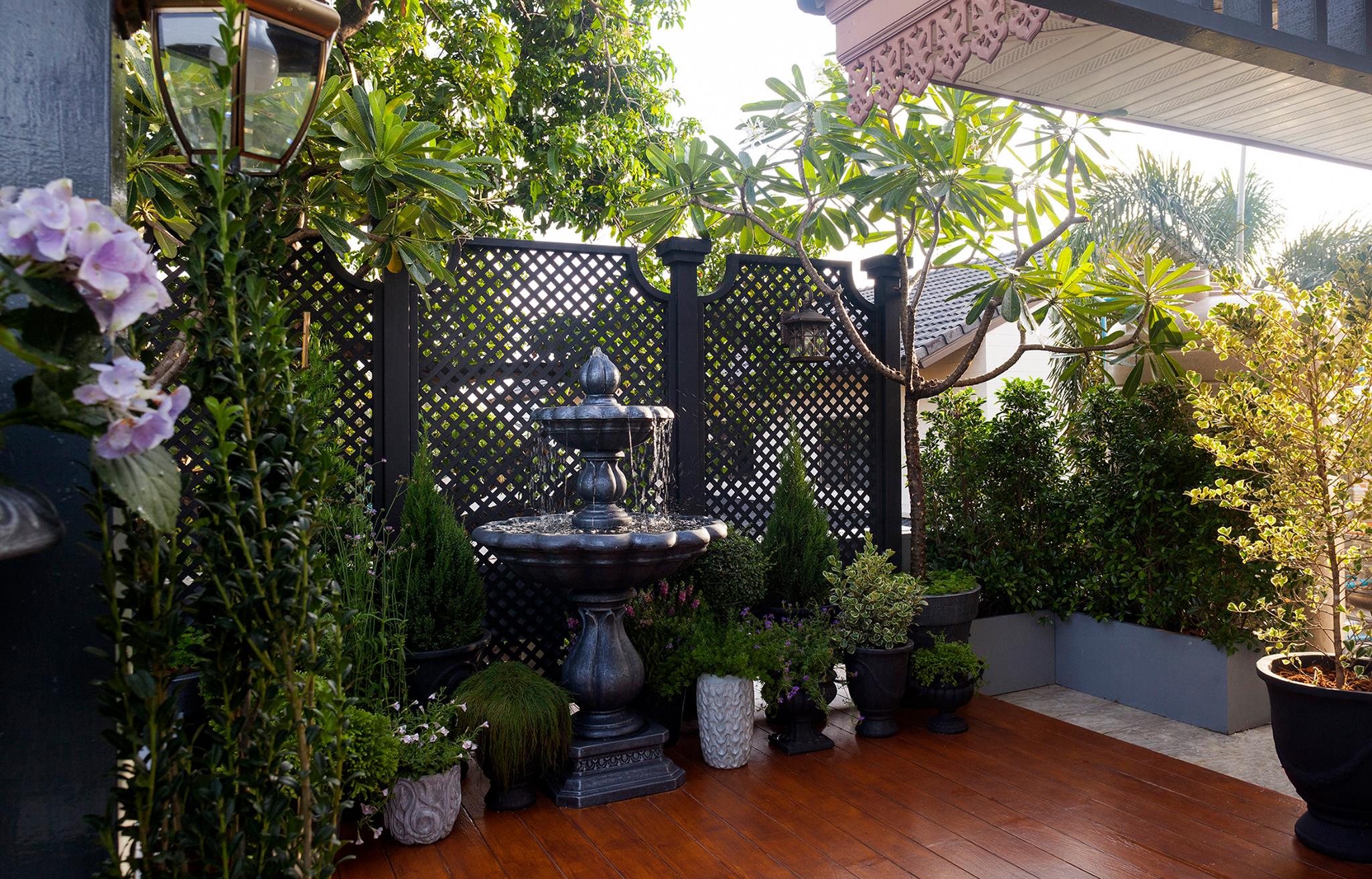 มาอวดงานสวนกันบ้างค่ะ สวนระเบียงบ้านคุณเอ๊ะเป็นงานรีนูเวทจากระเบียงบ้านเดิมขนาดของระเบียงค่อนข้างกว้าง อีกทั้งส่วนนี้ยังเชื่อมต่อจากห้องนอนส่วนตัว เราจึงออกแบบให้มีรั้วของแนวต้นไทรเพื่อพรางสายตาและสร้างความเป็นส่วนตัว ตัวศาลาเดิมที่มีอยู่ถูกเปลี่ยนโทนสีให้เข้ากับสไตล์การตกแต่ง ผนังด้านหนึ่งของสวนออกแบบให้เป็นระแนงเหล็กทำสีดำพรางสายตาจากเพื่อนบ้าน และวางอ่างน้ำล้นเน้นจุดรับสายตาและเพิ่มเสียงน้ำสร้างบรรยากาศชวนนั่งดูช่างลงตัวกับที่นั่งยาวที่ออกแบบไว้ด้านข้างโดยยึดติดกับขอบกระบะปลูกต้นไม้เดิมเพิ่มประโยชน์การใช้งานในสวนได้เป็นอย่างดี ส่วนอีกหนึ่งไฮไลน์เป็นมุมโต๊ะเลี้ยงต้นไม้ที่รับมุมมองจากมุมห้องนอน เราออกแบบให้เป็นมุมสะสมต้นไม้เล็กๆ และของกระจุกกระจิกได้อย่างน่ารัก ทำให้รูปแบบการตกแต่งสวนโดยเป็นสไตล์โมเดิร์นคลาสสิกยอดนิยม เน้นความอบอุ่นและประโยชน์ใช้งานสูงสุดด้วยคะ