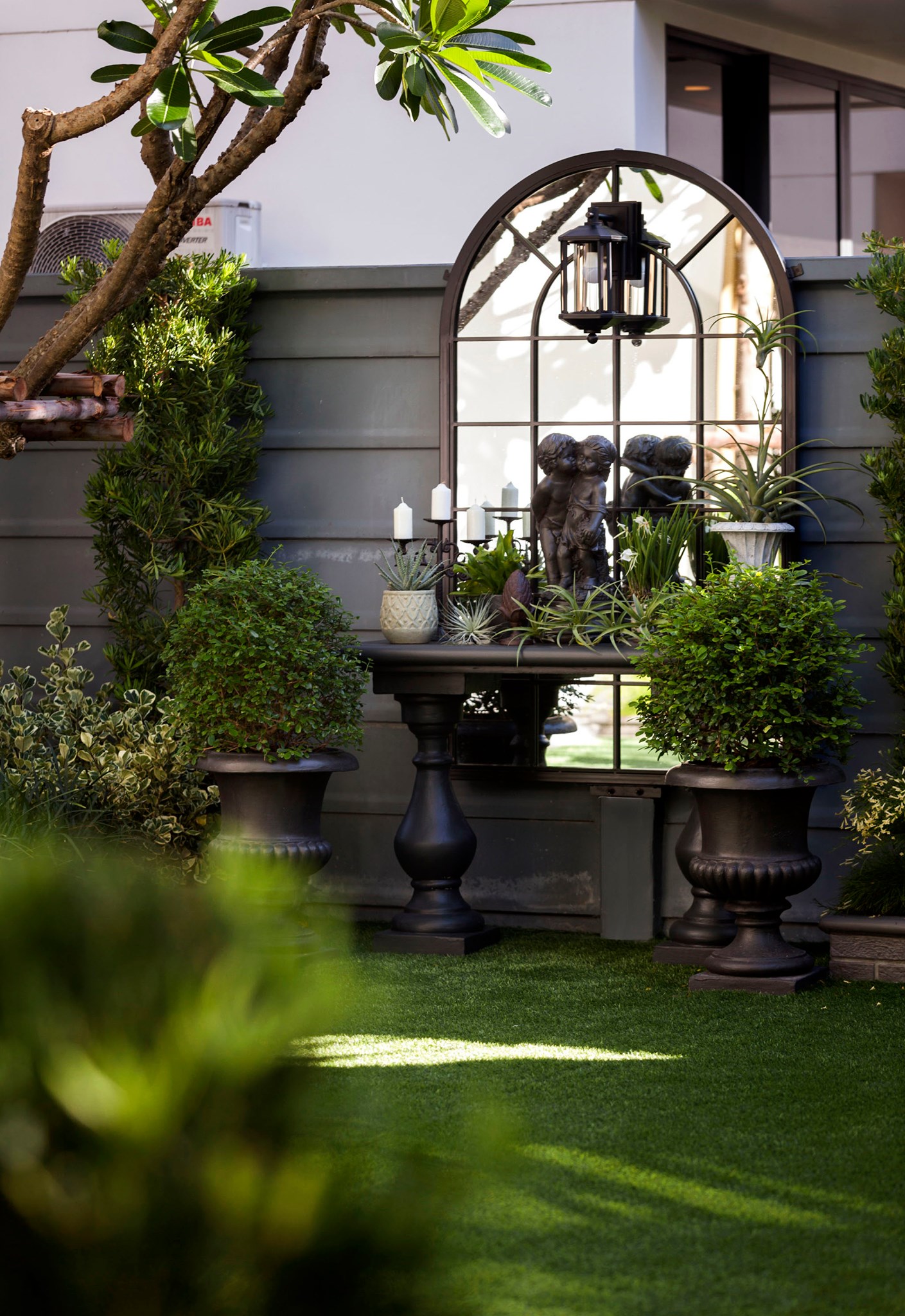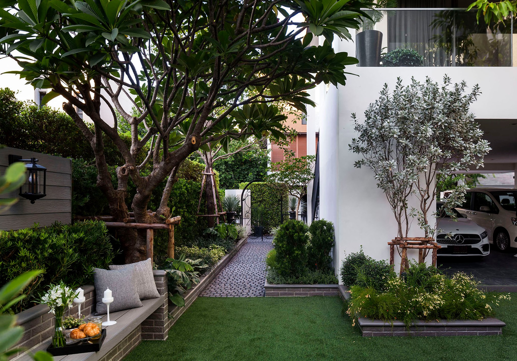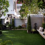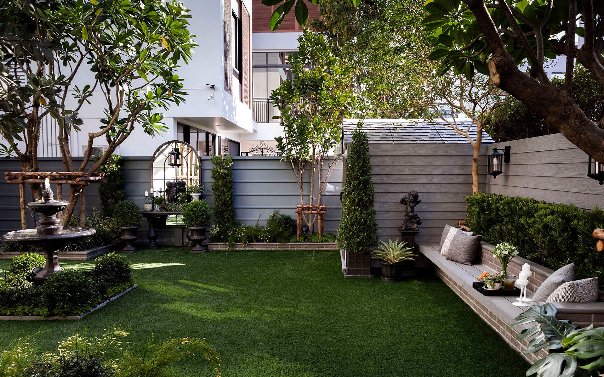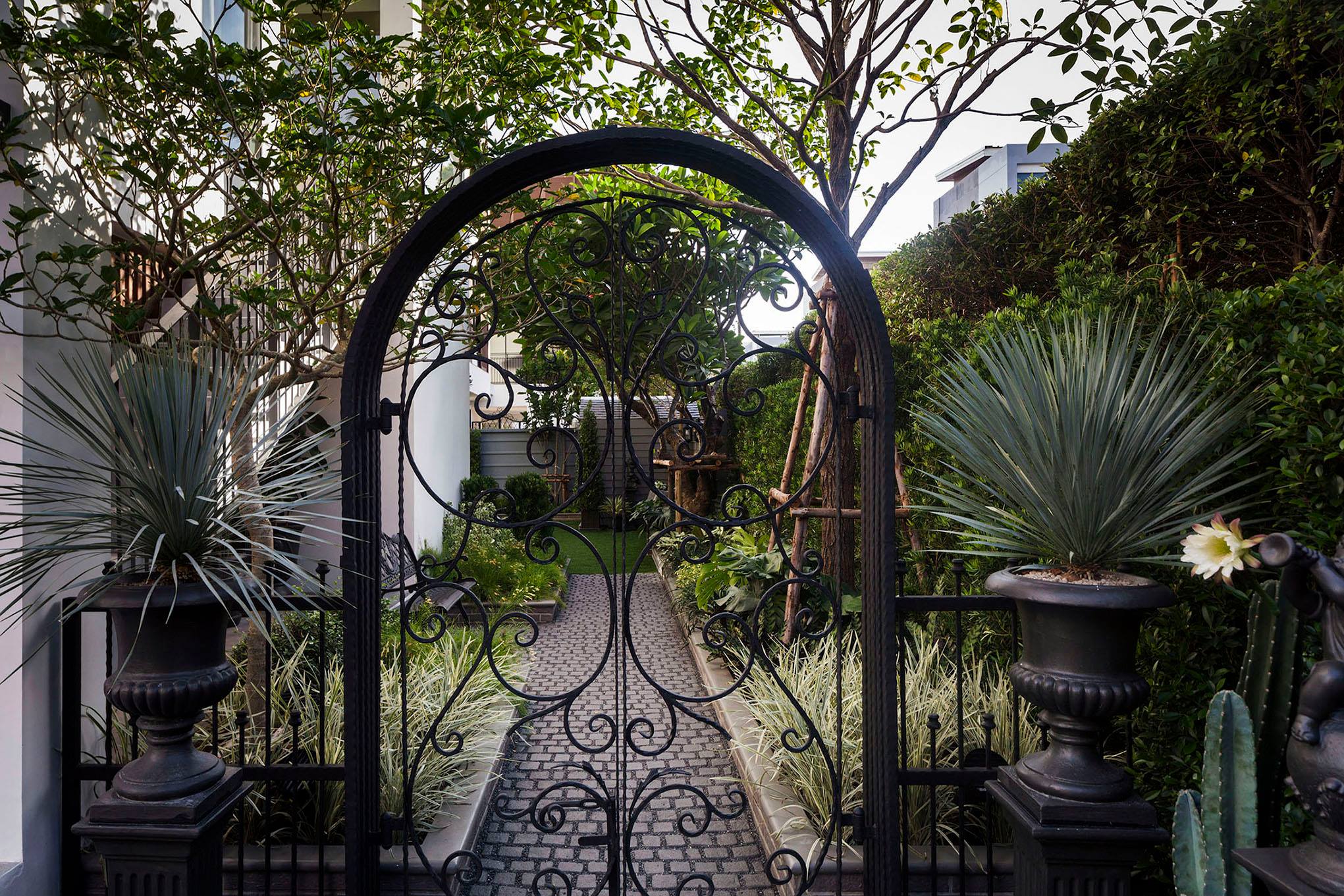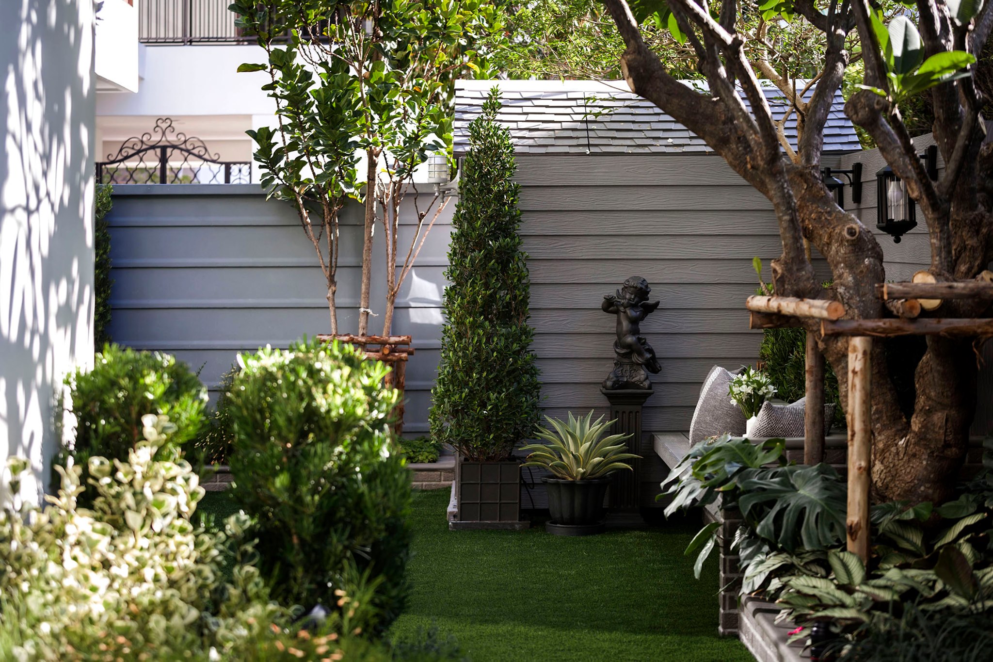 ขอขอบคุณพี่จั๊มที่ไว้ใจให้ Shabby Chic Gardens ได้ออกแบบสวนและดูแลในส่วนของงาน Consult และงาน Soft scape ของสวนแห่งนี้ สวนแห่งนี้เป็นการรีนูเวทสวนเพื่อให้ตอบสนองการใช้งานของเจ้าของบ้าน เนื่องจากพี่จั๊มได้ให้โจทย์ว่าสวนแรกที่จัดไว้ค่อนข้างครึ้มและทำความสะอาดกวาดค่อนข้างลำบาก เราจึงออกแบบเน้นการดูแลที่เรียบง่าย สะอาด เดินสะดวก จัดสรรพื้นที่ให้ได้เข้าใช้งานได้อย่างทั่วถึง รวมทั้งรองรับการใช้งานของทุกคนภายในครอบครัว ในสไตล์ของ Shabby Chic Gardens ที่เราถนัด มุมหน้าบ้านเราย้ายซุ้มประตูเหล็กชุดเดิมของเจ้าของบ้านขยับออกมา และทำรั้วเพิ่มสร้างเป็นจุดต้อนรับด้านหน้าของสวน วางกระถางปลูกต้นไม้ดูแลง่ายๆ รูปทรงเท่ห์ๆ เสริมด้วยตุ๊กตาตัวเดิมที่ทำสีใหม่กลายเป็นมุมต้อนรับแสนน่ารัก ทางเดินข้างบ้านนำสายตาไปยังสนามหญ้าด้านในบ้าน สองข้างทางก่อเป็นกระบะกรุอิฐเตี้ยๆ สำหรับปลูกต้นไม้ เว้นจังหวะปูพื้นเชื่อมต่อกับพื้นสเต็ปใต้บันได และวางเก้าอี้สนามเหล็กหล่อทำสีดำเพิ่มฟังก์ชั่นการใช้งาน สวนด้านในเปิดมุมมองด้วยสนามหญ้าเทียมสีเขียว ออกแบบให้มีที่นั่งเชื่อมต่อกับห้องเก็บของเดิมที่ถูกขยับปรับตำแหน่งเข้ามุมบ้านเพื่อเพิ่มพื้นที่ใช้งาน วางน้ำพุทำสีดำชุดเดิมที่มีในสวนเป็นจุดเด่นในโซนนี้ และมีจุดไฮไลเป็นกระจกเงาบานโค้งทรงคลาสสิกและโต๊ะปูนขากลึงที่สั่งทำโดยเฉพาะวางเป็น background สะท้อนเพิ่มมิติให้สวนดูเก๋ไก๋ไม่ซ้ำใคร ชานบ้านที่เชื่อมต่อมายังลานสวน ถูกเปลี่ยนพื้นไม้เทียมสีเดิมที่ชำรุดให้เป็นพื้นไม้เทียมสีเทาดูเข้ากันกับโทนสีโดยรวม และวางกระถางต้นไม้ทรงโมเดิร์นเก๋ๆ เพิ่มสีเขียวได้อย่างดี