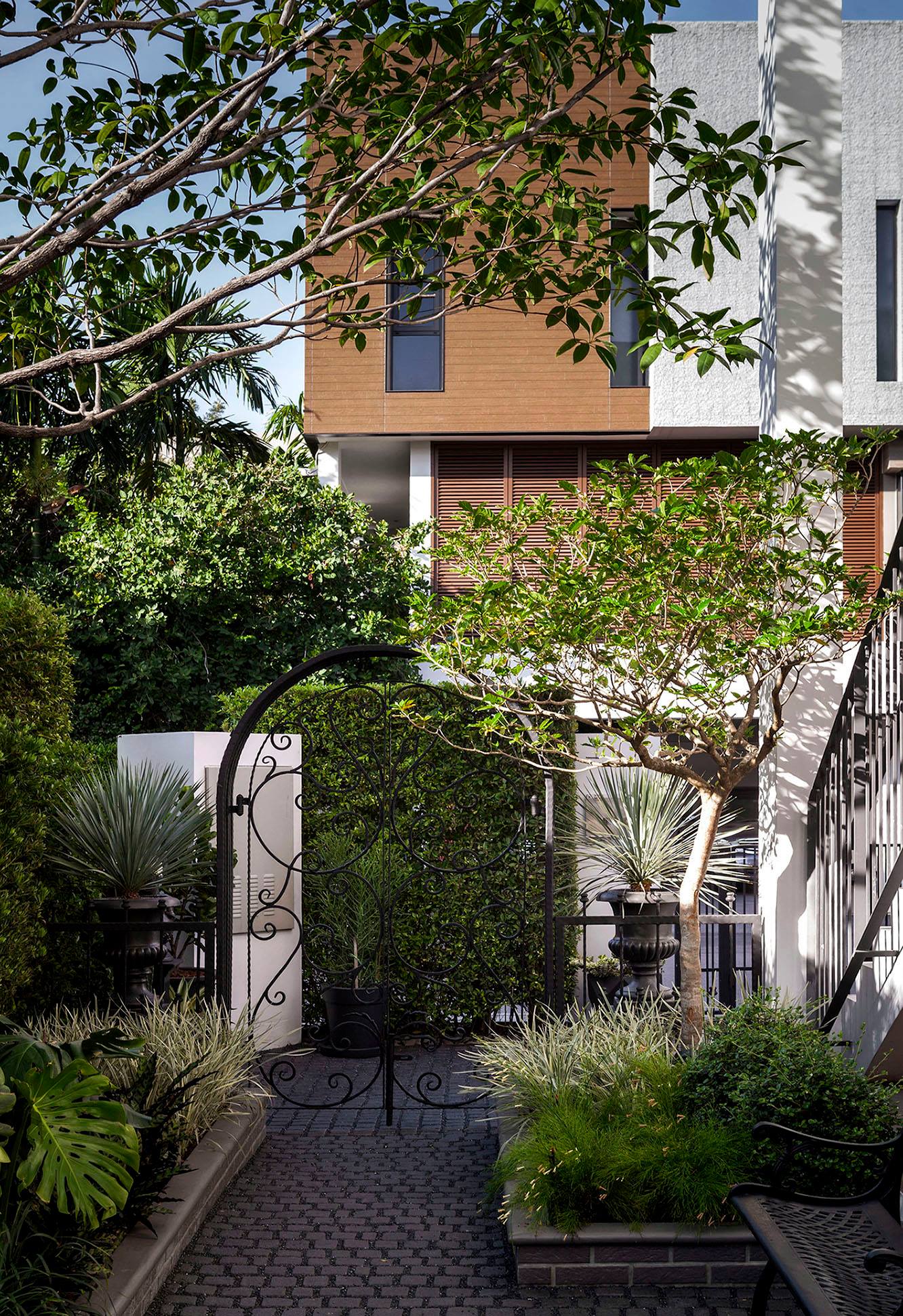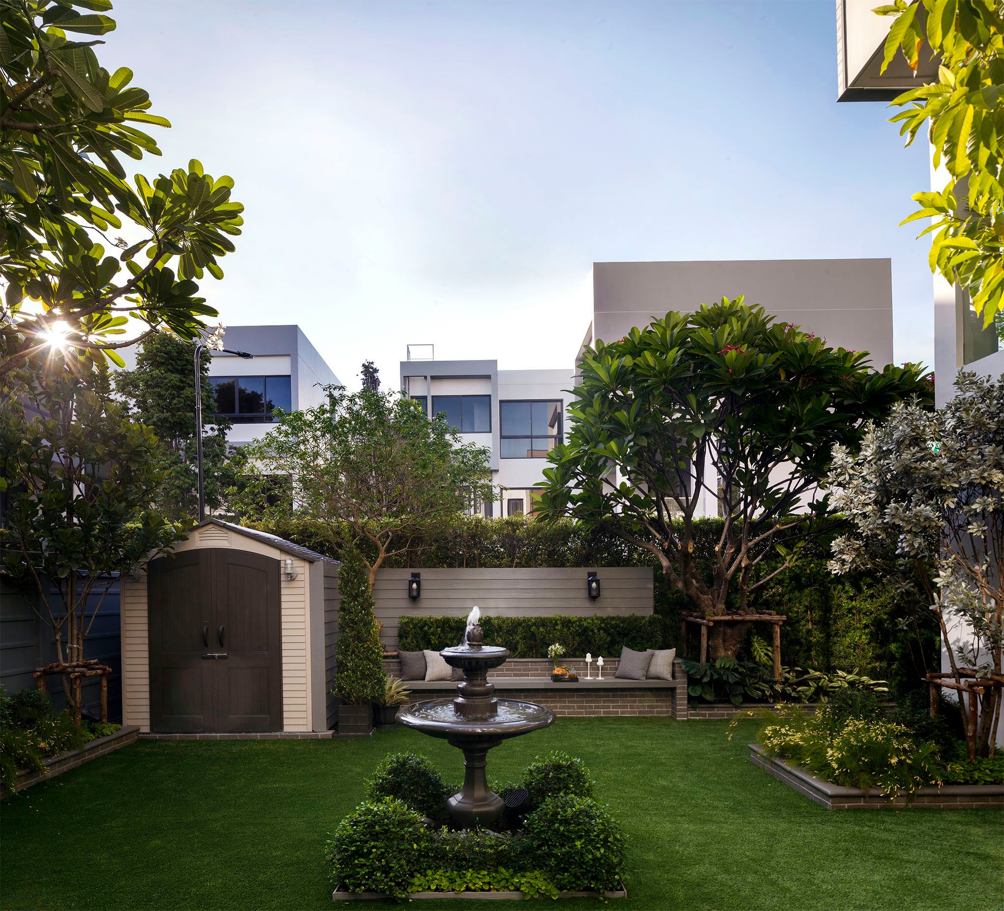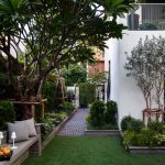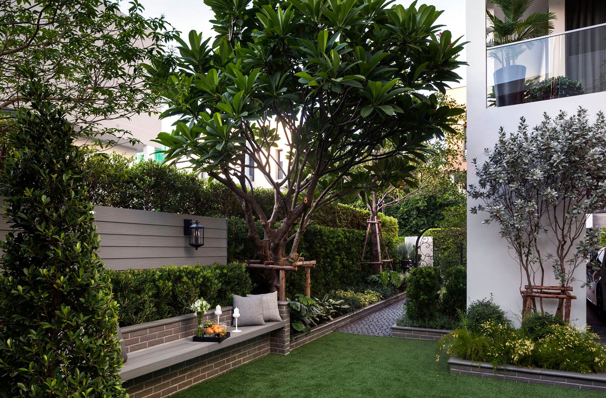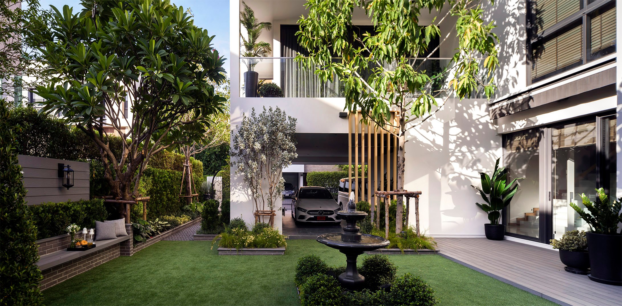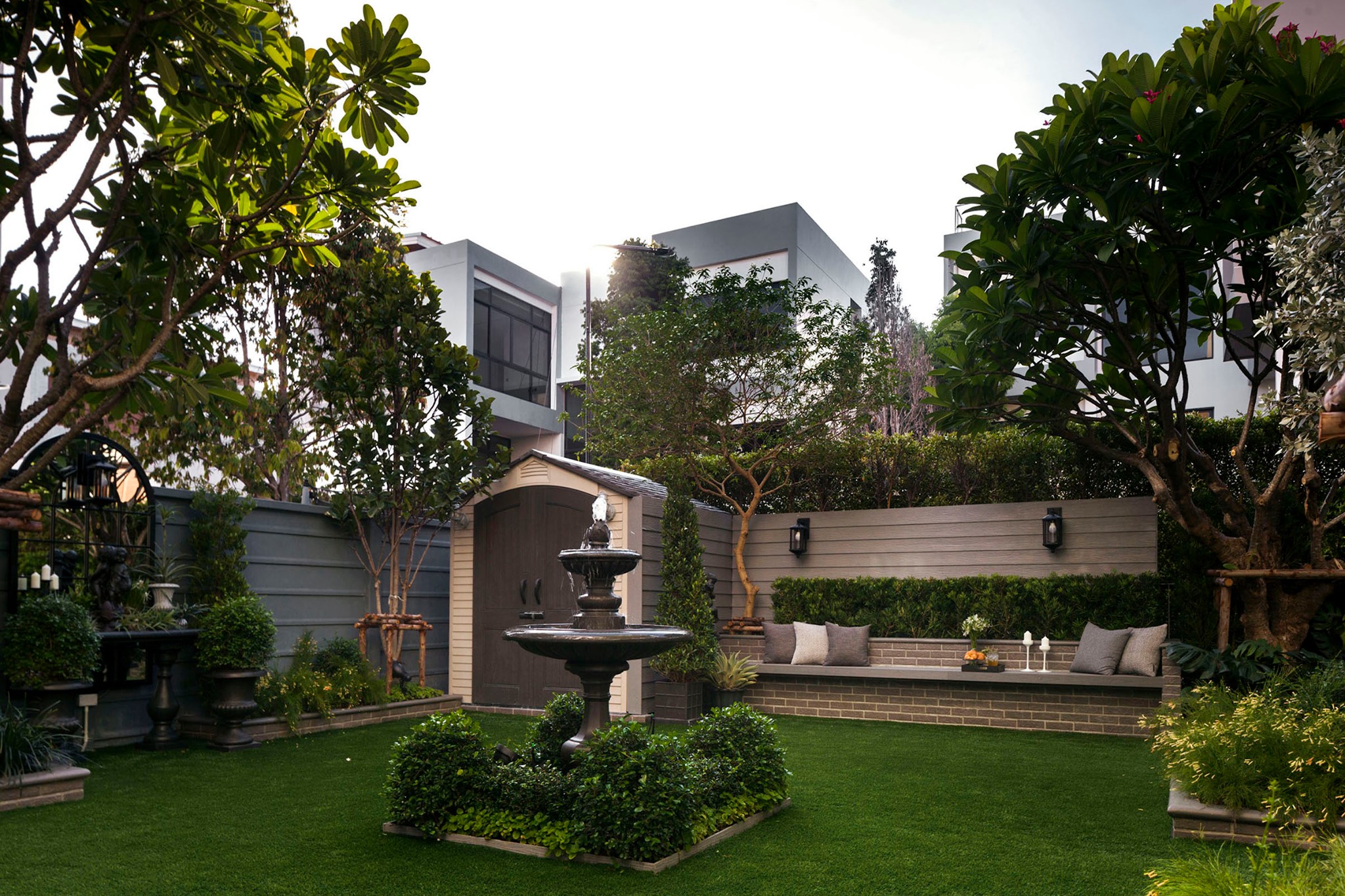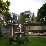 ขอขอบคุณพี่จั๊มที่ไว้ใจให้ Shabby Chic Gardens ได้ออกแบบสวนและดูแลในส่วนของงาน Consult และงาน Soft scape ของสวนแห่งนี้ สวนแห่งนี้เป็นการรีนูเวทสวนเพื่อให้ตอบสนองการใช้งานของเจ้าของบ้าน เนื่องจากพี่จั๊มได้ให้โจทย์ว่าสวนแรกที่จัดไว้ค่อนข้างครึ้มและทำความสะอาดกวาดค่อนข้างลำบาก เราจึงออกแบบเน้นการดูแลที่เรียบง่าย สะอาด เดินสะดวก จัดสรรพื้นที่ให้ได้เข้าใช้งานได้อย่างทั่วถึง รวมทั้งรองรับการใช้งานของทุกคนภายในครอบครัว ในสไตล์ของ Shabby Chic Gardens ที่เราถนัด มุมหน้าบ้านเราย้ายซุ้มประตูเหล็กชุดเดิมของเจ้าของบ้านขยับออกมา และทำรั้วเพิ่มสร้างเป็นจุดต้อนรับด้านหน้าของสวน วางกระถางปลูกต้นไม้ดูแลง่ายๆ รูปทรงเท่ห์ๆ เสริมด้วยตุ๊กตาตัวเดิมที่ทำสีใหม่กลายเป็นมุมต้อนรับแสนน่ารัก ทางเดินข้างบ้านนำสายตาไปยังสนามหญ้าด้านในบ้าน สองข้างทางก่อเป็นกระบะกรุอิฐเตี้ยๆ สำหรับปลูกต้นไม้ เว้นจังหวะปูพื้นเชื่อมต่อกับพื้นสเต็ปใต้บันได และวางเก้าอี้สนามเหล็กหล่อทำสีดำเพิ่มฟังก์ชั่นการใช้งาน สวนด้านในเปิดมุมมองด้วยสนามหญ้าเทียมสีเขียว ออกแบบให้มีที่นั่งเชื่อมต่อกับห้องเก็บของเดิมที่ถูกขยับปรับตำแหน่งเข้ามุมบ้านเพื่อเพิ่มพื้นที่ใช้งาน วางน้ำพุทำสีดำชุดเดิมที่มีในสวนเป็นจุดเด่นในโซนนี้ และมีจุดไฮไลเป็นกระจกเงาบานโค้งทรงคลาสสิกและโต๊ะปูนขากลึงที่สั่งทำโดยเฉพาะวางเป็น background สะท้อนเพิ่มมิติให้สวนดูเก๋ไก๋ไม่ซ้ำใคร ชานบ้านที่เชื่อมต่อมายังลานสวน ถูกเปลี่ยนพื้นไม้เทียมสีเดิมที่ชำรุดให้เป็นพื้นไม้เทียมสีเทาดูเข้ากันกับโทนสีโดยรวม และวางกระถางต้นไม้ทรงโมเดิร์นเก๋ๆ เพิ่มสีเขียวได้อย่างดี
