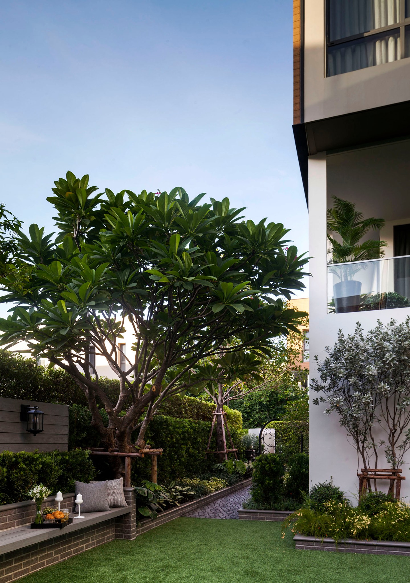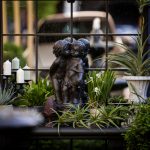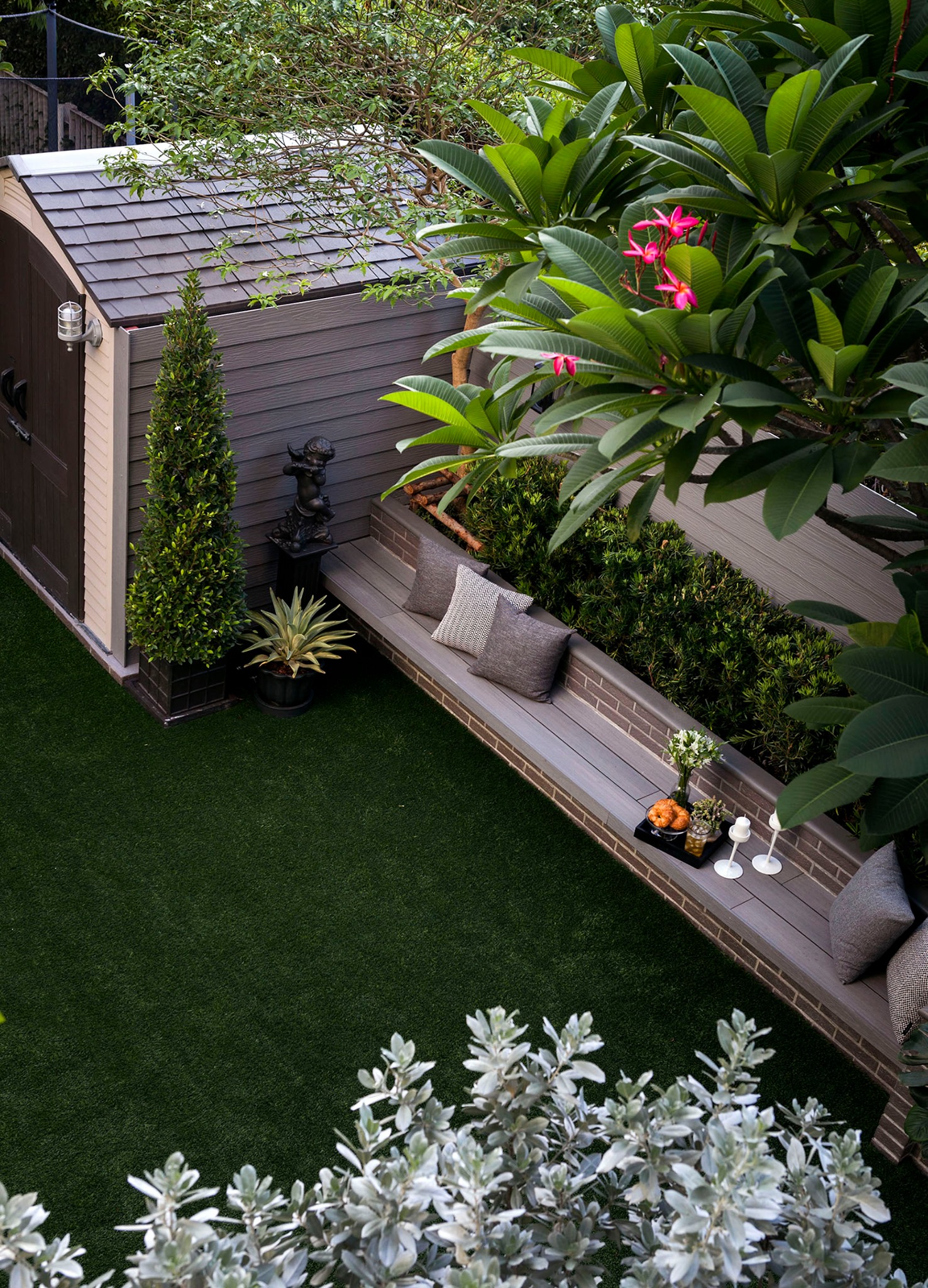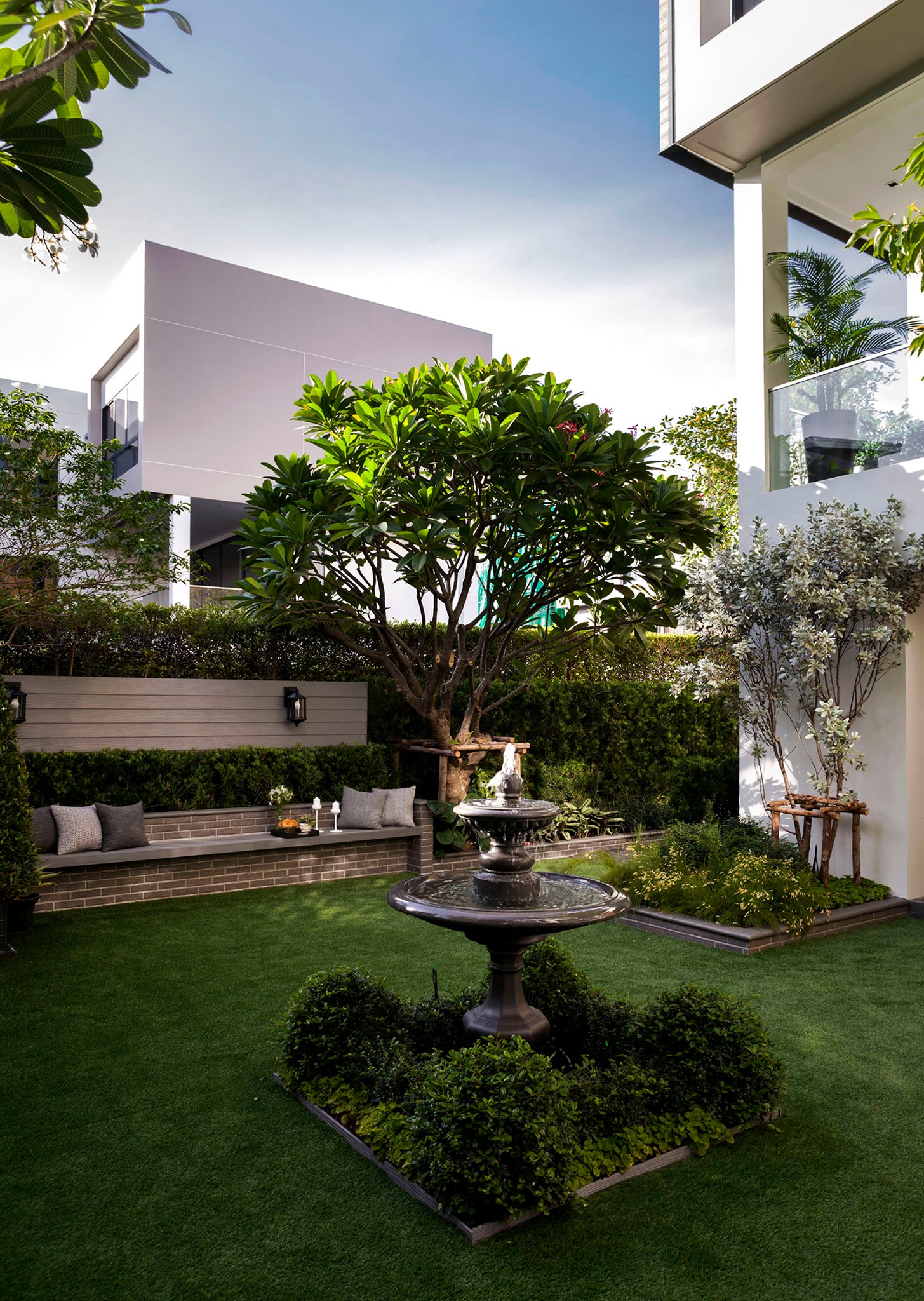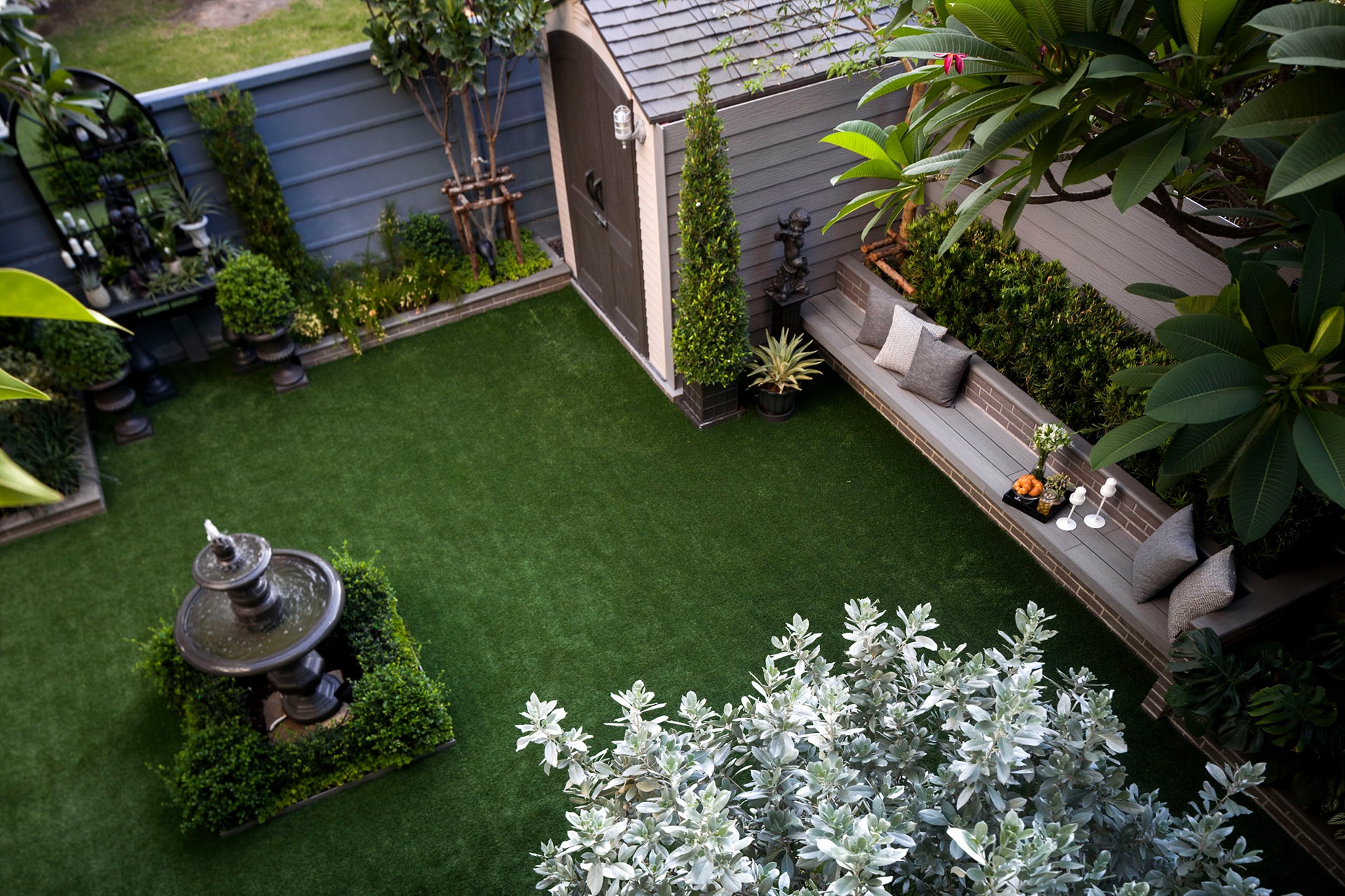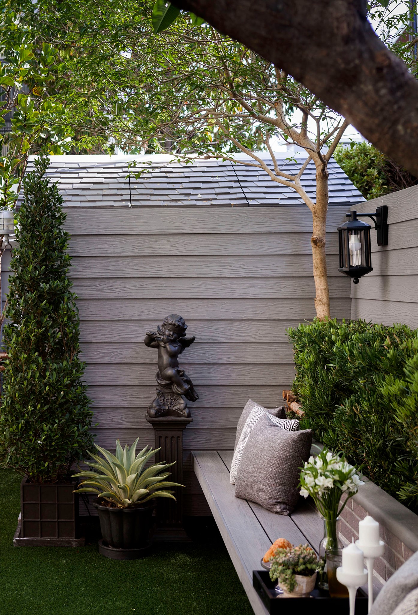 ขอขอบคุณพี่จั๊มที่ไว้ใจให้ Shabby Chic Gardens ได้ออกแบบสวนและดูแลในส่วนของงาน Consult และงาน Soft scape ของสวนแห่งนี้ สวนแห่งนี้เป็นการรีนูเวทสวนเพื่อให้ตอบสนองการใช้งานของเจ้าของบ้าน เนื่องจากพี่จั๊มได้ให้โจทย์ว่าสวนแรกที่จัดไว้ค่อนข้างครึ้มและทำความสะอาดกวาดค่อนข้างลำบาก เราจึงออกแบบเน้นการดูแลที่เรียบง่าย สะอาด เดินสะดวก จัดสรรพื้นที่ให้ได้เข้าใช้งานได้อย่างทั่วถึง รวมทั้งรองรับการใช้งานของทุกคนภายในครอบครัว ในสไตล์ของ Shabby Chic Gardens ที่เราถนัด มุมหน้าบ้านเราย้ายซุ้มประตูเหล็กชุดเดิมของเจ้าของบ้านขยับออกมา และทำรั้วเพิ่มสร้างเป็นจุดต้อนรับด้านหน้าของสวน วางกระถางปลูกต้นไม้ดูแลง่ายๆ รูปทรงเท่ห์ๆ เสริมด้วยตุ๊กตาตัวเดิมที่ทำสีใหม่กลายเป็นมุมต้อนรับแสนน่ารัก ทางเดินข้างบ้านนำสายตาไปยังสนามหญ้าด้านในบ้าน สองข้างทางก่อเป็นกระบะกรุอิฐเตี้ยๆ สำหรับปลูกต้นไม้ เว้นจังหวะปูพื้นเชื่อมต่อกับพื้นสเต็ปใต้บันได และวางเก้าอี้สนามเหล็กหล่อทำสีดำเพิ่มฟังก์ชั่นการใช้งาน สวนด้านในเปิดมุมมองด้วยสนามหญ้าเทียมสีเขียว ออกแบบให้มีที่นั่งเชื่อมต่อกับห้องเก็บของเดิมที่ถูกขยับปรับตำแหน่งเข้ามุมบ้านเพื่อเพิ่มพื้นที่ใช้งาน วางน้ำพุทำสีดำชุดเดิมที่มีในสวนเป็นจุดเด่นในโซนนี้ และมีจุดไฮไลเป็นกระจกเงาบานโค้งทรงคลาสสิกและโต๊ะปูนขากลึงที่สั่งทำโดยเฉพาะวางเป็น background สะท้อนเพิ่มมิติให้สวนดูเก๋ไก๋ไม่ซ้ำใคร ชานบ้านที่เชื่อมต่อมายังลานสวน ถูกเปลี่ยนพื้นไม้เทียมสีเดิมที่ชำรุดให้เป็นพื้นไม้เทียมสีเทาดูเข้ากันกับโทนสีโดยรวม และวางกระถางต้นไม้ทรงโมเดิร์นเก๋ๆ เพิ่มสีเขียวได้อย่างดี
