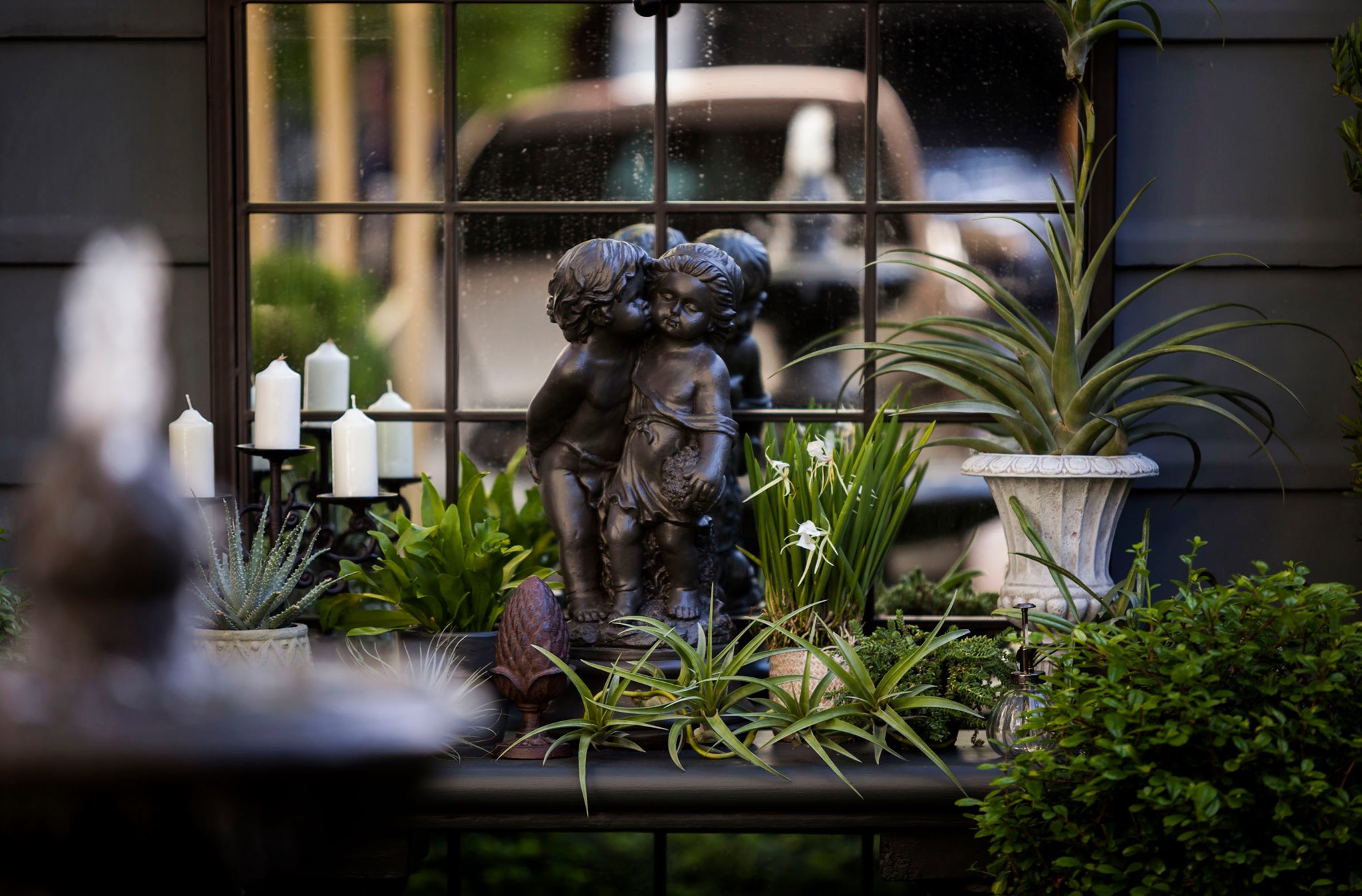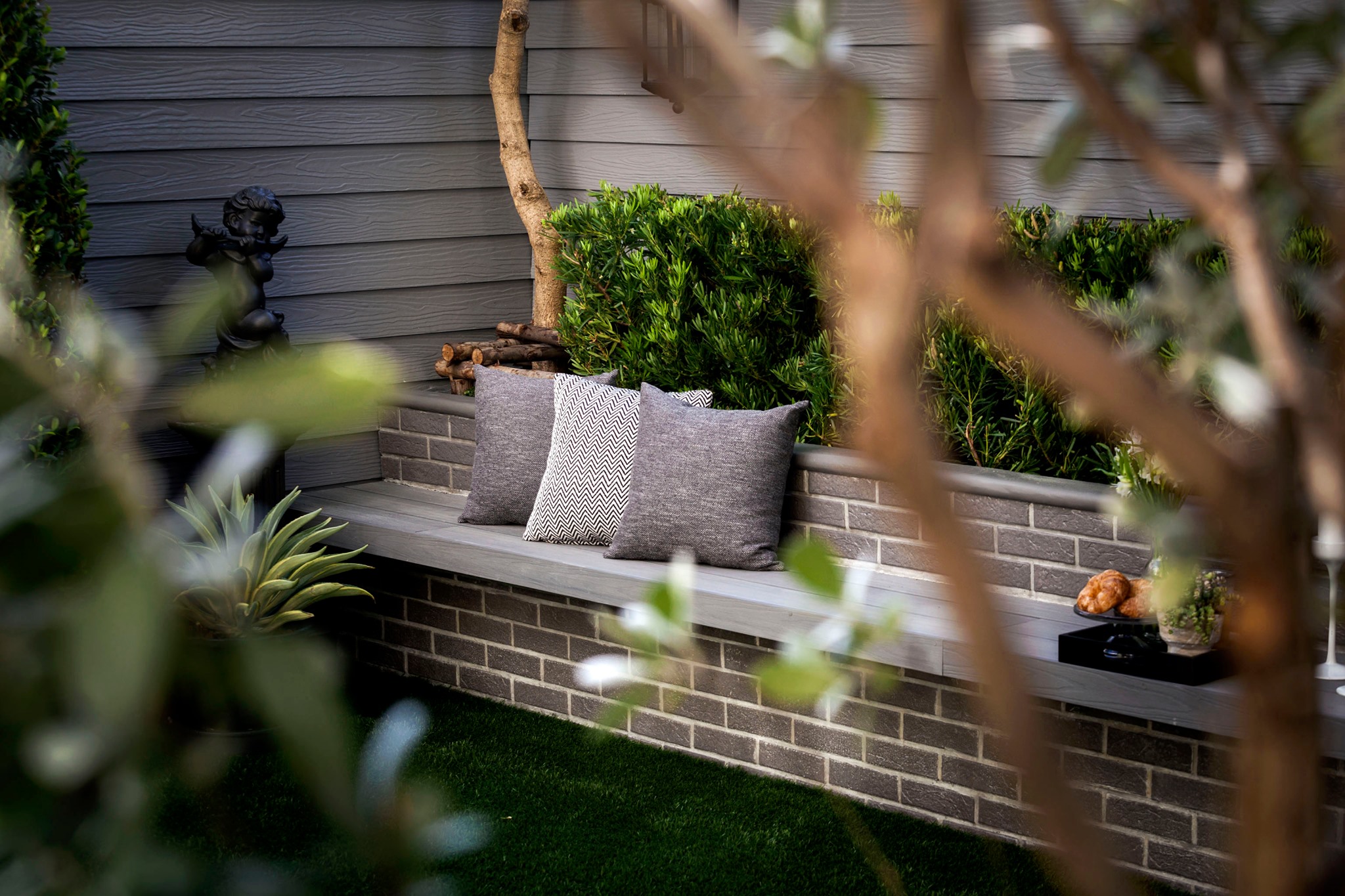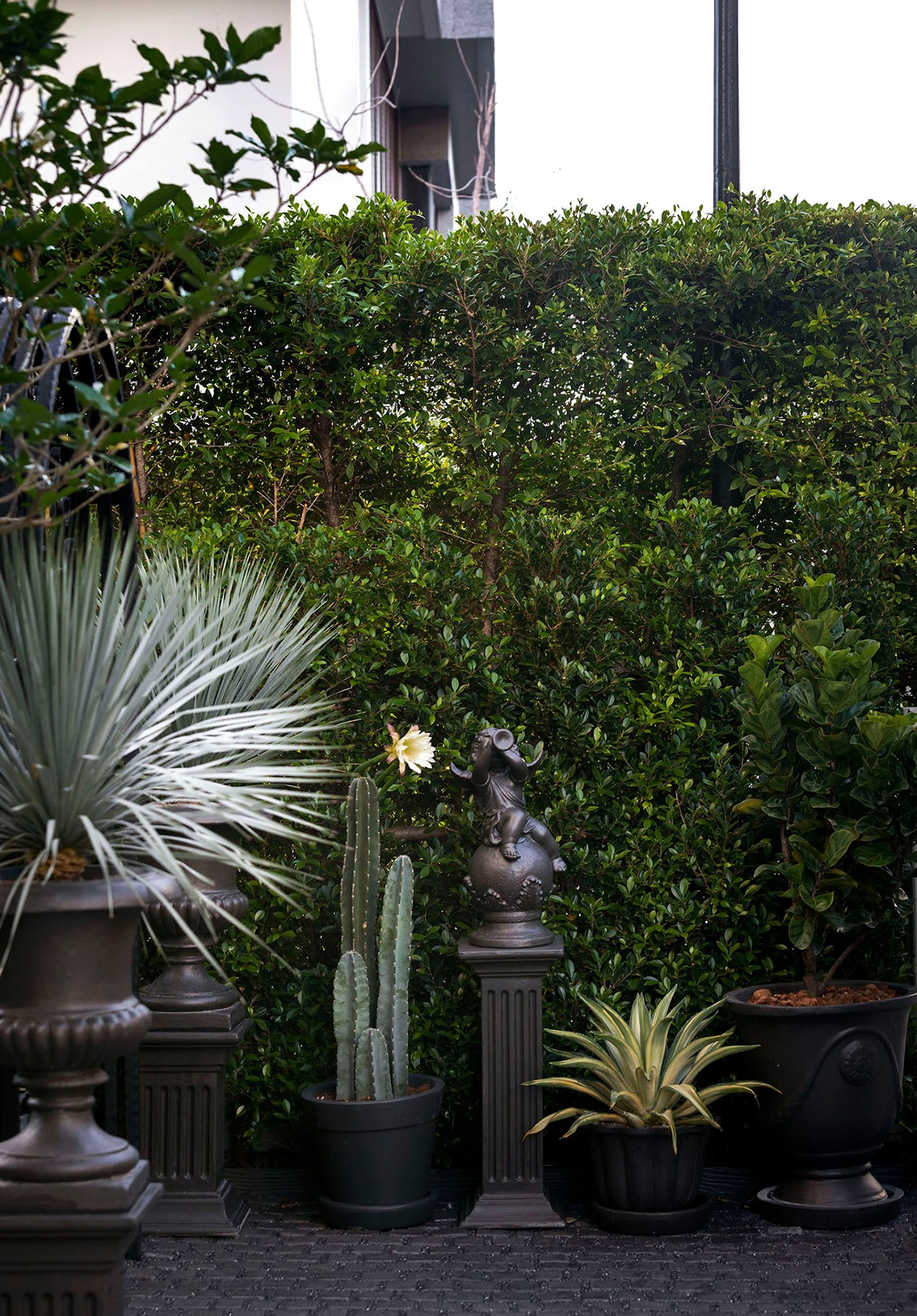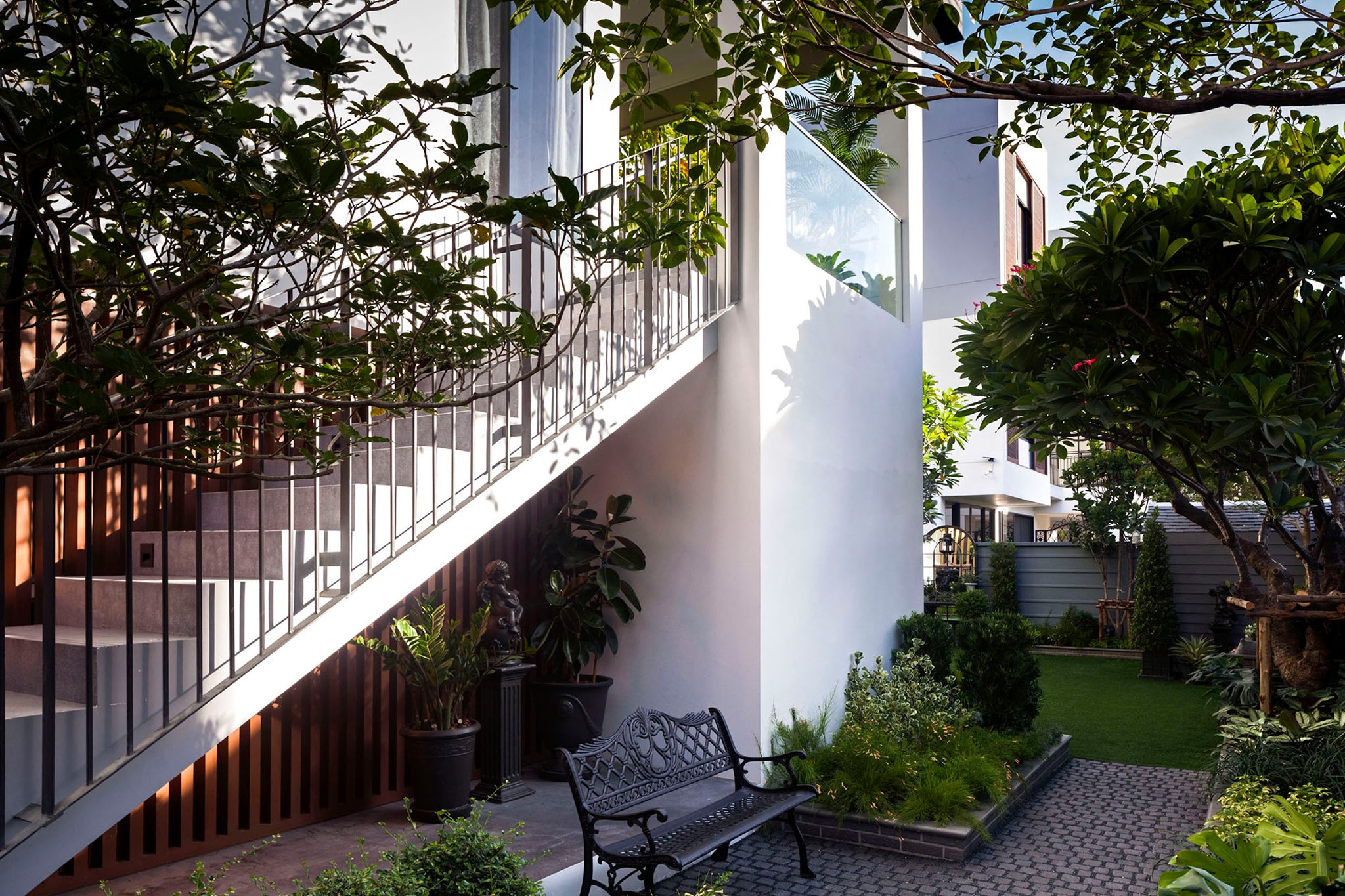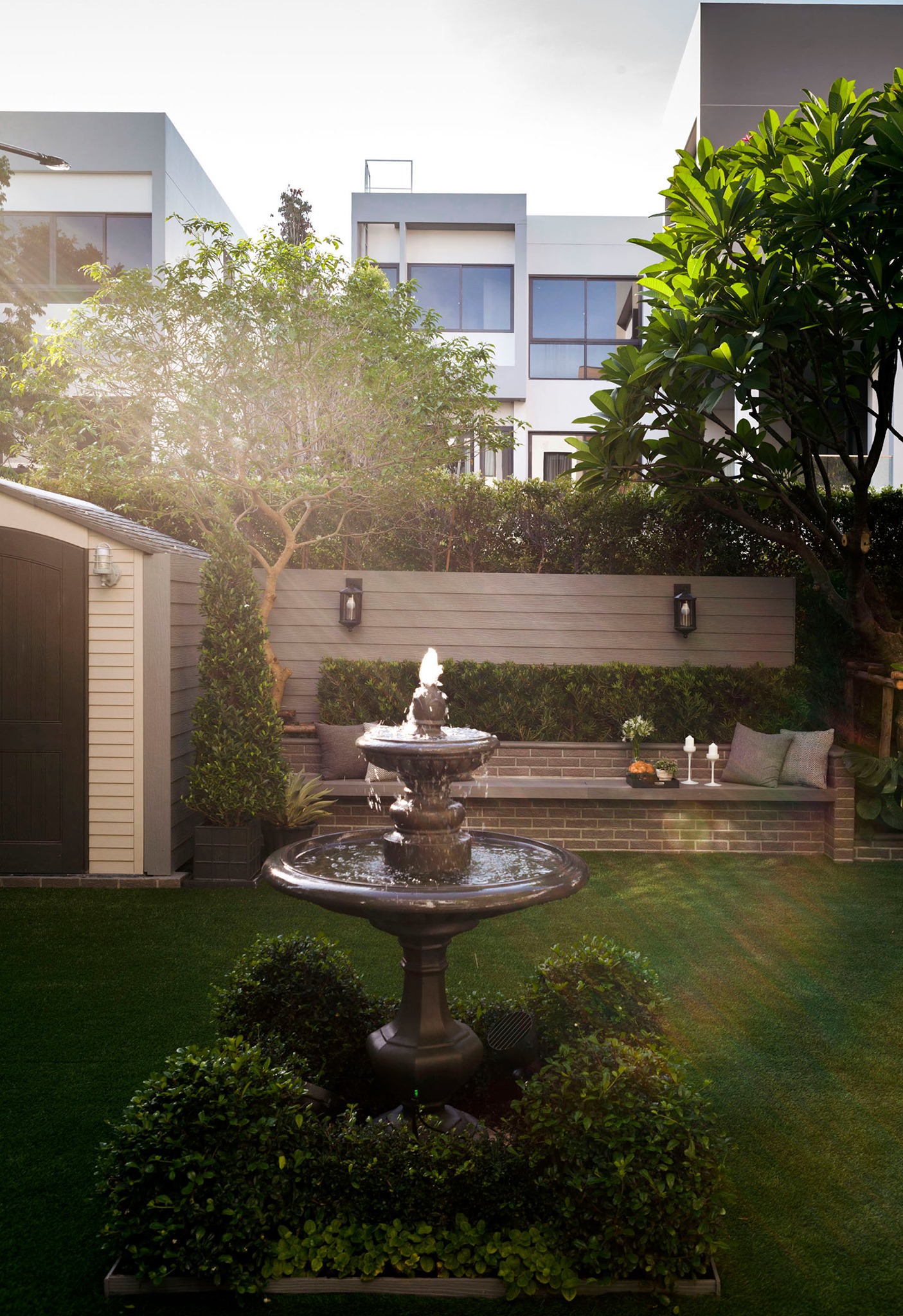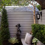 ขอขอบคุณพี่จั๊มที่ไว้ใจให้ Shabby Chic Gardens ได้ออกแบบสวนและดูแลในส่วนของงาน Consult และงาน Soft scape ของสวนแห่งนี้ สวนแห่งนี้เป็นการรีนูเวทสวนเพื่อให้ตอบสนองการใช้งานของเจ้าของบ้าน เนื่องจากพี่จั๊มได้ให้โจทย์ว่าสวนแรกที่จัดไว้ค่อนข้างครึ้มและทำความสะอาดกวาดค่อนข้างลำบาก เราจึงออกแบบเน้นการดูแลที่เรียบง่าย สะอาด เดินสะดวก จัดสรรพื้นที่ให้ได้เข้าใช้งานได้อย่างทั่วถึง รวมทั้งรองรับการใช้งานของทุกคนภายในครอบครัว ในสไตล์ของ Shabby Chic Gardens ที่เราถนัด มุมหน้าบ้านเราย้ายซุ้มประตูเหล็กชุดเดิมของเจ้าของบ้านขยับออกมา และทำรั้วเพิ่มสร้างเป็นจุดต้อนรับด้านหน้าของสวน วางกระถางปลูกต้นไม้ดูแลง่ายๆ รูปทรงเท่ห์ๆ เสริมด้วยตุ๊กตาตัวเดิมที่ทำสีใหม่กลายเป็นมุมต้อนรับแสนน่ารัก ทางเดินข้างบ้านนำสายตาไปยังสนามหญ้าด้านในบ้าน สองข้างทางก่อเป็นกระบะกรุอิฐเตี้ยๆ สำหรับปลูกต้นไม้ เว้นจังหวะปูพื้นเชื่อมต่อกับพื้นสเต็ปใต้บันได และวางเก้าอี้สนามเหล็กหล่อทำสีดำเพิ่มฟังก์ชั่นการใช้งาน สวนด้านในเปิดมุมมองด้วยสนามหญ้าเทียมสีเขียว ออกแบบให้มีที่นั่งเชื่อมต่อกับห้องเก็บของเดิมที่ถูกขยับปรับตำแหน่งเข้ามุมบ้านเพื่อเพิ่มพื้นที่ใช้งาน วางน้ำพุทำสีดำชุดเดิมที่มีในสวนเป็นจุดเด่นในโซนนี้ และมีจุดไฮไลเป็นกระจกเงาบานโค้งทรงคลาสสิกและโต๊ะปูนขากลึงที่สั่งทำโดยเฉพาะวางเป็น background สะท้อนเพิ่มมิติให้สวนดูเก๋ไก๋ไม่ซ้ำใคร ชานบ้านที่เชื่อมต่อมายังลานสวน ถูกเปลี่ยนพื้นไม้เทียมสีเดิมที่ชำรุดให้เป็นพื้นไม้เทียมสีเทาดูเข้ากันกับโทนสีโดยรวม และวางกระถางต้นไม้ทรงโมเดิร์นเก๋ๆ เพิ่มสีเขียวได้อย่างดี