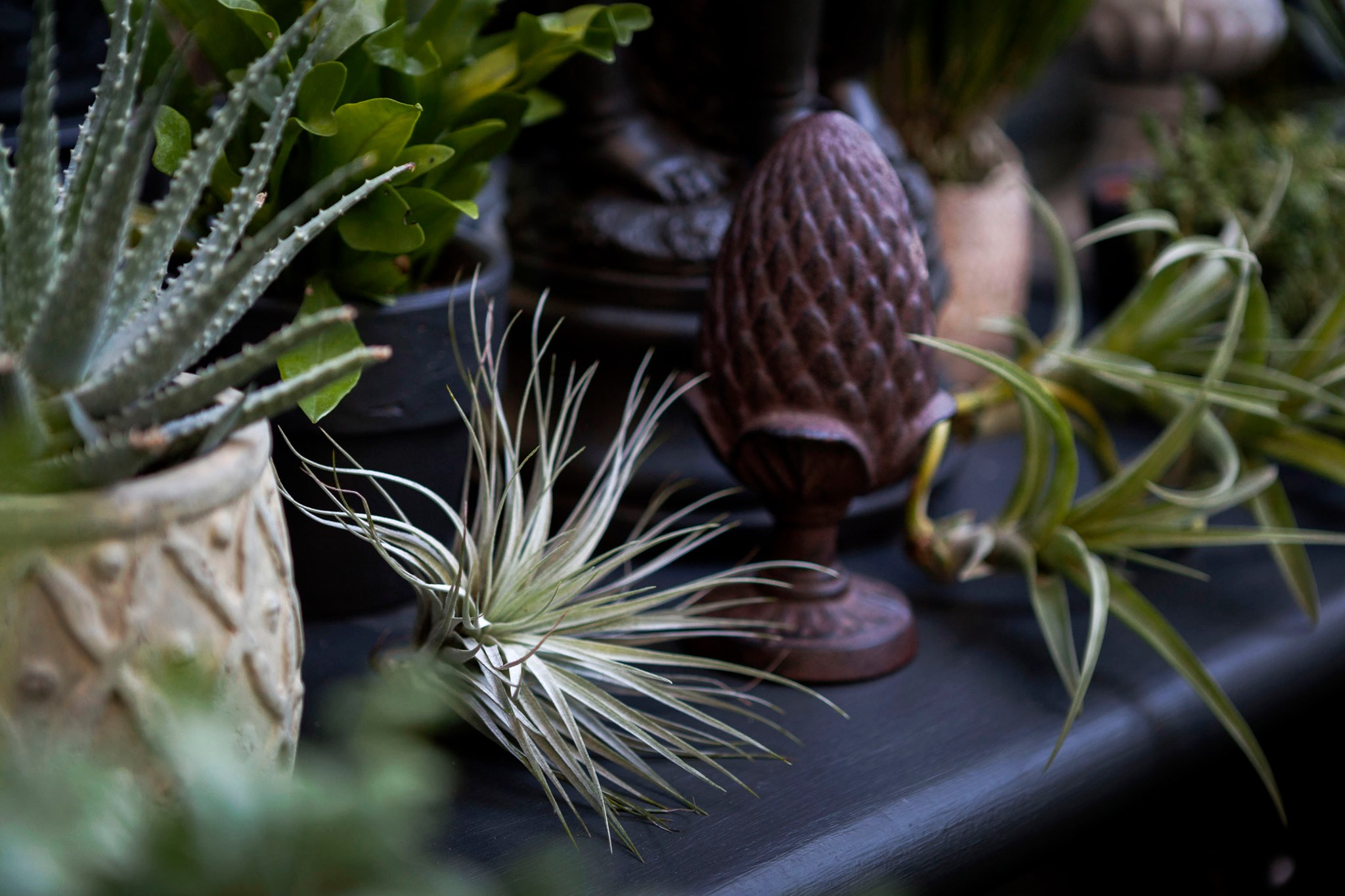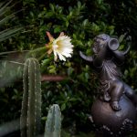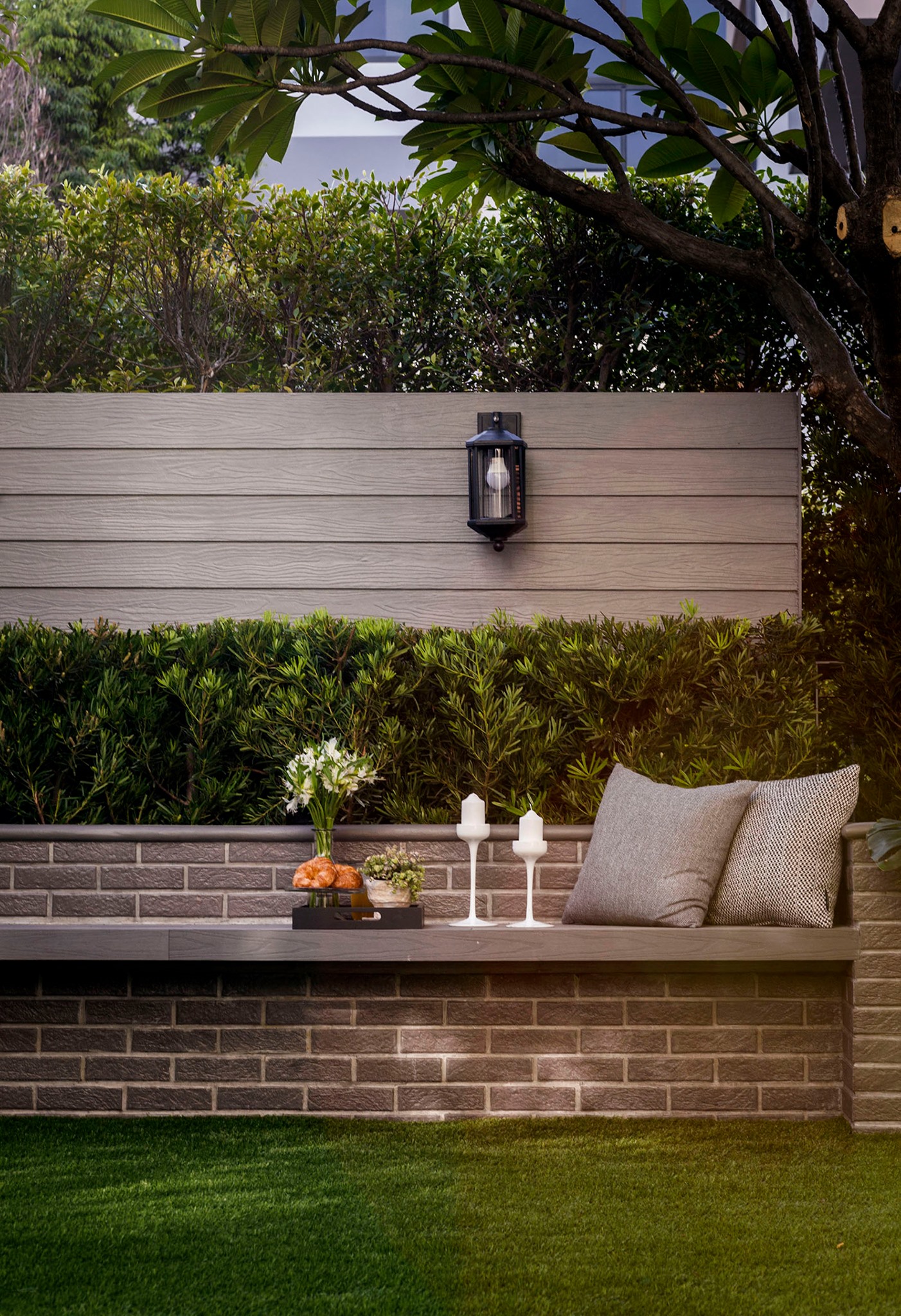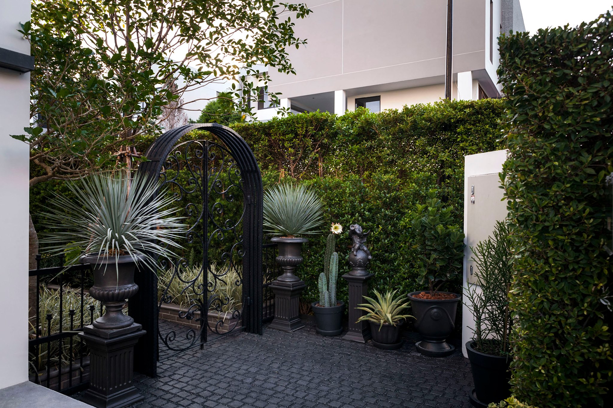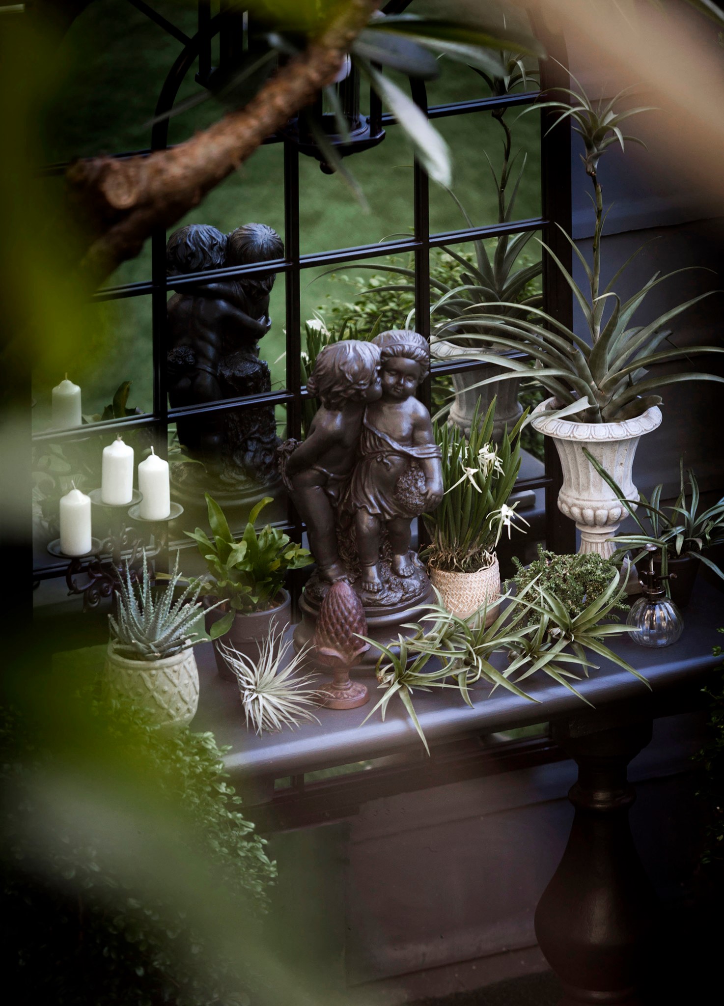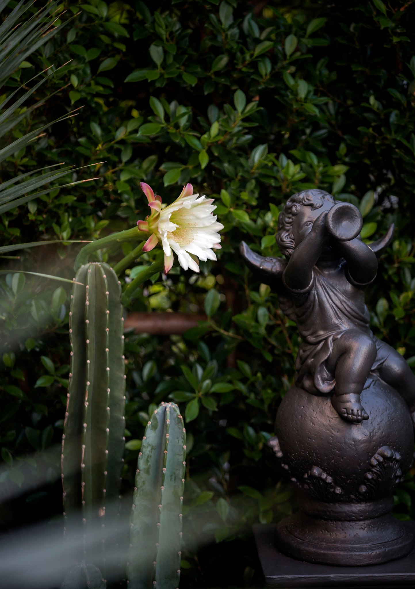 ขอขอบคุณพี่จั๊มที่ไว้ใจให้ Shabby Chic Gardens ได้ออกแบบสวนและดูแลในส่วนของงาน Consult และงาน Soft scape ของสวนแห่งนี้ สวนแห่งนี้เป็นการรีนูเวทสวนเพื่อให้ตอบสนองการใช้งานของเจ้าของบ้าน เนื่องจากพี่จั๊มได้ให้โจทย์ว่าสวนแรกที่จัดไว้ค่อนข้างครึ้มและทำความสะอาดกวาดค่อนข้างลำบาก เราจึงออกแบบเน้นการดูแลที่เรียบง่าย สะอาด เดินสะดวก จัดสรรพื้นที่ให้ได้เข้าใช้งานได้อย่างทั่วถึง รวมทั้งรองรับการใช้งานของทุกคนภายในครอบครัว ในสไตล์ของ Shabby Chic Gardens ที่เราถนัด มุมหน้าบ้านเราย้ายซุ้มประตูเหล็กชุดเดิมของเจ้าของบ้านขยับออกมา และทำรั้วเพิ่มสร้างเป็นจุดต้อนรับด้านหน้าของสวน วางกระถางปลูกต้นไม้ดูแลง่ายๆ รูปทรงเท่ห์ๆ เสริมด้วยตุ๊กตาตัวเดิมที่ทำสีใหม่กลายเป็นมุมต้อนรับแสนน่ารัก ทางเดินข้างบ้านนำสายตาไปยังสนามหญ้าด้านในบ้าน สองข้างทางก่อเป็นกระบะกรุอิฐเตี้ยๆ สำหรับปลูกต้นไม้ เว้นจังหวะปูพื้นเชื่อมต่อกับพื้นสเต็ปใต้บันได และวางเก้าอี้สนามเหล็กหล่อทำสีดำเพิ่มฟังก์ชั่นการใช้งาน สวนด้านในเปิดมุมมองด้วยสนามหญ้าเทียมสีเขียว ออกแบบให้มีที่นั่งเชื่อมต่อกับห้องเก็บของเดิมที่ถูกขยับปรับตำแหน่งเข้ามุมบ้านเพื่อเพิ่มพื้นที่ใช้งาน วางน้ำพุทำสีดำชุดเดิมที่มีในสวนเป็นจุดเด่นในโซนนี้ และมีจุดไฮไลเป็นกระจกเงาบานโค้งทรงคลาสสิกและโต๊ะปูนขากลึงที่สั่งทำโดยเฉพาะวางเป็น background สะท้อนเพิ่มมิติให้สวนดูเก๋ไก๋ไม่ซ้ำใคร ชานบ้านที่เชื่อมต่อมายังลานสวน ถูกเปลี่ยนพื้นไม้เทียมสีเดิมที่ชำรุดให้เป็นพื้นไม้เทียมสีเทาดูเข้ากันกับโทนสีโดยรวม และวางกระถางต้นไม้ทรงโมเดิร์นเก๋ๆ เพิ่มสีเขียวได้อย่างดี