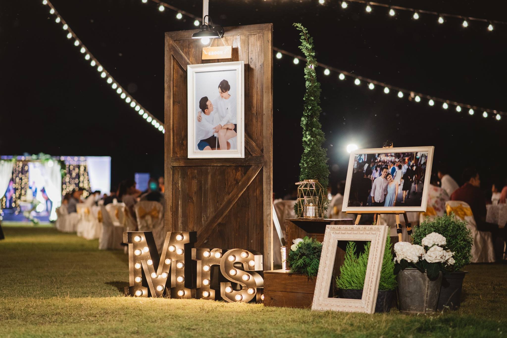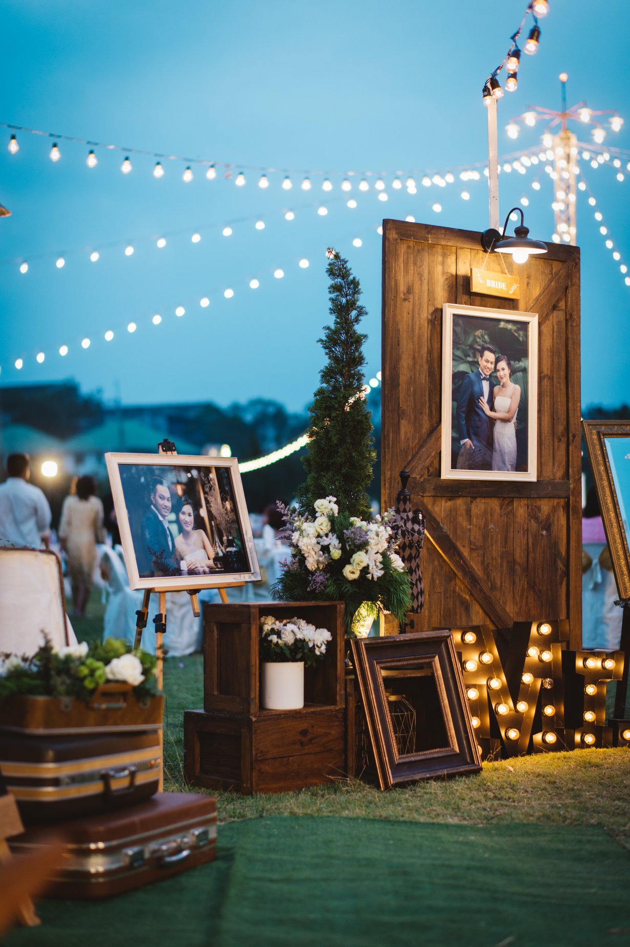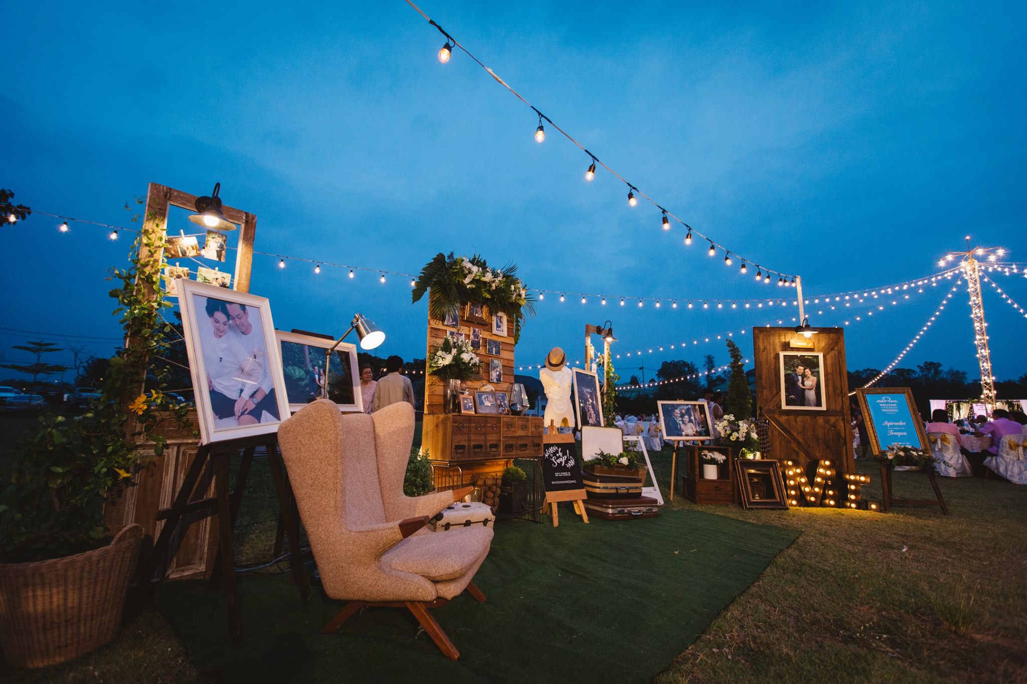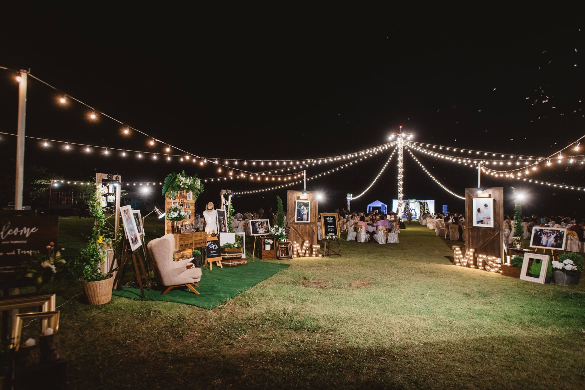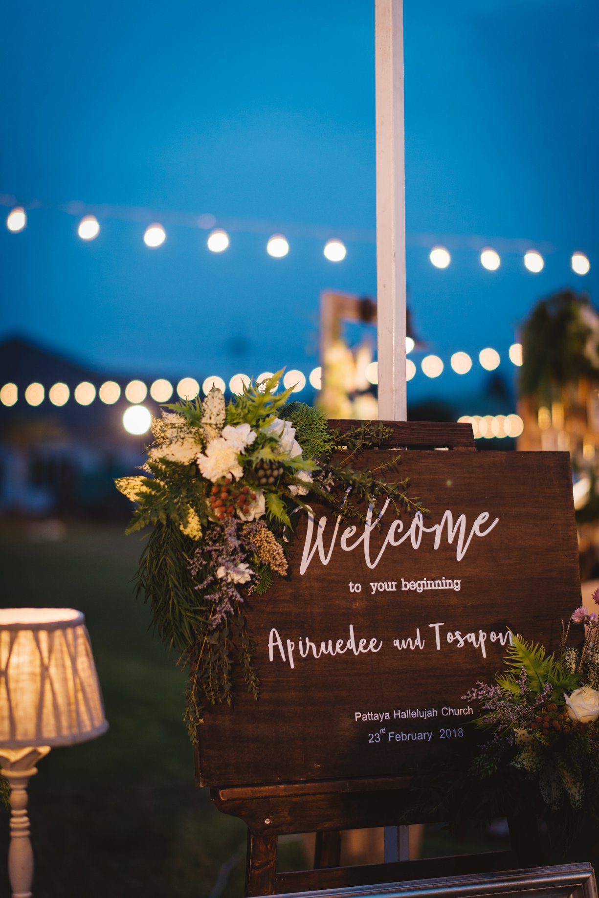 ขอขอบคุณคุณแคทและคุณคุณที่ไว้ใจทีม Shabby Chic Gardens ให้ได้ดูแลตกแต่งสถานที่จัดเลี่ยง งานนี้จัดกันที่อ.บางละมุง จ.ชลบุรี ท่ามกลางความเสี่ยงของพายุฝนกันเลยทีเดียว เพราะบริเวณที่จัดเลี้ยงอยู่กลางสนามฟุตบอลด้านหน้าของโบสถ์คริสที่สวยงาม เช้าวันจัดงานฝนกระหน่ำลงมาอย่างหนักก่อนจะซาไปในช่วงสายทำให้สนามหญ้าเดินได้แบบชุ่มๆ นุ่มเท้า แดดจึงไม่มีเท่าไหร่ ทำให้ดอกไม้สดที่ใช้ดูสดชื่นเหมื่อนกันคู่บ่าวสาวในวันนี้ของเราเลยค่ะ งานเป็นแบบโต๊ะจีน ทีมงานแบบสบายๆ ตามสไตล์ shabby chic gardens เรารันงานกันทั้งวันก่อนจะเสร็จสมบูรณ์ในช่วงก่อนงานในช่วงค่ำ แสงไฟปิงปองสวยนวลเข้ากับบรรยากาศงานตกแต่งแบบกลางแจ้งเป็นที่สุด งานนี้นอกจากบ่าวสาวแล้วต้องขอบคุณเพื่อนโอ Watcharain Boonprakob ช่างภาพมือฉมังที่ชักชวนให้เราได้ไปร่วมงานดีๆ แบบนี้ และยังใจดีเก็บภาพมาแบ่งปันกันด้วยนะคะ ไปชมกันเลยค่ะ