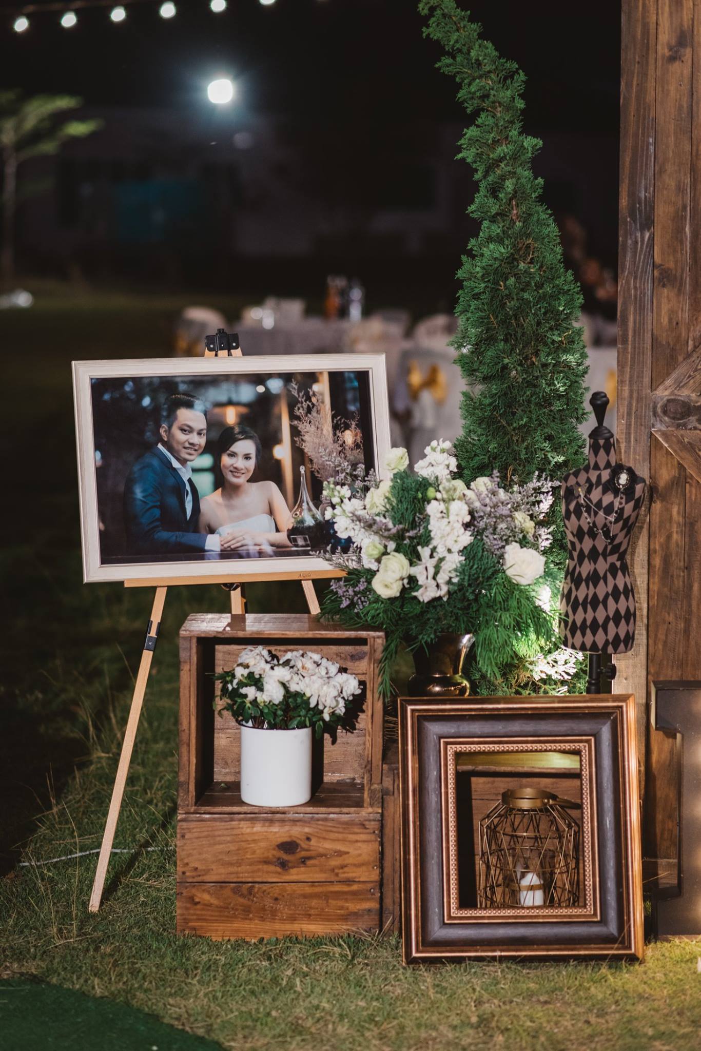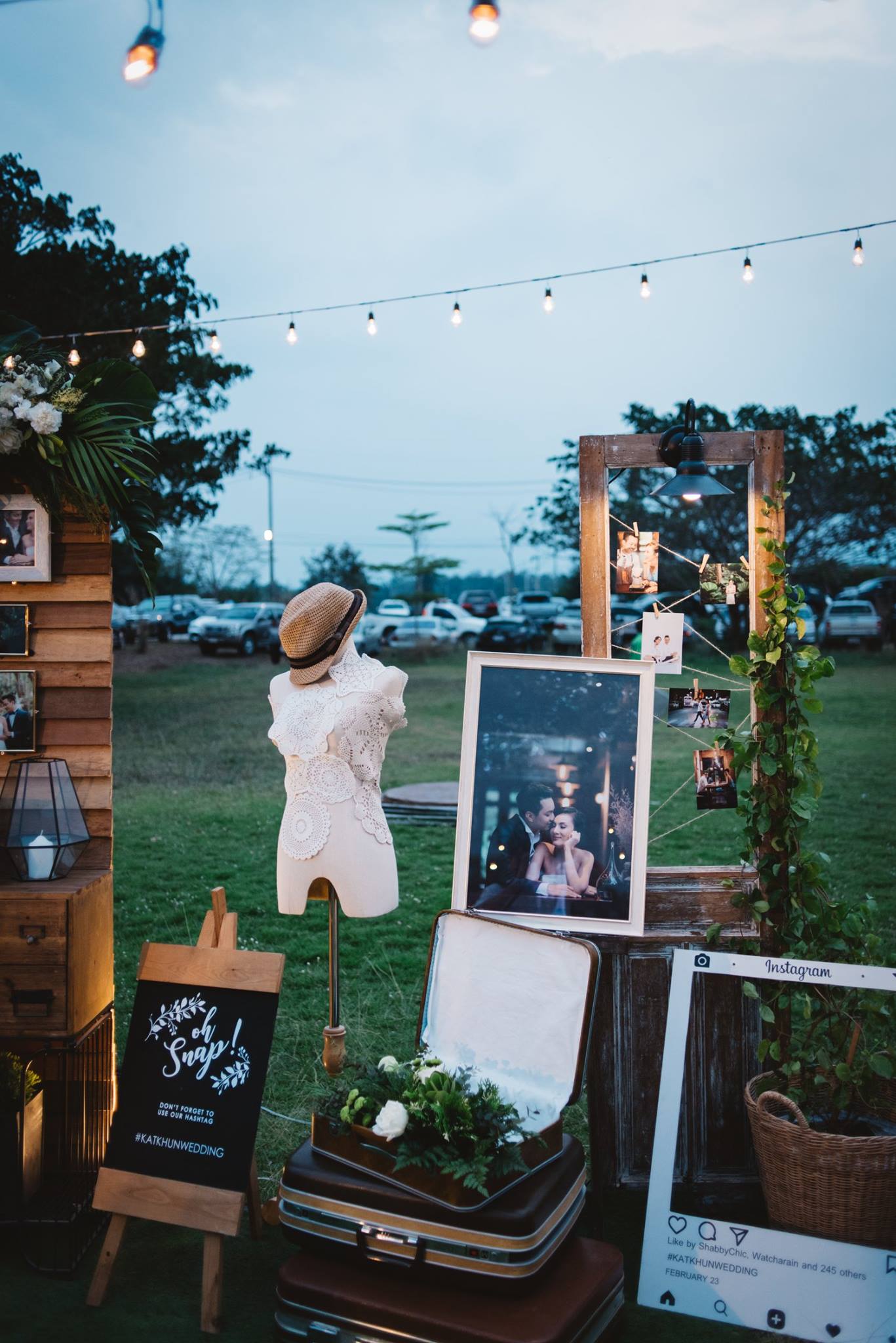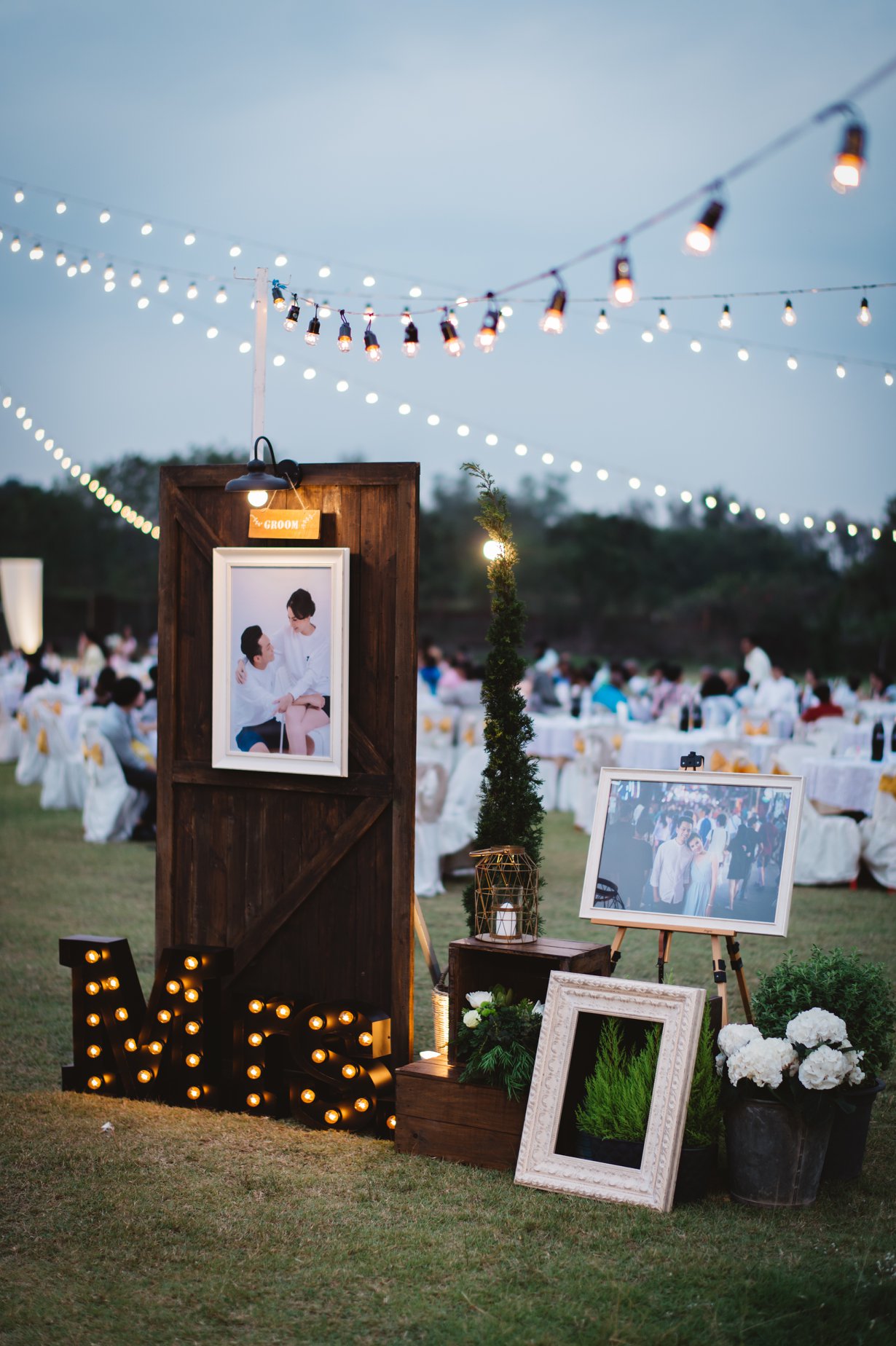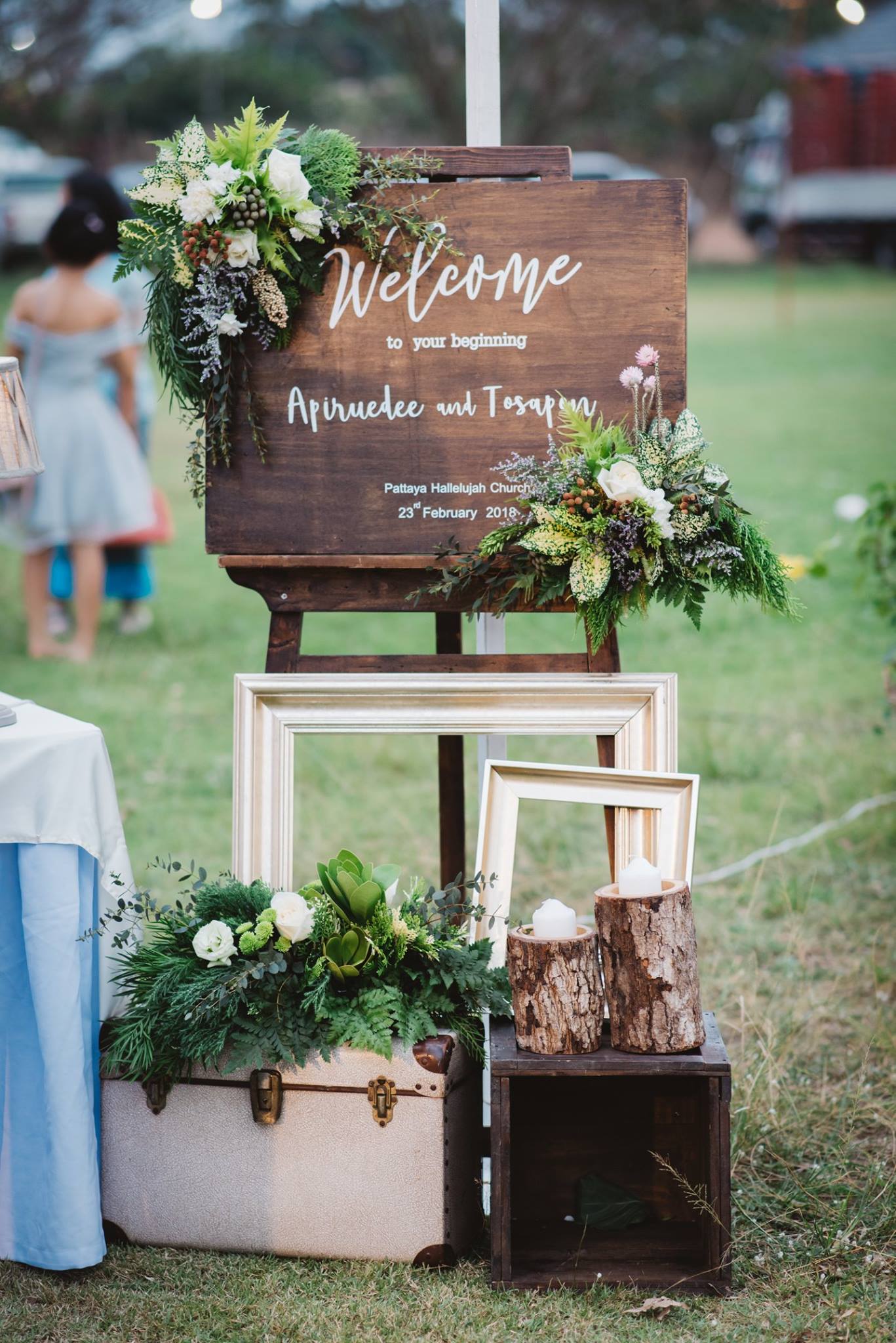 ขอขอบคุณคุณแคทและคุณคุณที่ไว้ใจทีม Shabby Chic Gardens ให้ได้ดูแลตกแต่งสถานที่จัดเลี่ยง งานนี้จัดกันที่อ.บางละมุง จ.ชลบุรี ท่ามกลางความเสี่ยงของพายุฝนกันเลยทีเดียว เพราะบริเวณที่จัดเลี้ยงอยู่กลางสนามฟุตบอลด้านหน้าของโบสถ์คริสที่สวยงาม เช้าวันจัดงานฝนกระหน่ำลงมาอย่างหนักก่อนจะซาไปในช่วงสายทำให้สนามหญ้าเดินได้แบบชุ่มๆ นุ่มเท้า แดดจึงไม่มีเท่าไหร่ ทำให้ดอกไม้สดที่ใช้ดูสดชื่นเหมื่อนกันคู่บ่าวสาวในวันนี้ของเราเลยค่ะ งานเป็นแบบโต๊ะจีน ทีมงานแบบสบายๆ ตามสไตล์ shabby chic gardens เรารันงานกันทั้งวันก่อนจะเสร็จสมบูรณ์ในช่วงก่อนงานในช่วงค่ำ แสงไฟปิงปองสวยนวลเข้ากับบรรยากาศงานตกแต่งแบบกลางแจ้งเป็นที่สุด งานนี้นอกจากบ่าวสาวแล้วต้องขอบคุณเพื่อนโอ Watcharain Boonprakob ช่างภาพมือฉมังที่ชักชวนให้เราได้ไปร่วมงานดีๆ แบบนี้ และยังใจดีเก็บภาพมาแบ่งปันกันด้วยนะคะ ไปชมกันเลยค่ะ