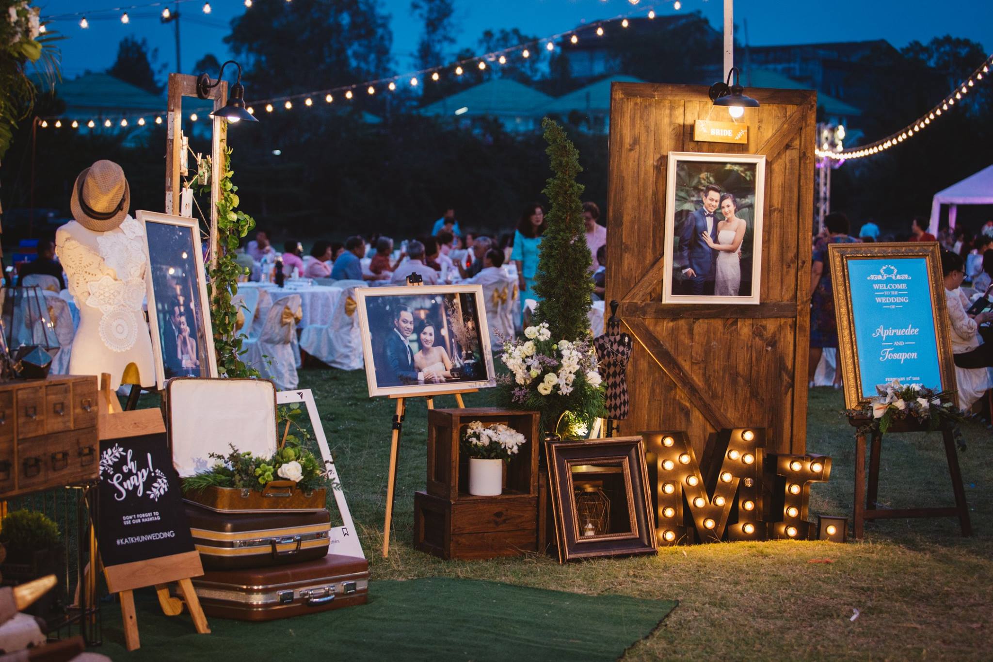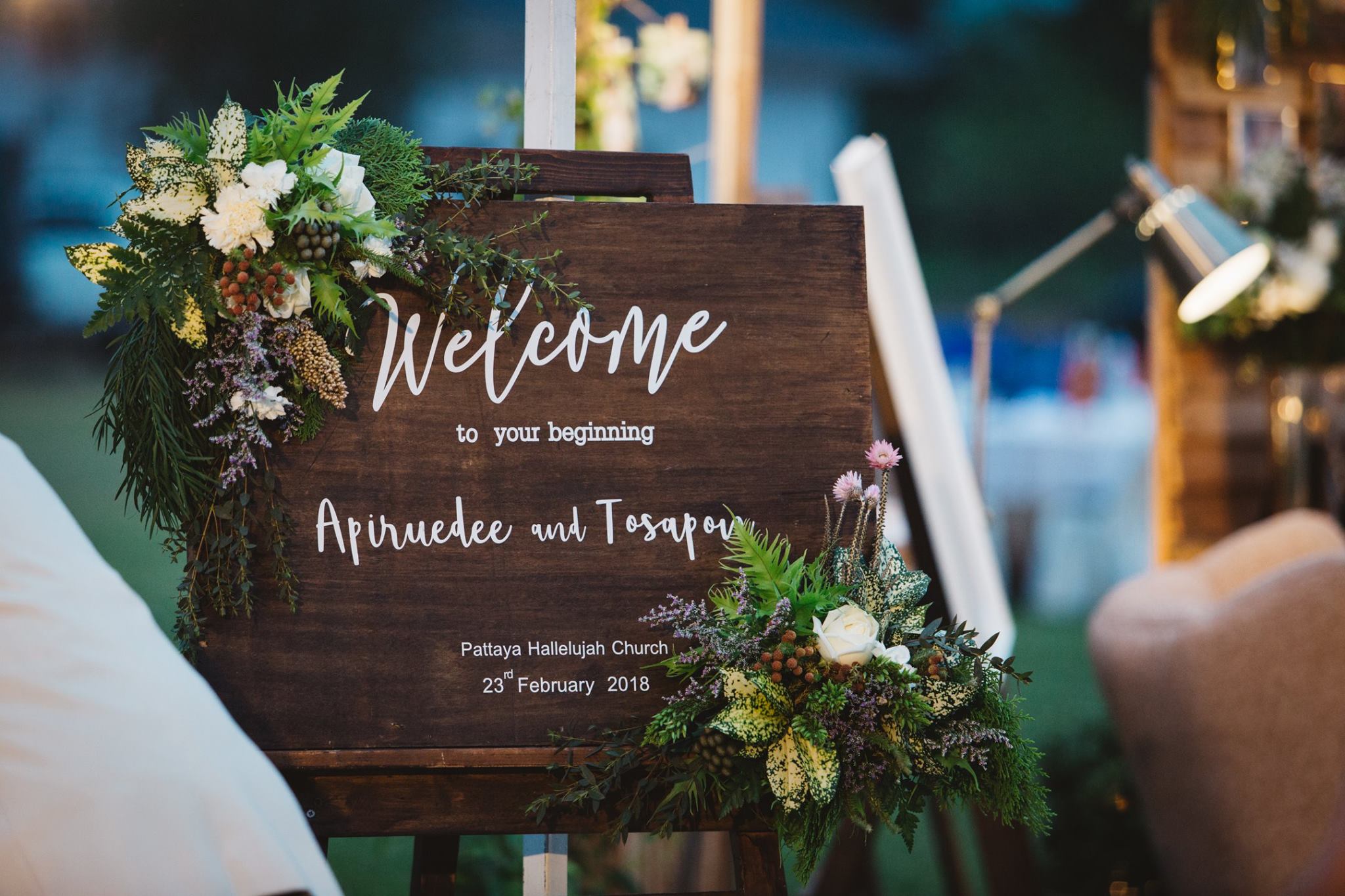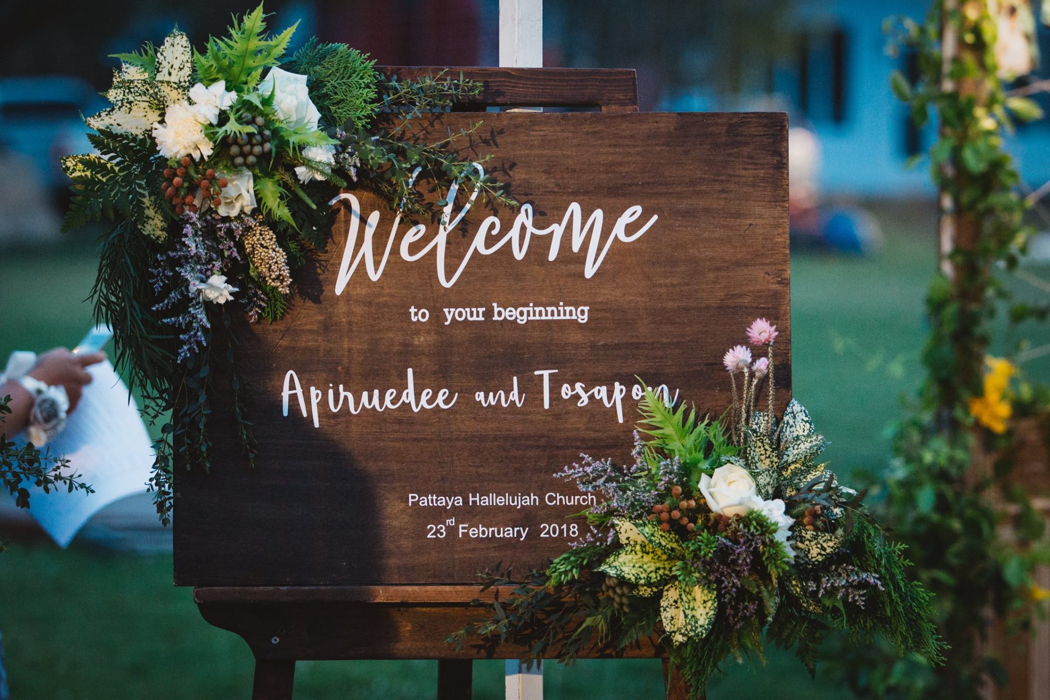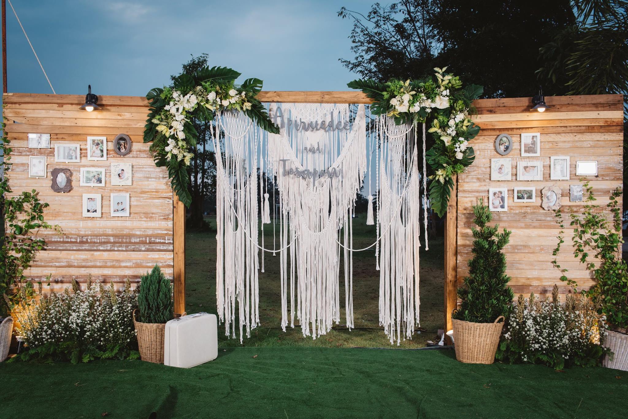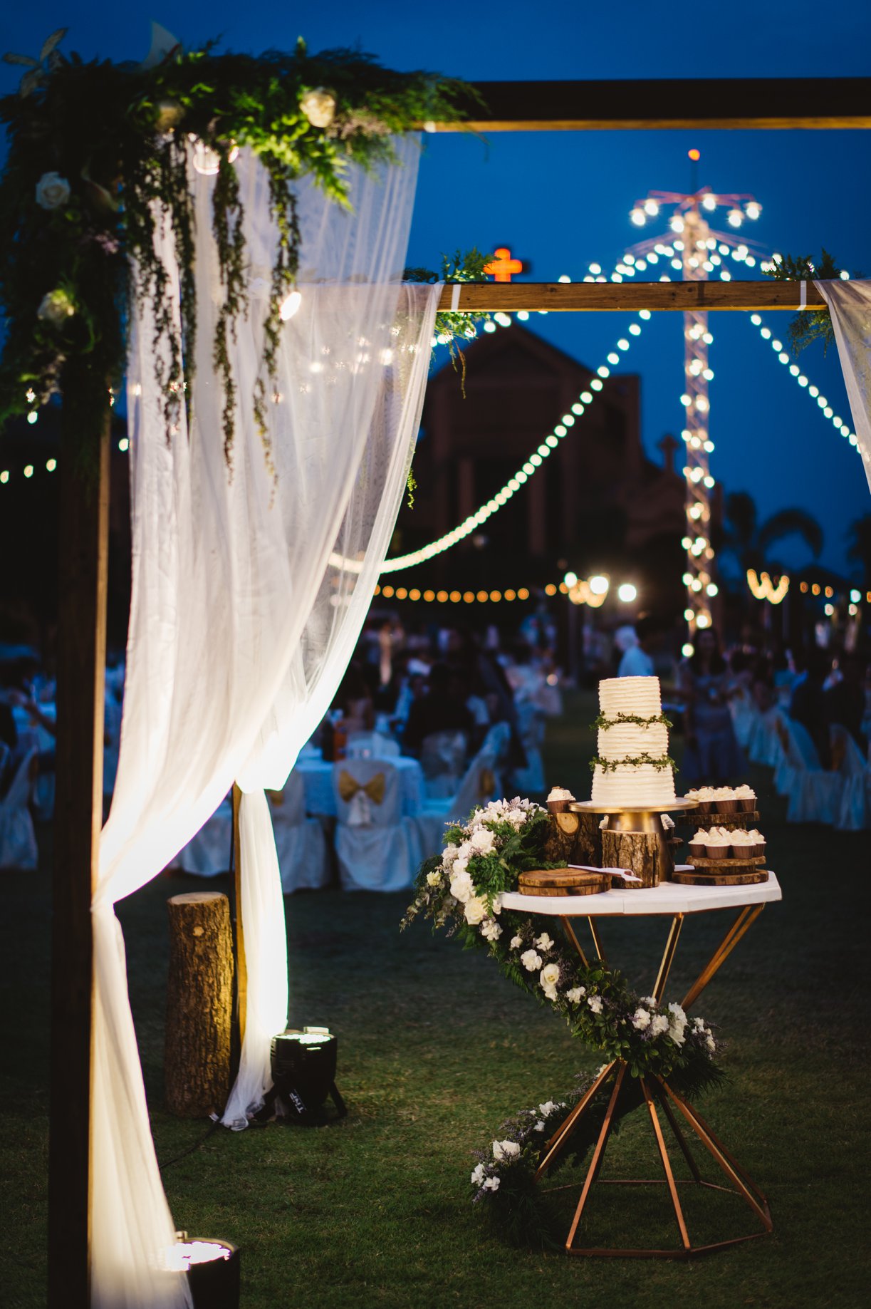 ขอขอบคุณคุณแคทและคุณคุณที่ไว้ใจทีม Shabby Chic Gardens ให้ได้ดูแลตกแต่งสถานที่จัดเลี่ยง งานนี้จัดกันที่อ.บางละมุง จ.ชลบุรี ท่ามกลางความเสี่ยงของพายุฝนกันเลยทีเดียว เพราะบริเวณที่จัดเลี้ยงอยู่กลางสนามฟุตบอลด้านหน้าของโบสถ์คริสที่สวยงาม เช้าวันจัดงานฝนกระหน่ำลงมาอย่างหนักก่อนจะซาไปในช่วงสายทำให้สนามหญ้าเดินได้แบบชุ่มๆ นุ่มเท้า แดดจึงไม่มีเท่าไหร่ ทำให้ดอกไม้สดที่ใช้ดูสดชื่นเหมื่อนกันคู่บ่าวสาวในวันนี้ของเราเลยค่ะ งานเป็นแบบโต๊ะจีน ทีมงานแบบสบายๆ ตามสไตล์ shabby chic gardens เรารันงานกันทั้งวันก่อนจะเสร็จสมบูรณ์ในช่วงก่อนงานในช่วงค่ำ แสงไฟปิงปองสวยนวลเข้ากับบรรยากาศงานตกแต่งแบบกลางแจ้งเป็นที่สุด งานนี้นอกจากบ่าวสาวแล้วต้องขอบคุณเพื่อนโอ Watcharain Boonprakob ช่างภาพมือฉมังที่ชักชวนให้เราได้ไปร่วมงานดีๆ แบบนี้ และยังใจดีเก็บภาพมาแบ่งปันกันด้วยนะคะ ไปชมกันเลยค่ะ