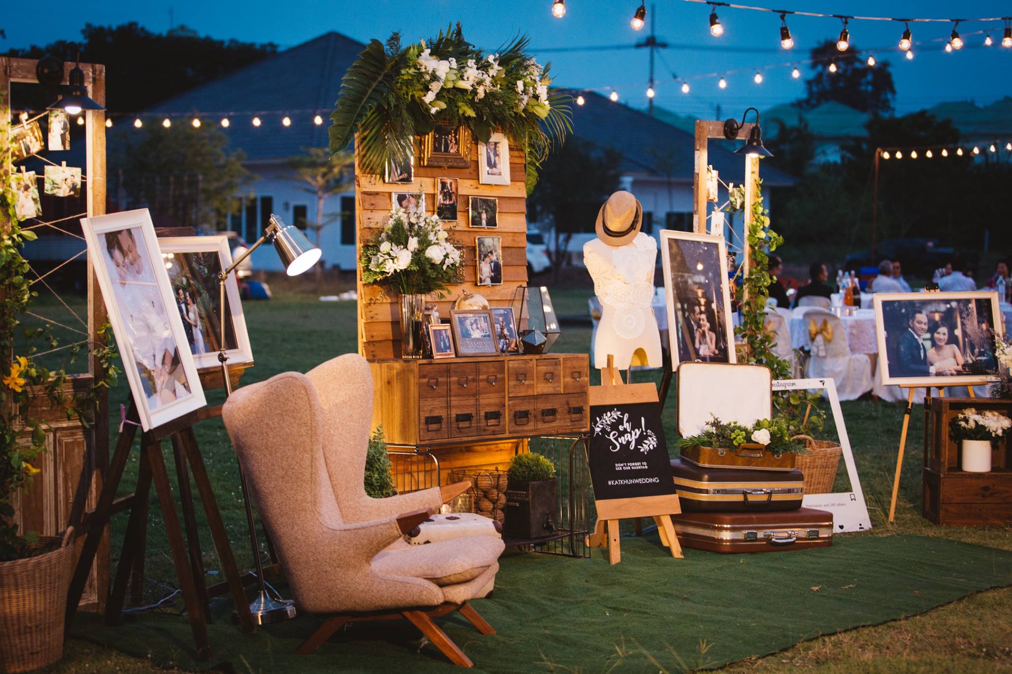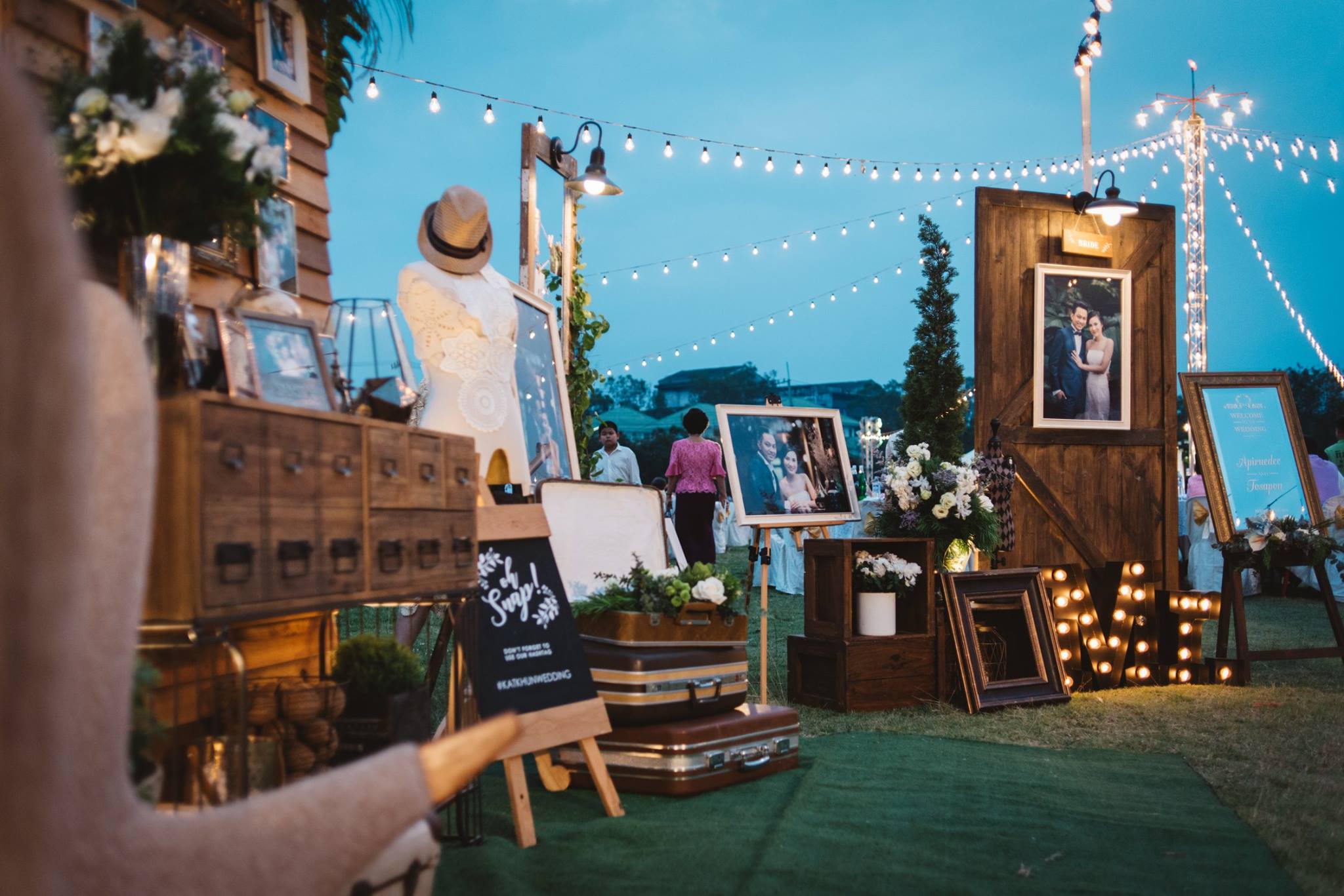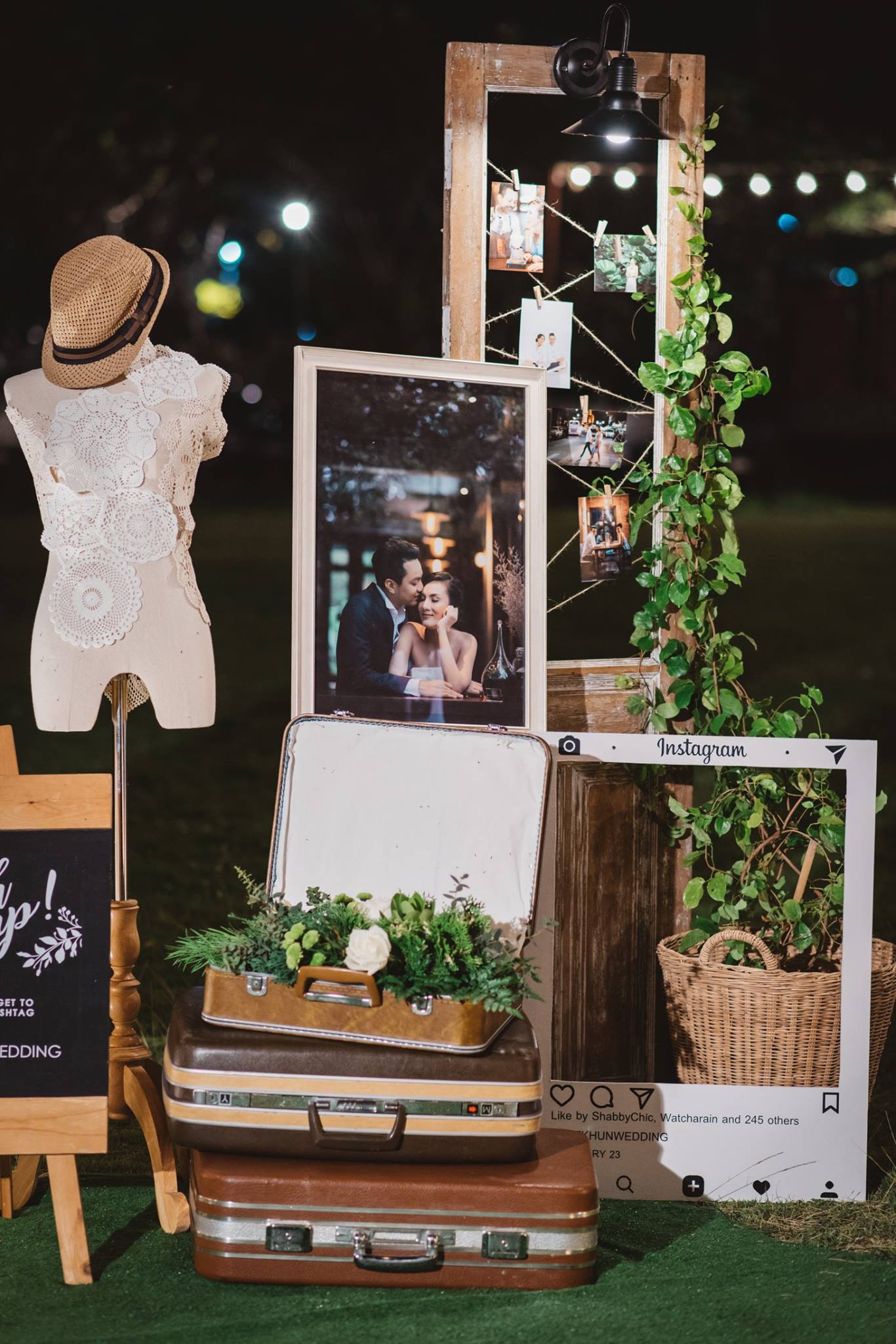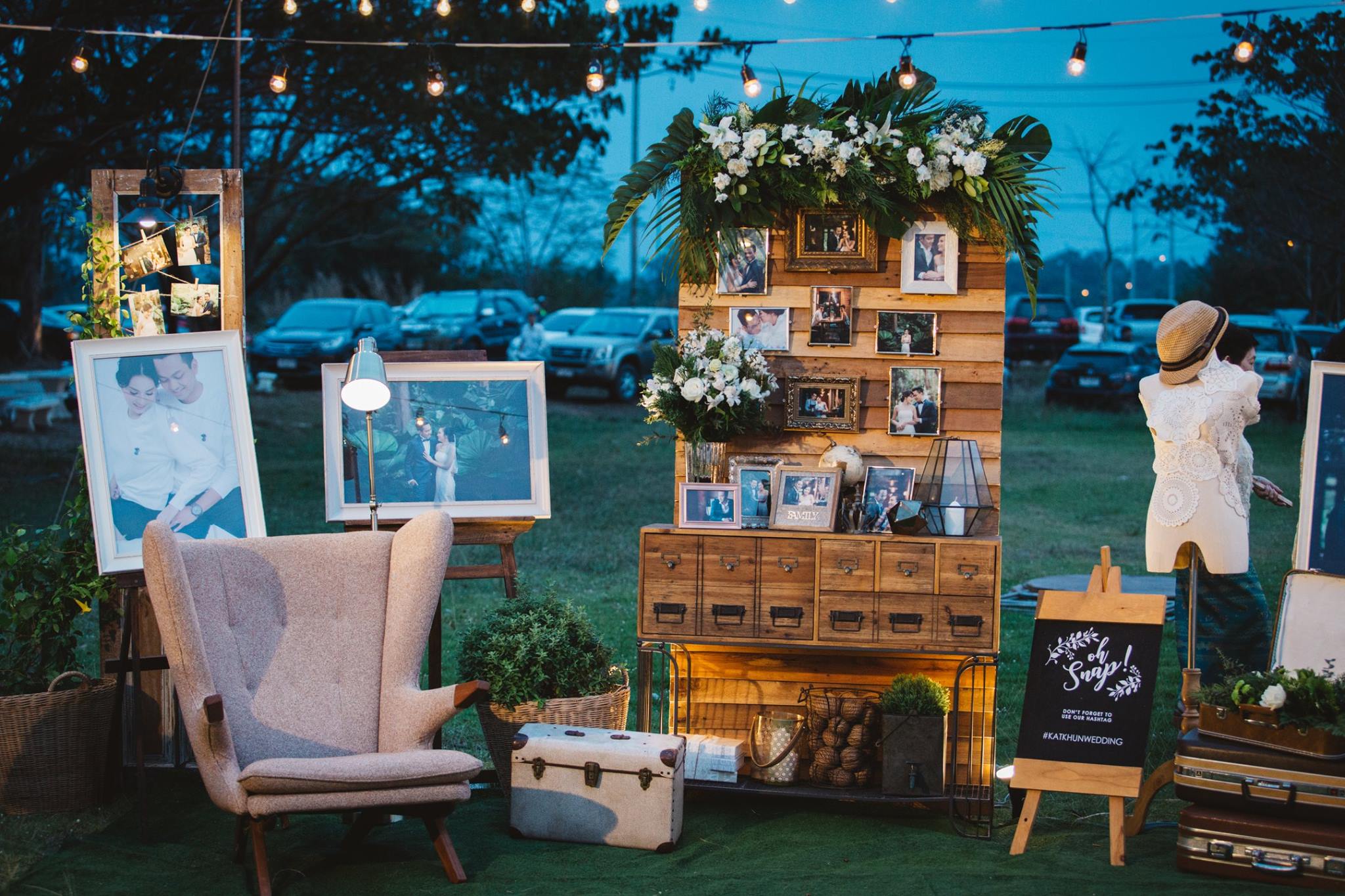 ขอขอบคุณคุณแคทและคุณคุณที่ไว้ใจทีม Shabby Chic Gardens ให้ได้ดูแลตกแต่งสถานที่จัดเลี่ยง งานนี้จัดกันที่อ.บางละมุง จ.ชลบุรี ท่ามกลางความเสี่ยงของพายุฝนกันเลยทีเดียว เพราะบริเวณที่จัดเลี้ยงอยู่กลางสนามฟุตบอลด้านหน้าของโบสถ์คริสที่สวยงาม เช้าวันจัดงานฝนกระหน่ำลงมาอย่างหนักก่อนจะซาไปในช่วงสายทำให้สนามหญ้าเดินได้แบบชุ่มๆ นุ่มเท้า แดดจึงไม่มีเท่าไหร่ ทำให้ดอกไม้สดที่ใช้ดูสดชื่นเหมื่อนกันคู่บ่าวสาวในวันนี้ของเราเลยค่ะ งานเป็นแบบโต๊ะจีน ทีมงานแบบสบายๆ ตามสไตล์ shabby chic gardens เรารันงานกันทั้งวันก่อนจะเสร็จสมบูรณ์ในช่วงก่อนงานในช่วงค่ำ แสงไฟปิงปองสวยนวลเข้ากับบรรยากาศงานตกแต่งแบบกลางแจ้งเป็นที่สุด งานนี้นอกจากบ่าวสาวแล้วต้องขอบคุณเพื่อนโอ Watcharain Boonprakob ช่างภาพมือฉมังที่ชักชวนให้เราได้ไปร่วมงานดีๆ แบบนี้ และยังใจดีเก็บภาพมาแบ่งปันกันด้วยนะคะ ไปชมกันเลยค่ะ