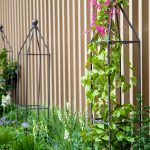 เพื่อไม่ให้สวนดูแบนเรียบจนเกินไป เราออกแบบให้ตรงกลางรับมุมมองด้วยซุ้มไม้เลื้อย 3 จุด ให้ต้นไม้เลื้อยดอกสวยอย่างพวงชมพูและอัญชันได้เกาะเกี่ยว สร้างพื้นที่สีเขียวในแนวตั้ได้เป็นอย่างดี