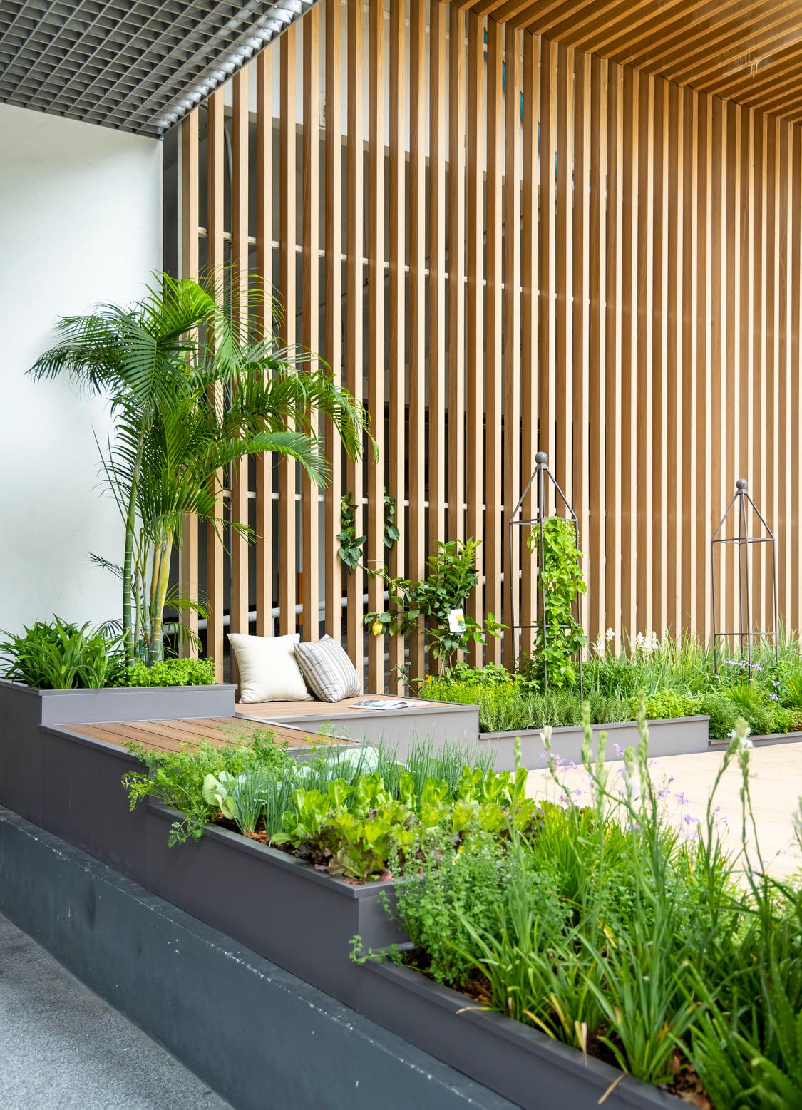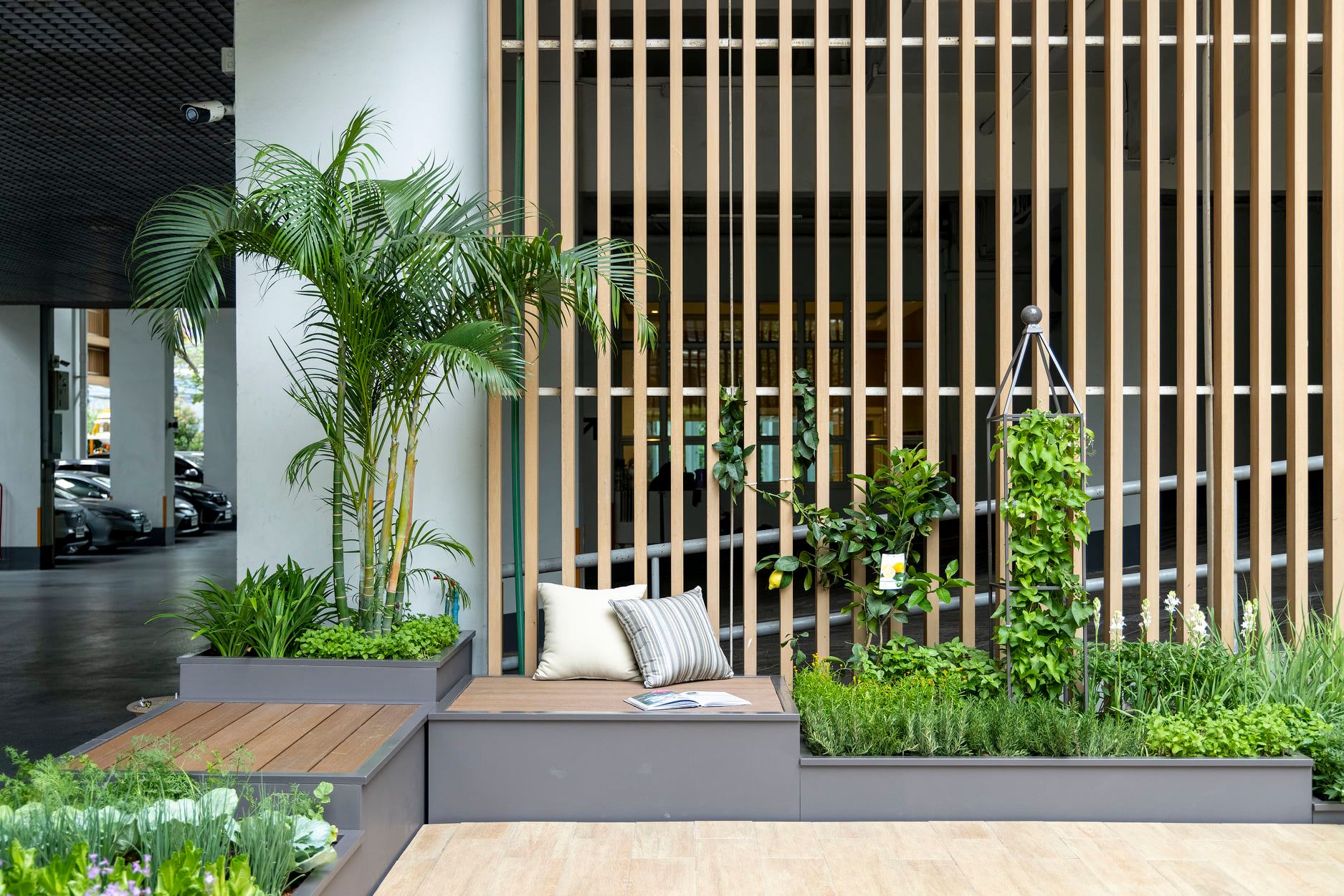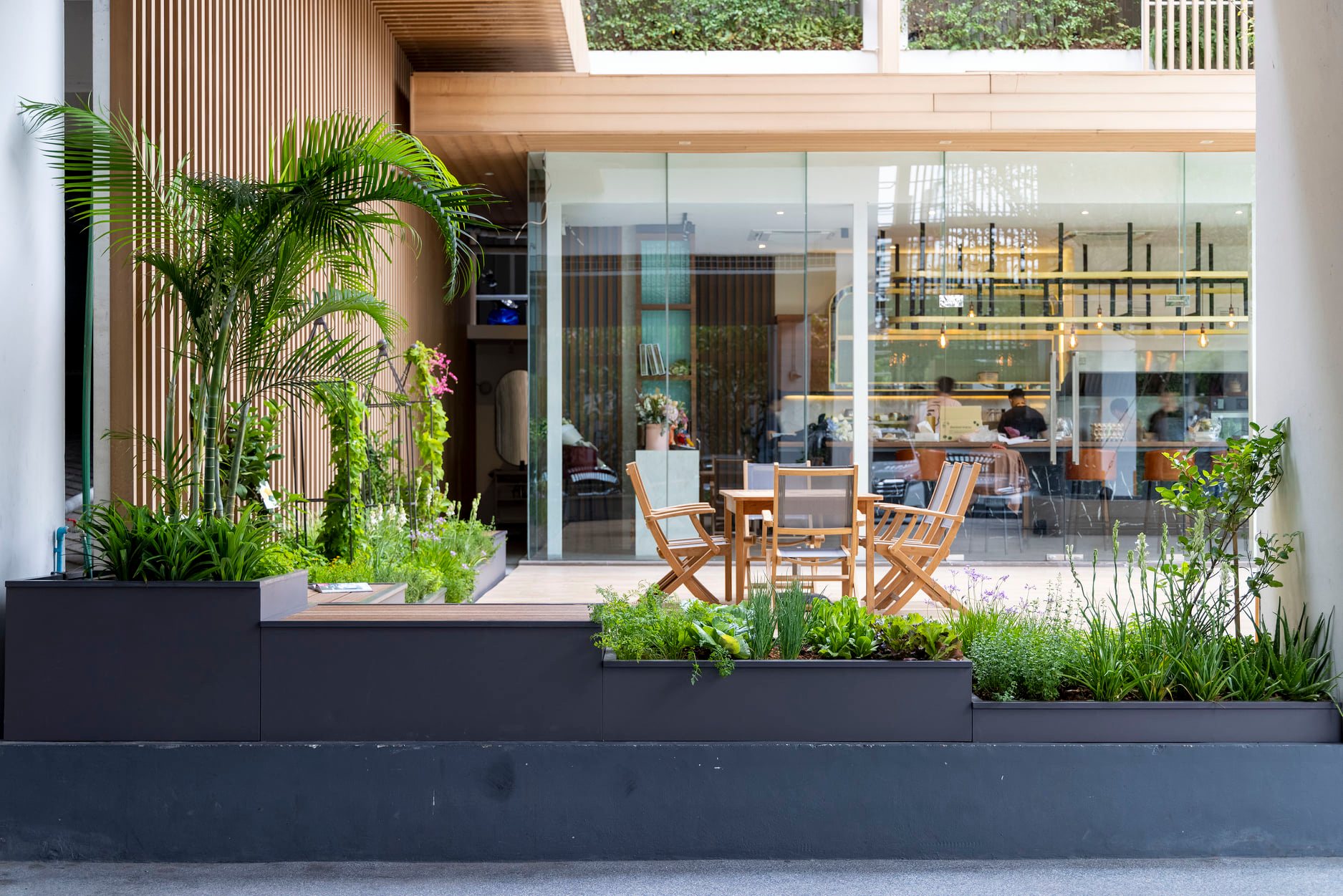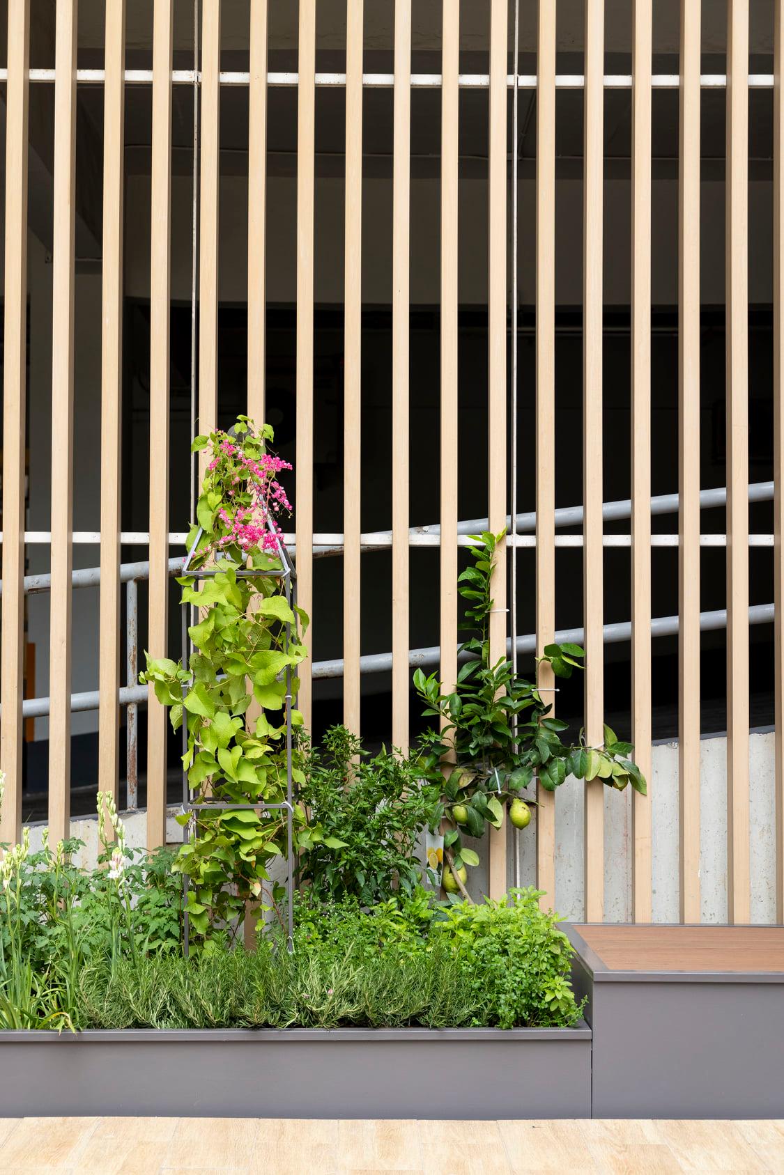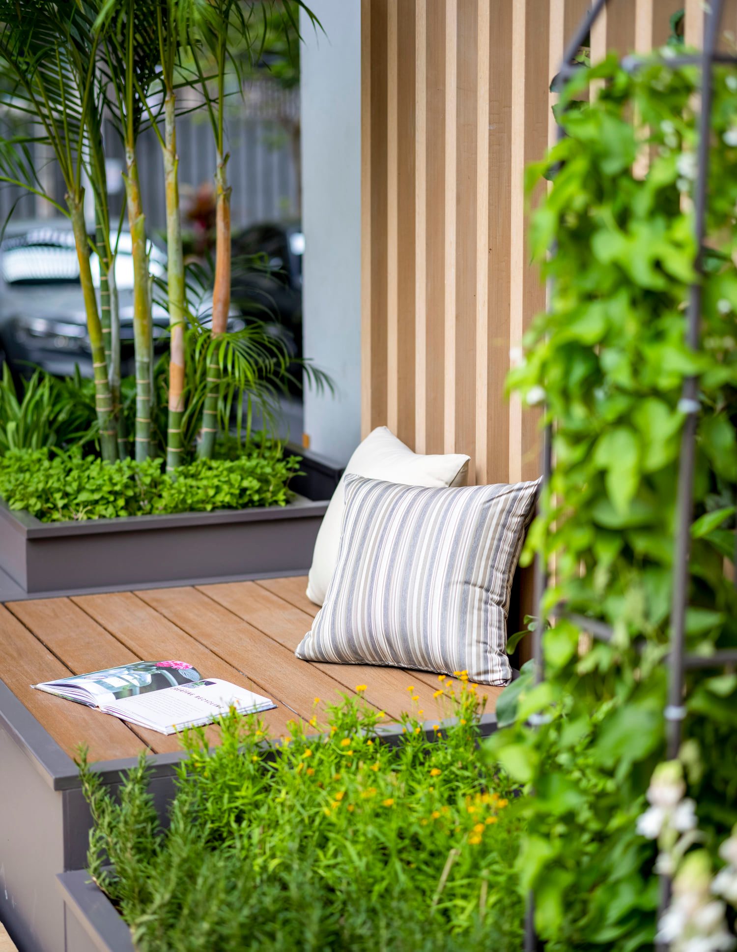 รูปแบบสวนถูกจัดในอยู่ในกระบะปลูกความสูงลดหลั่นแตกต่างกันสร้างมิติให้สวน รวมทั้งสอดแทรกฟังก์ชั่นกรใช้งานด้วยที่นั่งกรุไม้เทียมเข้ากับผนังระแนงไม้เทียมที่มีเป็นฉากเดิม ทำให้สวนดูกลมกลืนแต่มีลูกเล่นน่าสนใจขึ้น