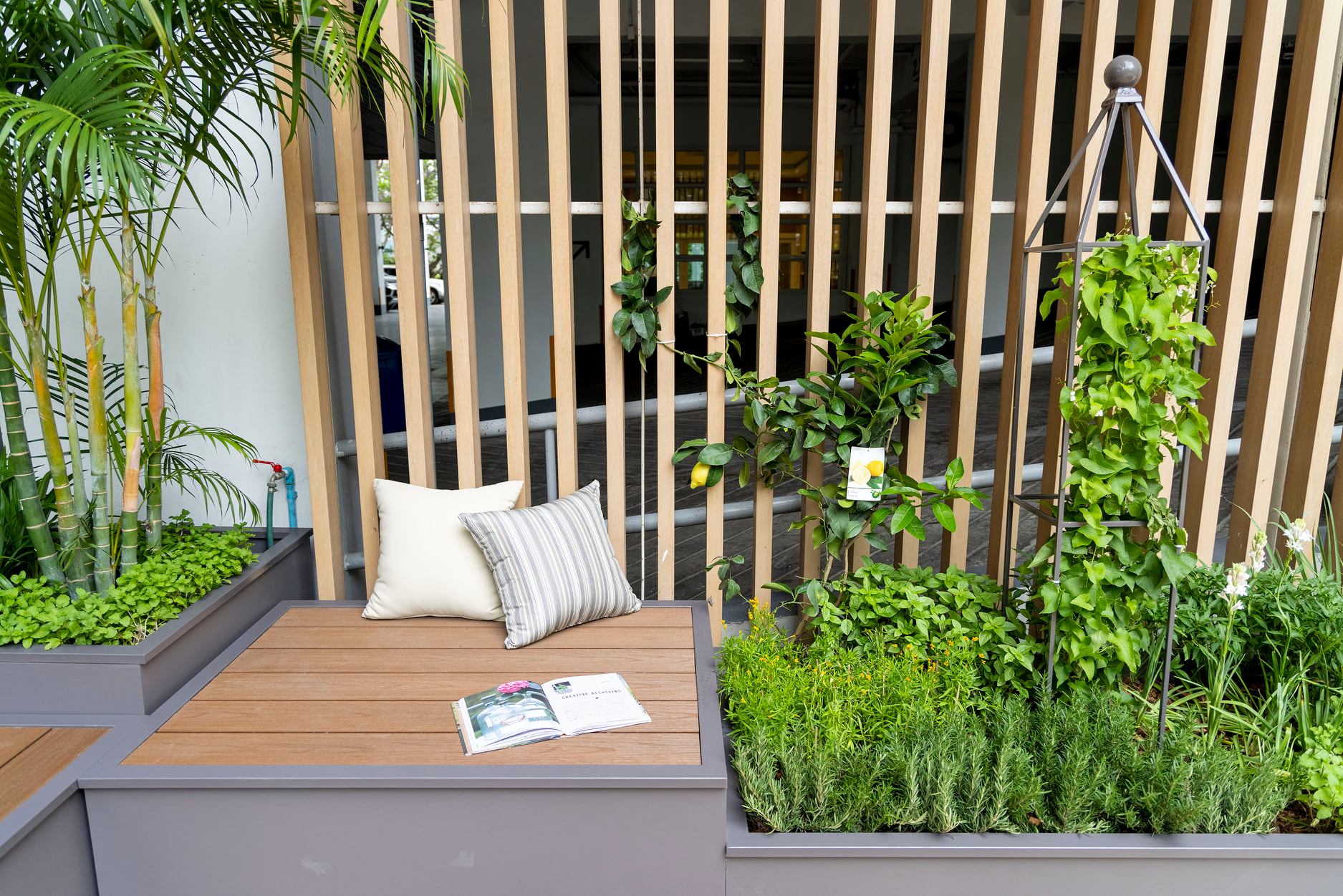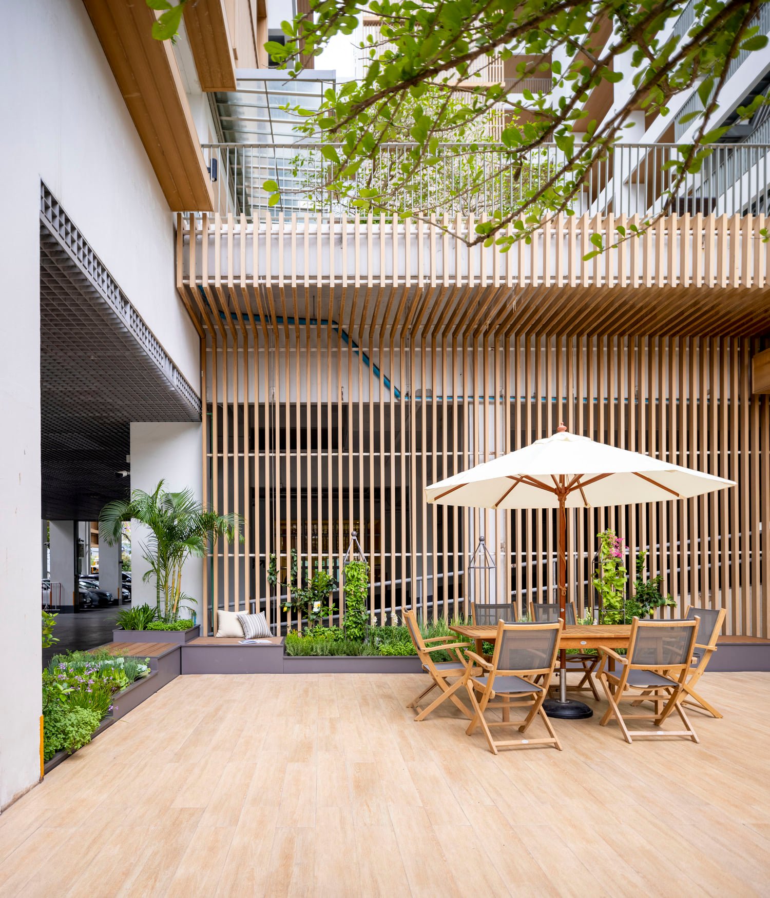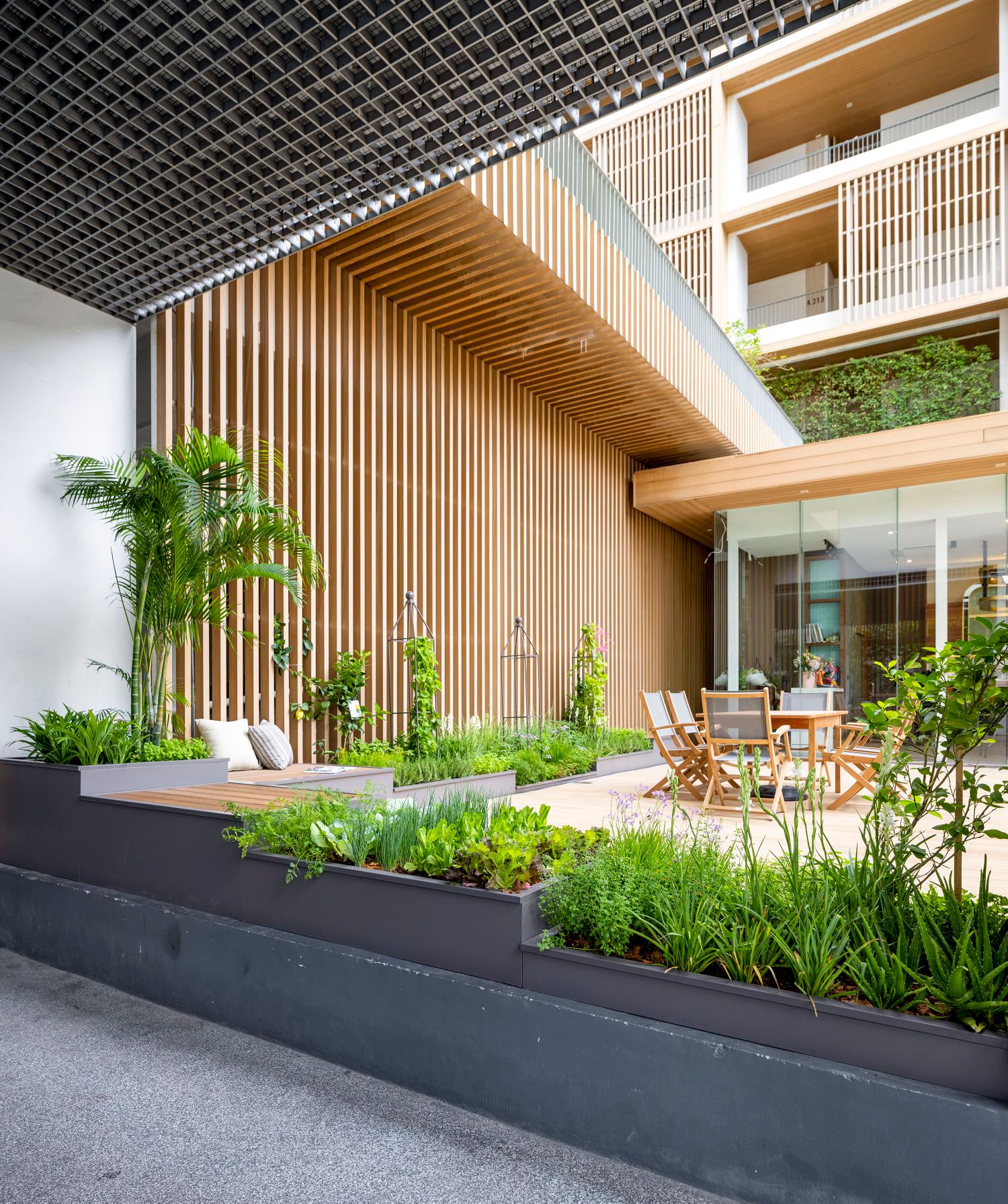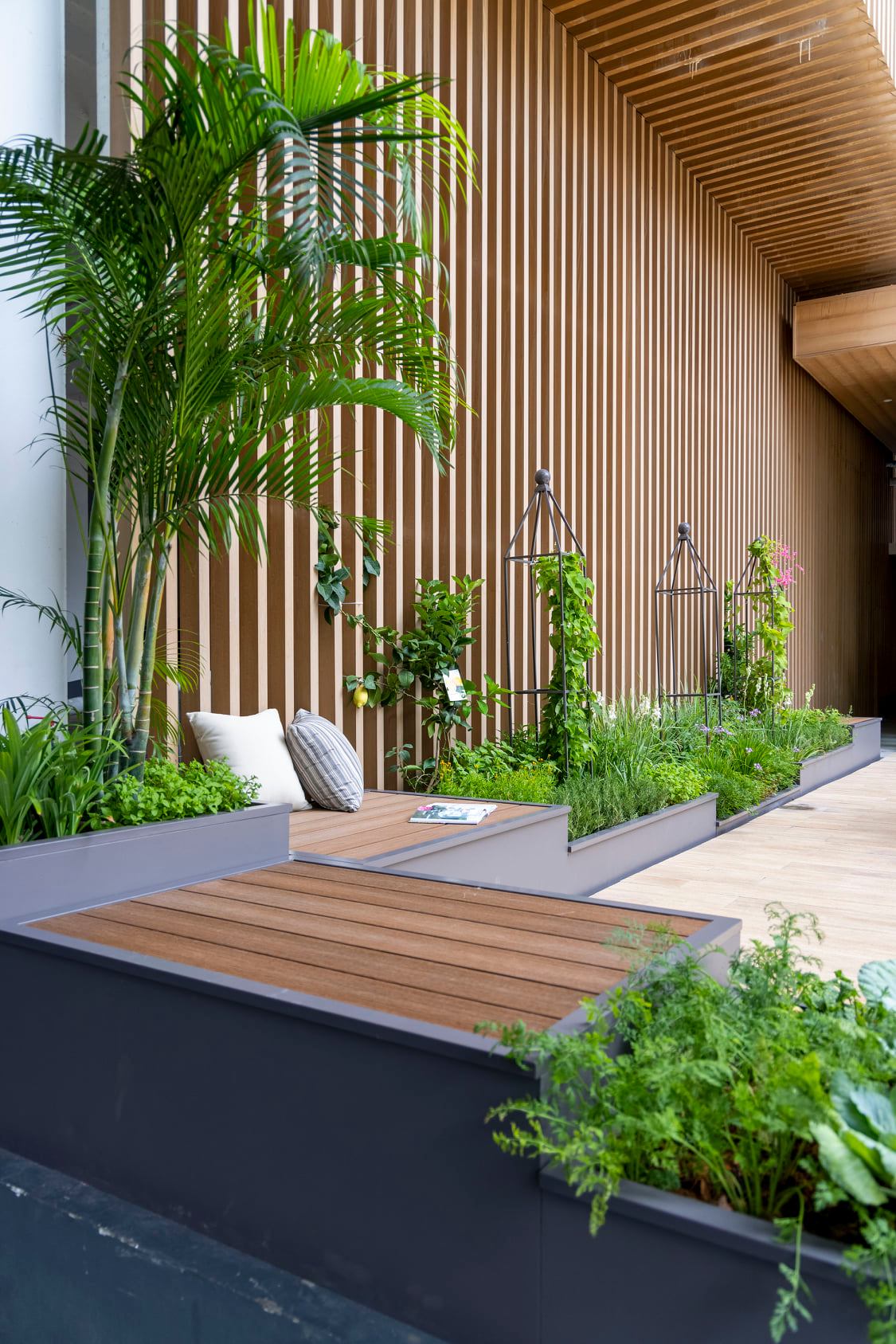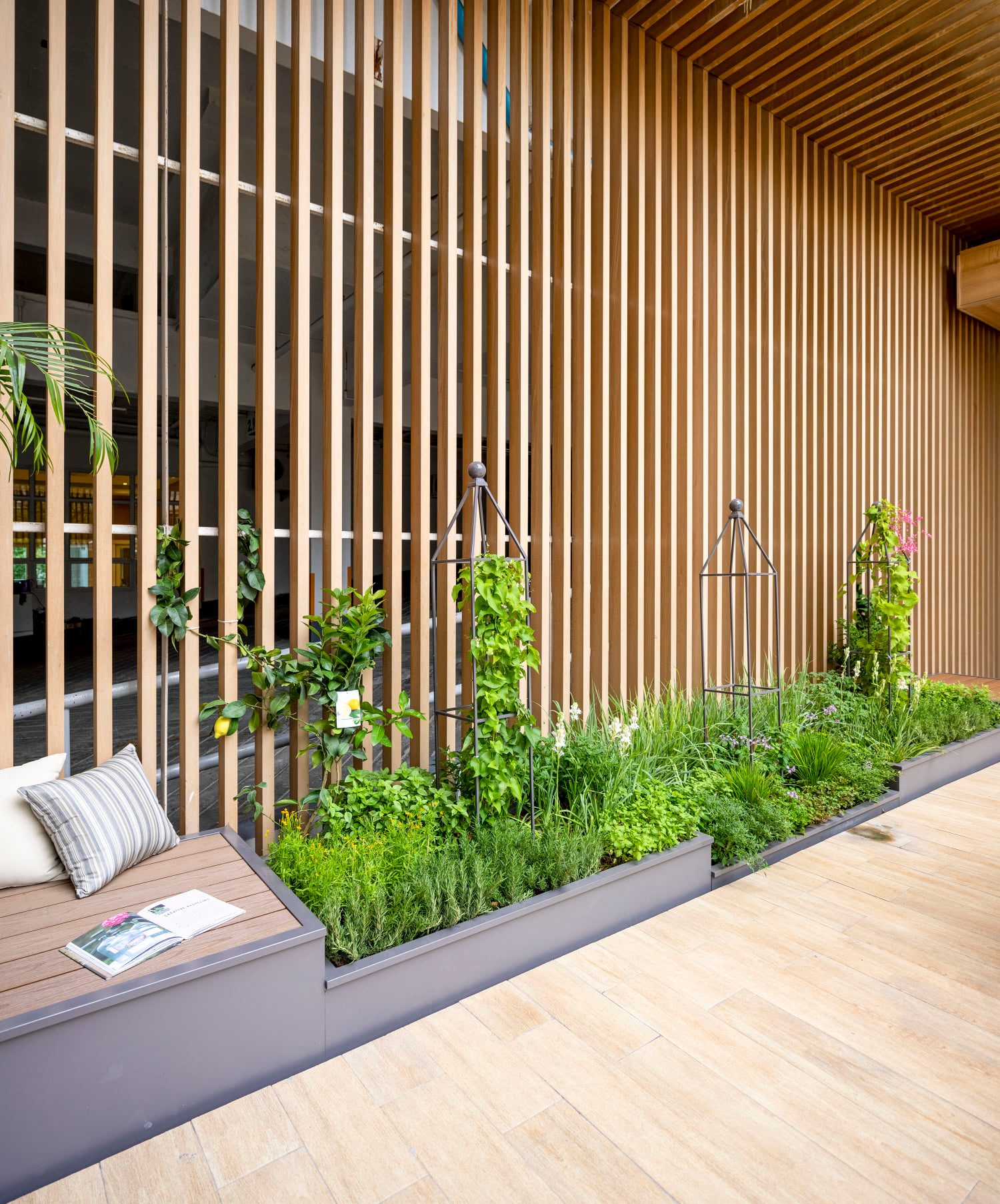 รูปแบบสวนถูกจัดในอยู่ในกระบะปลูกความสูงลดหลั่นแตกต่างกันสร้างมิติให้สวน รวมทั้งสอดแทรกฟังก์ชั่นกรใช้งานด้วยที่นั่งกรุไม้เทียมเข้ากับผนังระแนงไม้เทียมที่มีเป็นฉากเดิม ทำให้สวนดูกลมกลืนแต่มีลูกเล่นน่าสนใจขึ้น