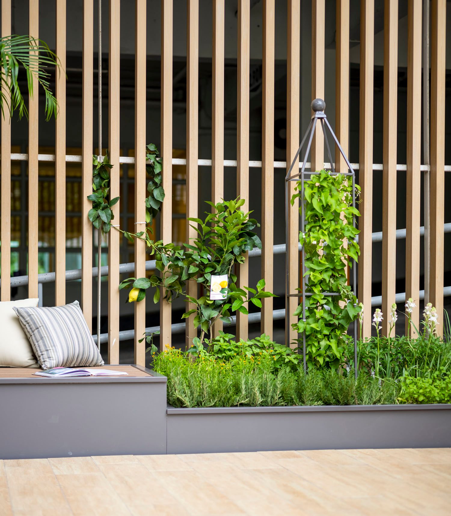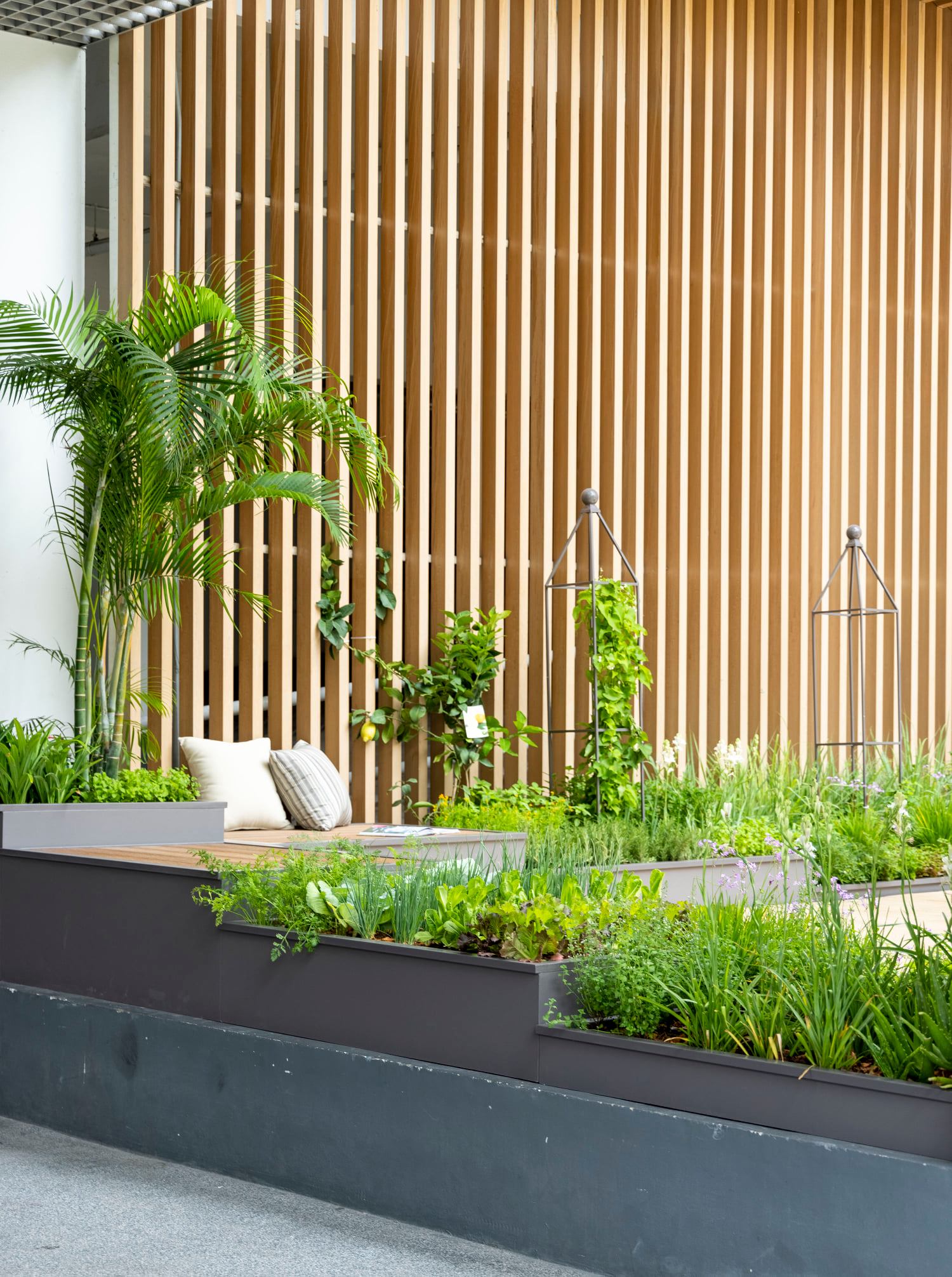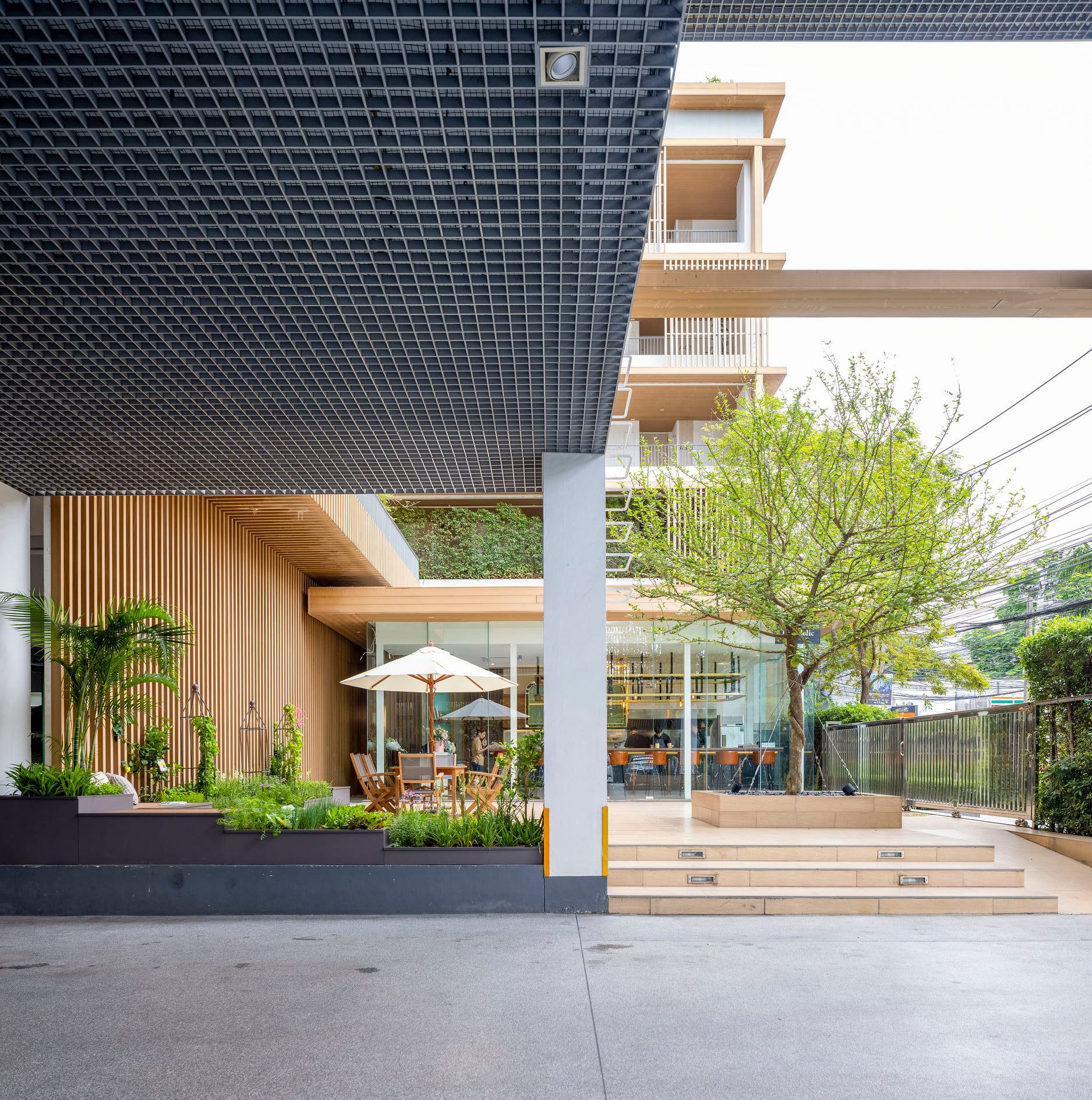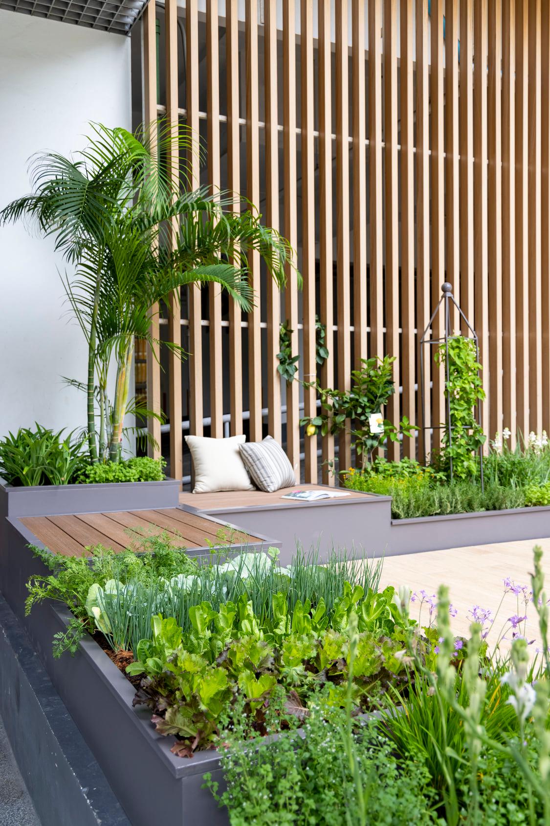 รูปแบบสวนถูกจัดในอยู่ในกระบะปลูกความสูงลดหลั่นแตกต่างกันสร้างมิติให้สวน รวมทั้งสอดแทรกฟังก์ชั่นกรใช้งานด้วยที่นั่งกรุไม้เทียมเข้ากับผนังระแนงไม้เทียมที่มีเป็นฉากเดิม ทำให้สวนดูกลมกลืนแต่มีลูกเล่นน่าสนใจขึ้น