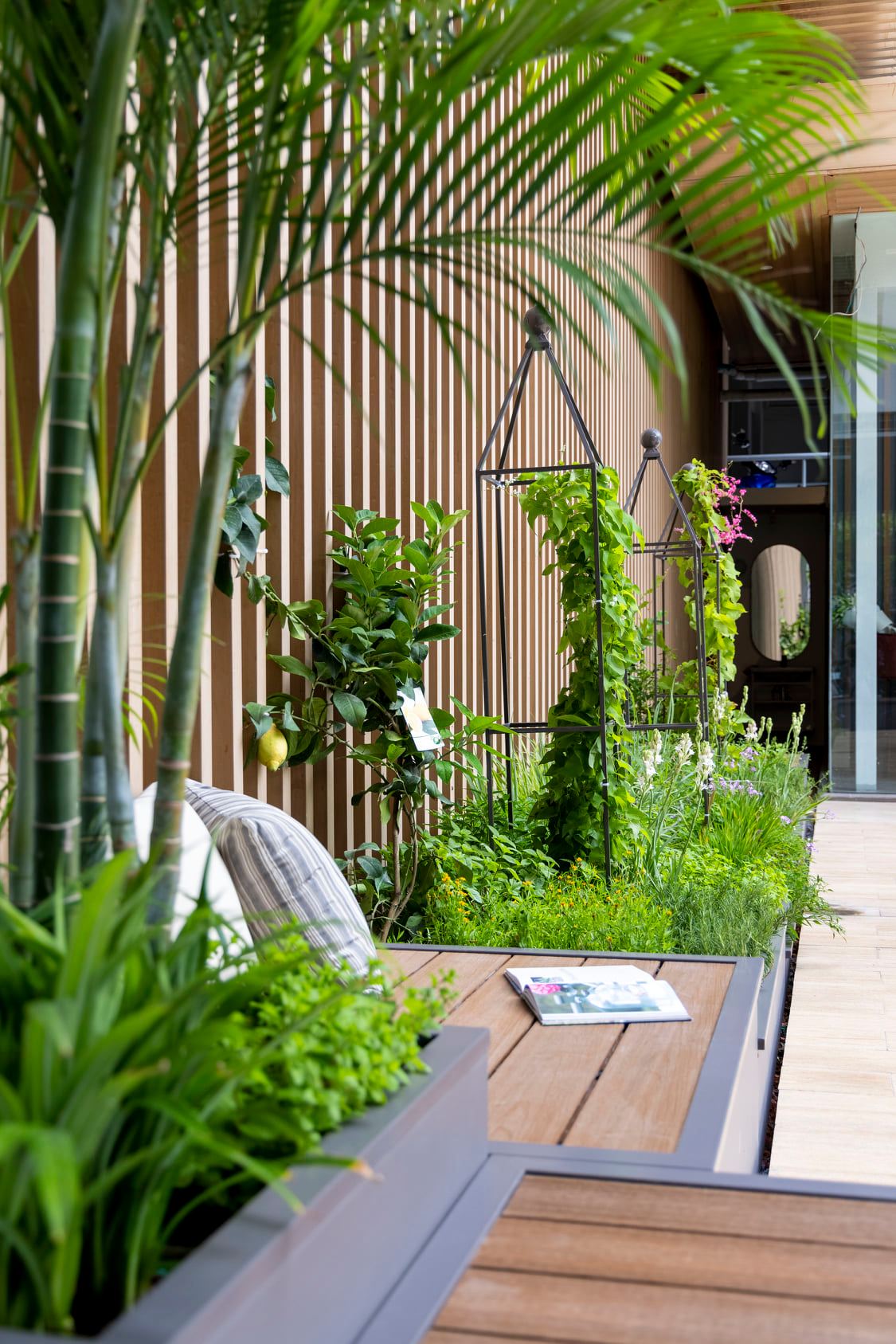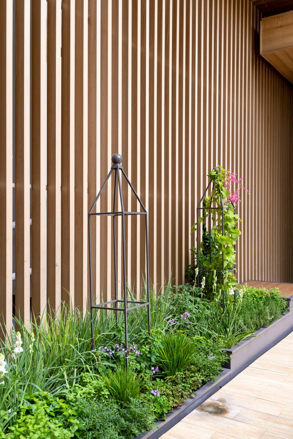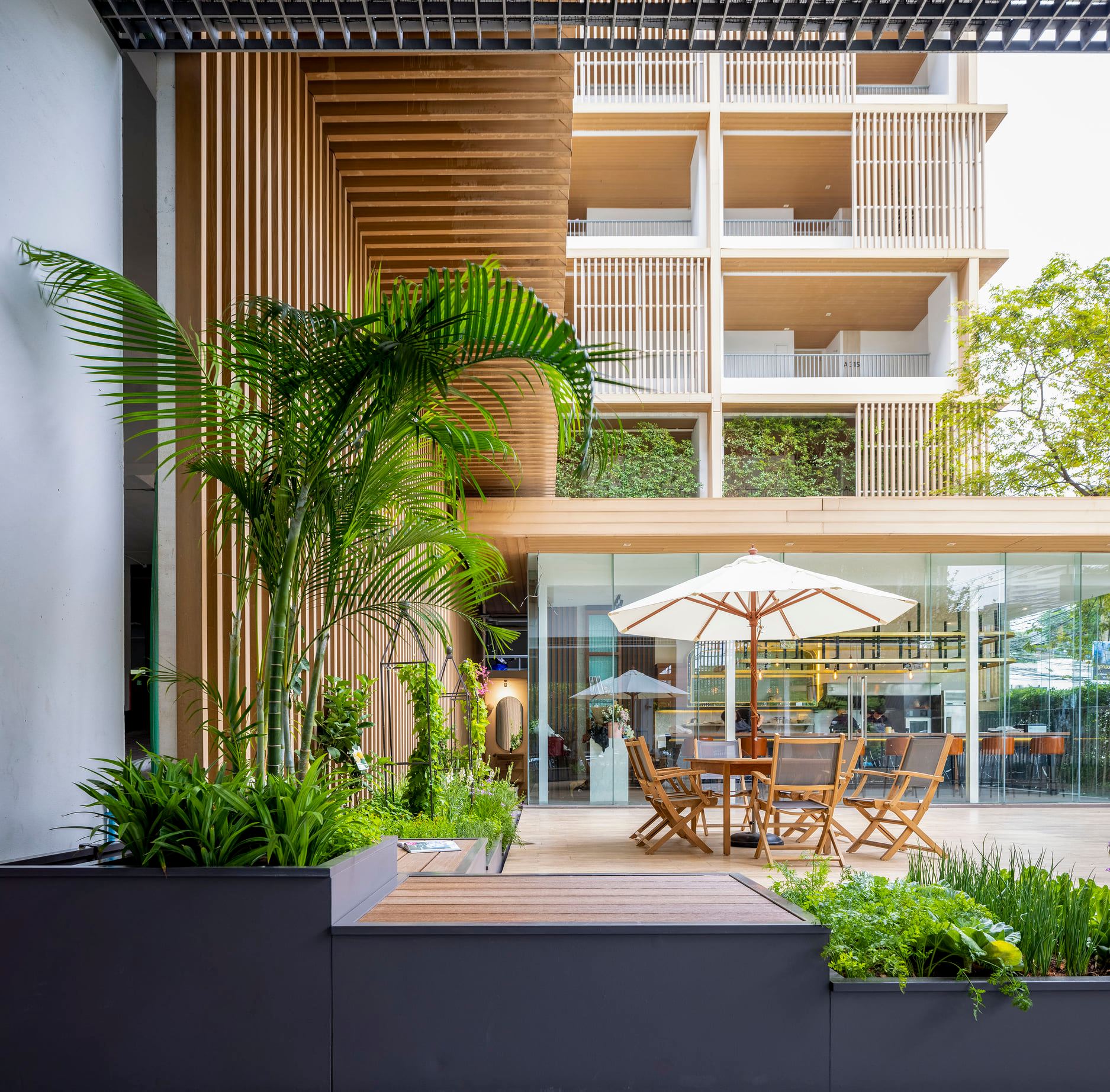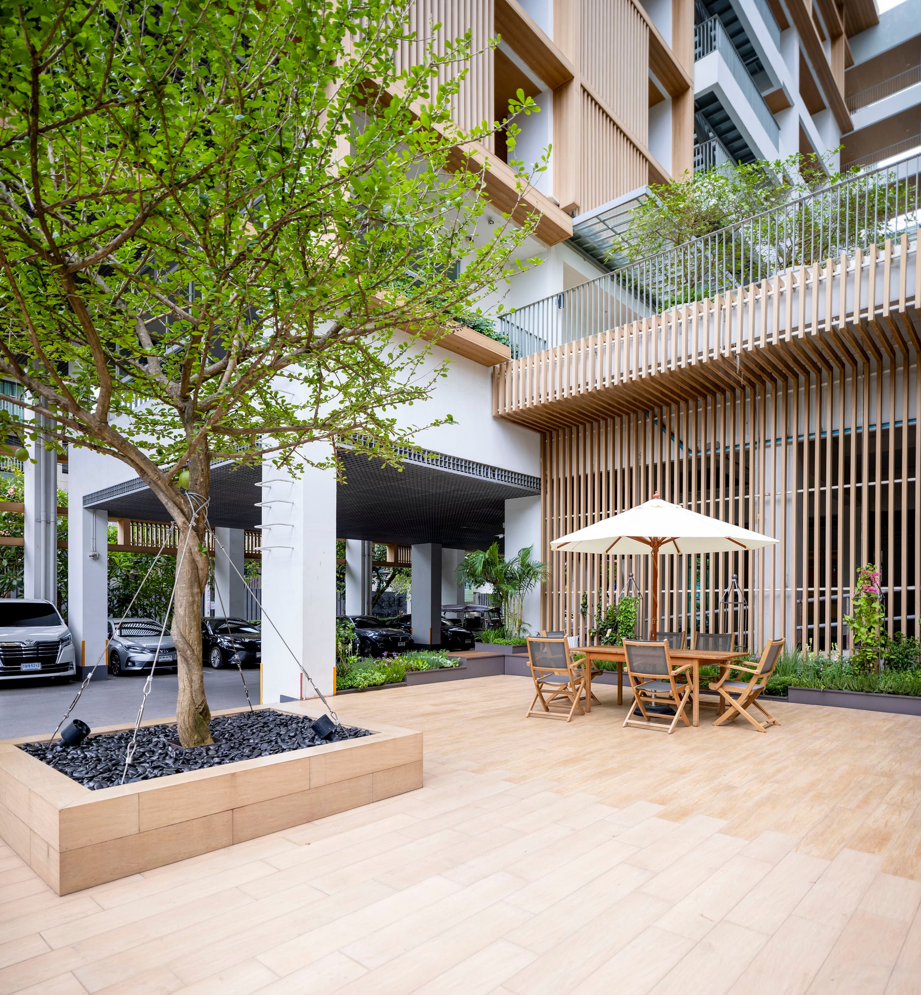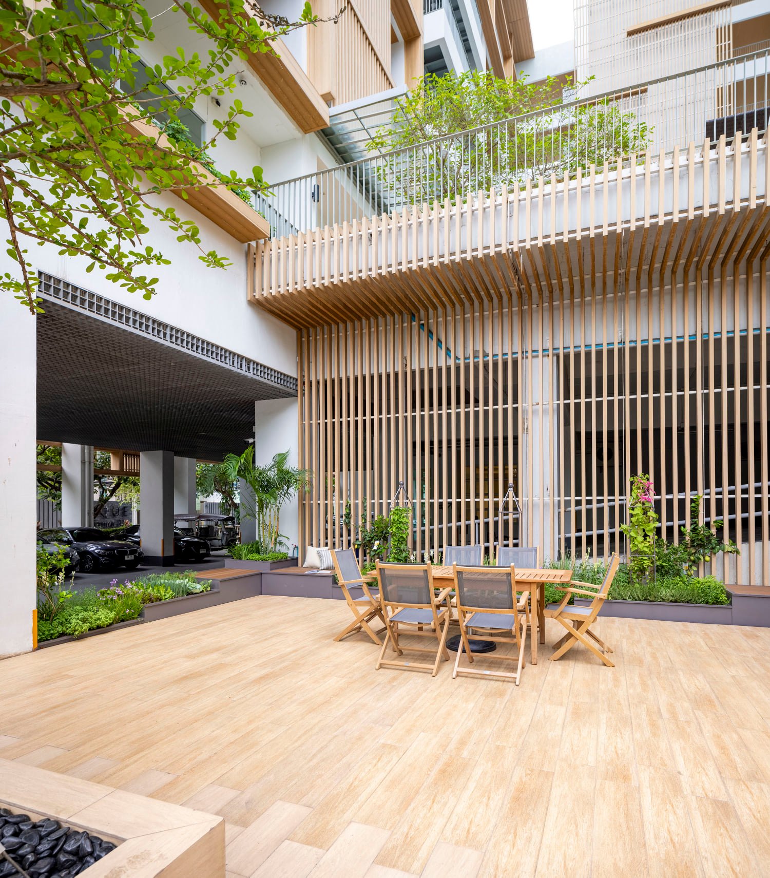 รูปแบบสวนถูกจัดในอยู่ในกระบะปลูกความสูงลดหลั่นแตกต่างกันสร้างมิติให้สวน รวมทั้งสอดแทรกฟังก์ชั่นกรใช้งานด้วยที่นั่งกรุไม้เทียมเข้ากับผนังระแนงไม้เทียมที่มีเป็นฉากเดิม ทำให้สวนดูกลมกลืนแต่มีลูกเล่นน่าสนใจขึ้น