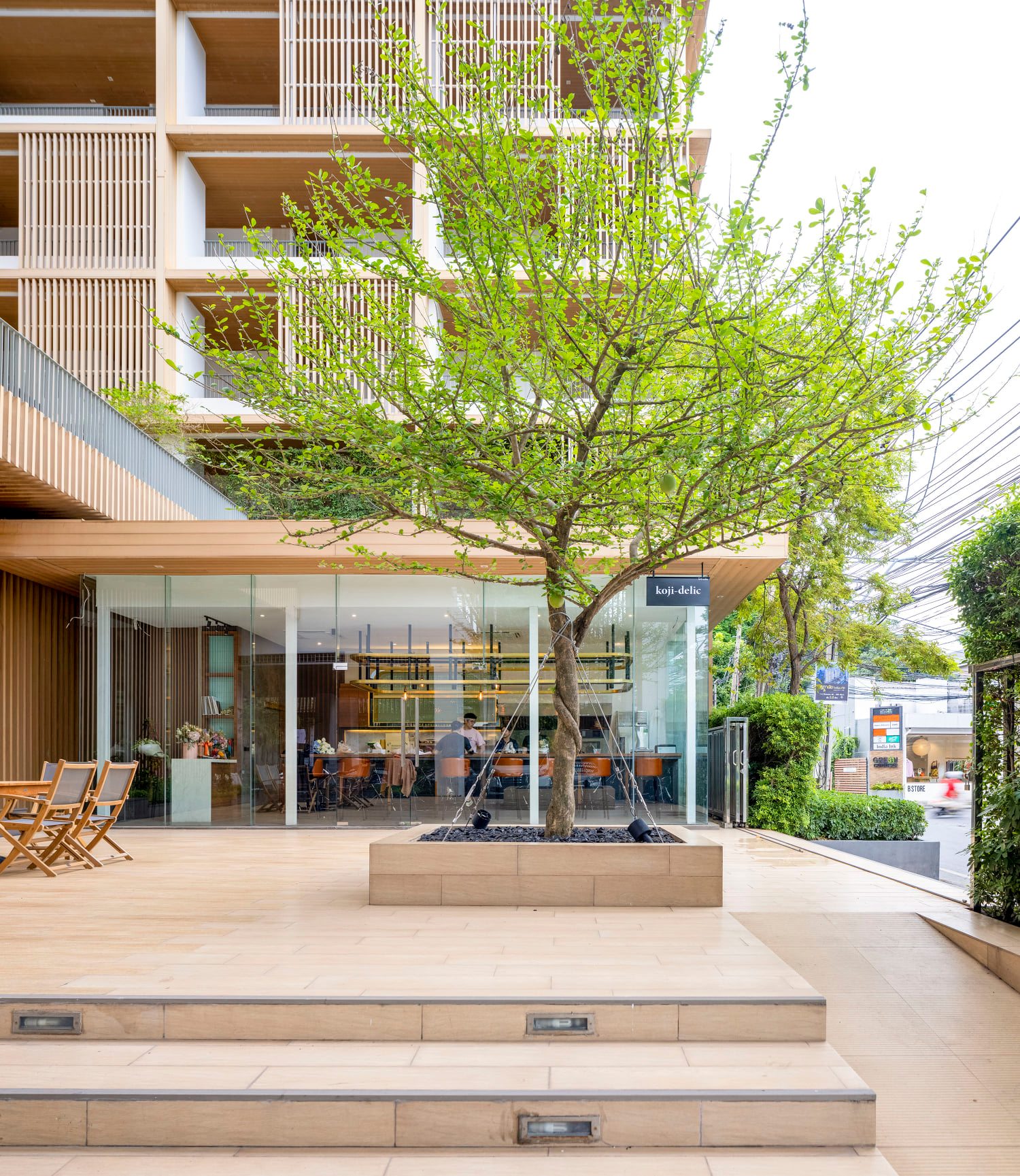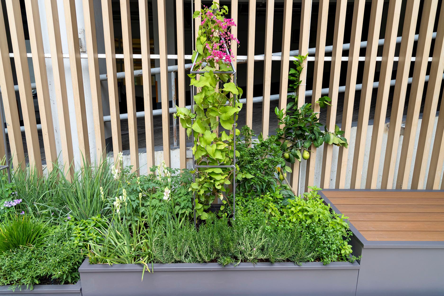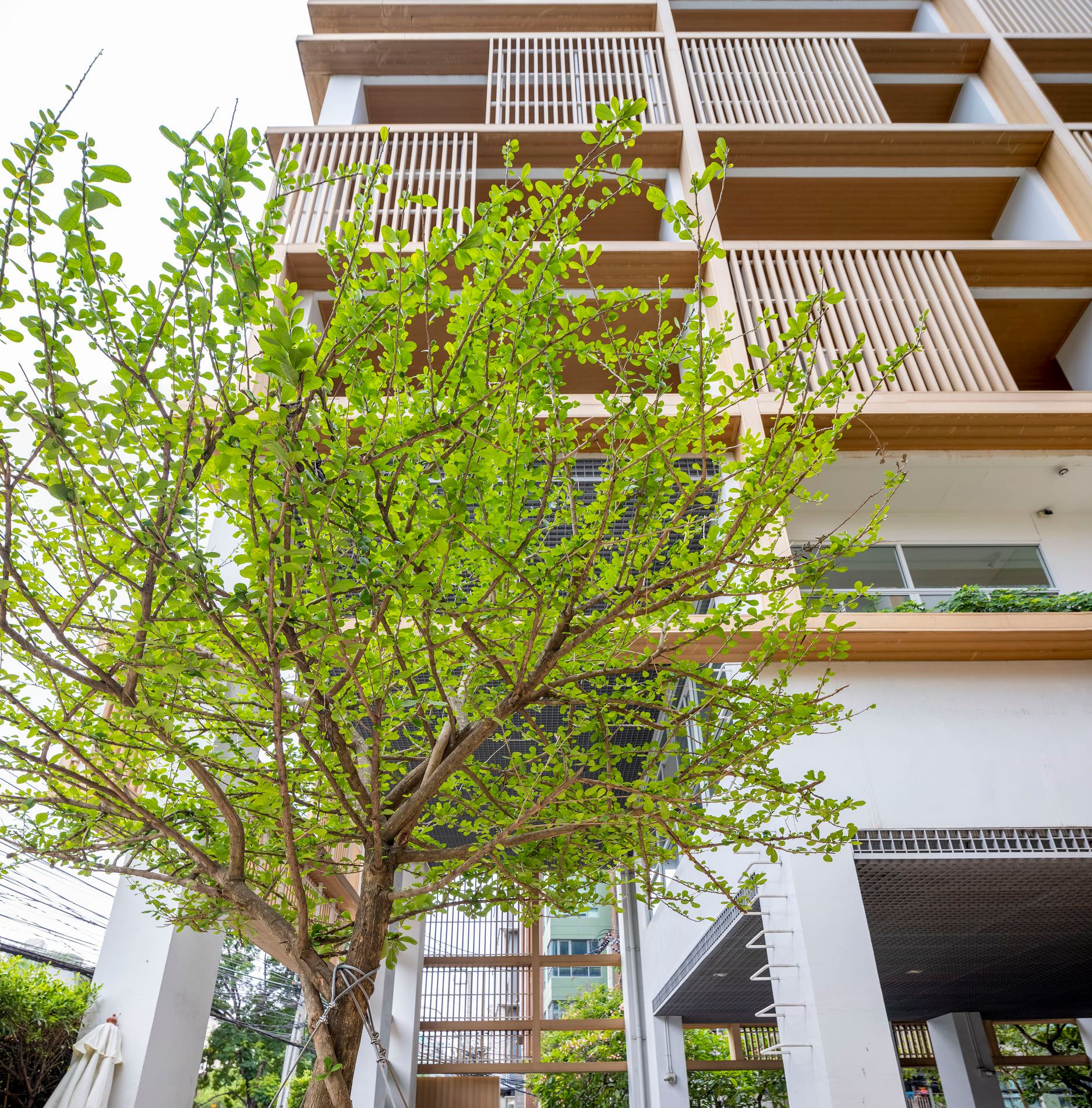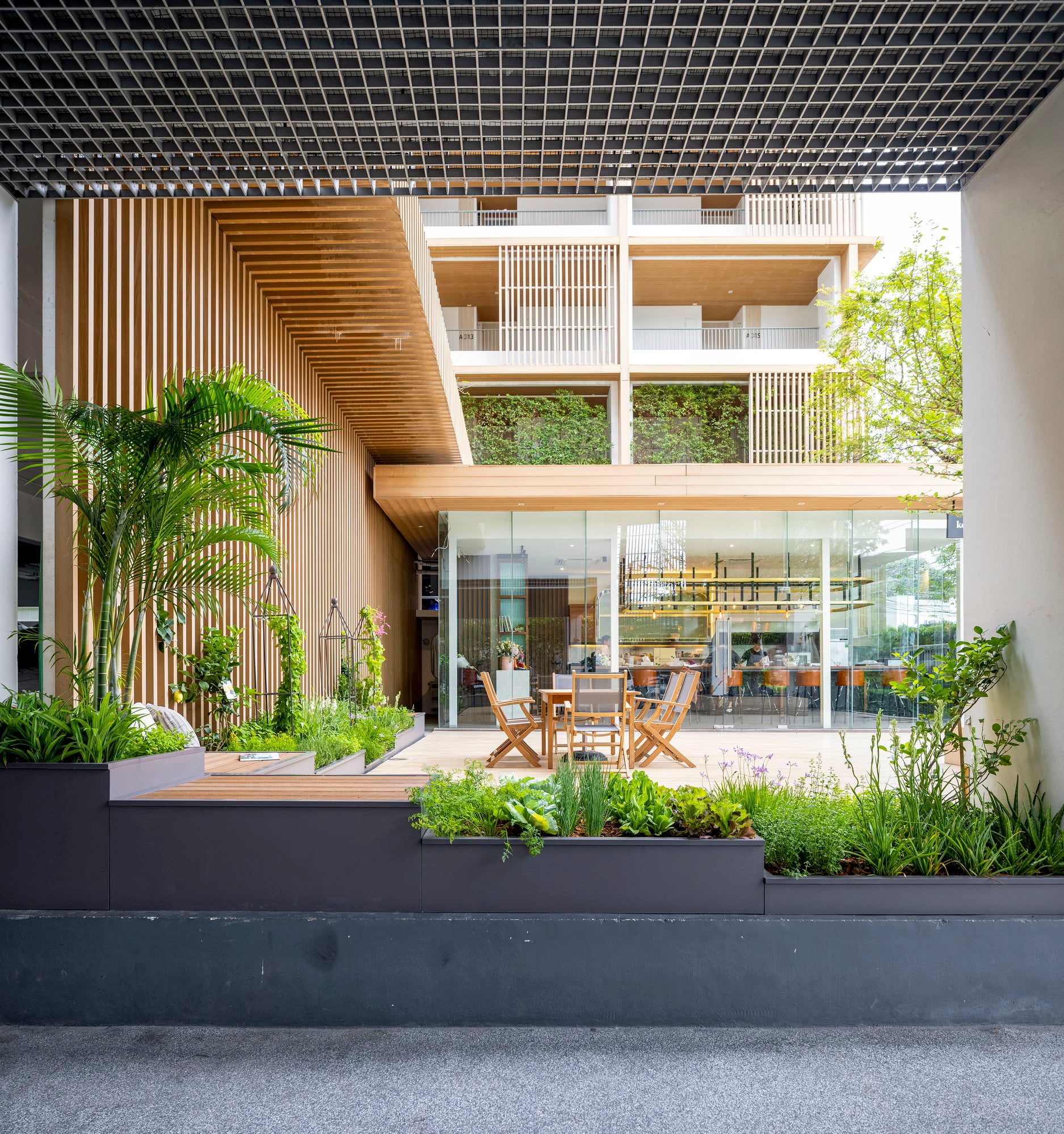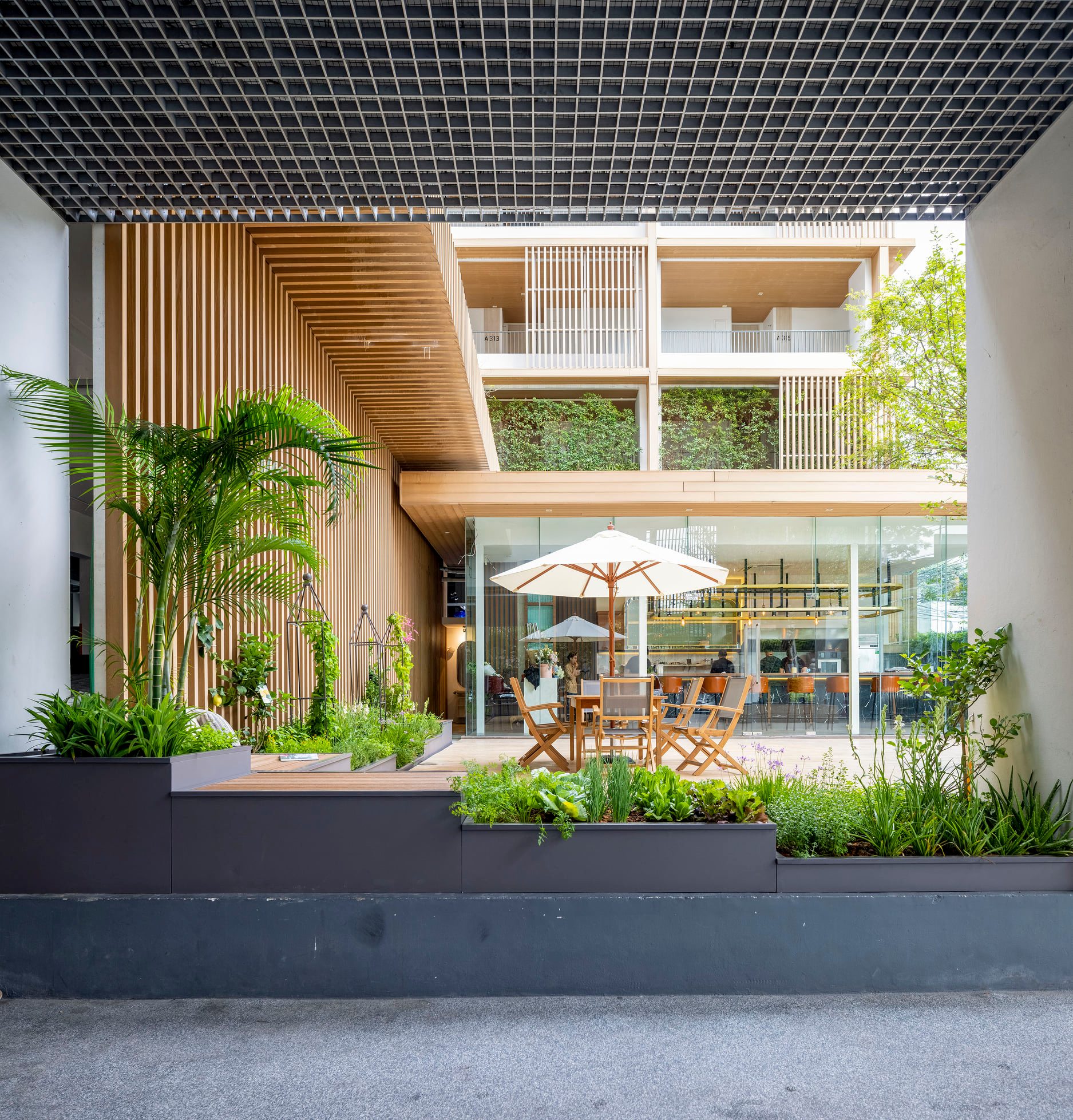 รูปแบบสวนถูกจัดในอยู่ในกระบะปลูกความสูงลดหลั่นแตกต่างกันสร้างมิติให้สวน รวมทั้งสอดแทรกฟังก์ชั่นกรใช้งานด้วยที่นั่งกรุไม้เทียมเข้ากับผนังระแนงไม้เทียมที่มีเป็นฉากเดิม ทำให้สวนดูกลมกลืนแต่มีลูกเล่นน่าสนใจขึ้น