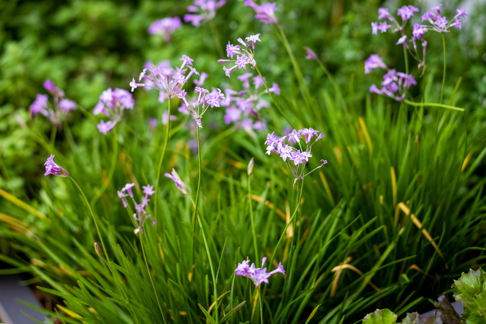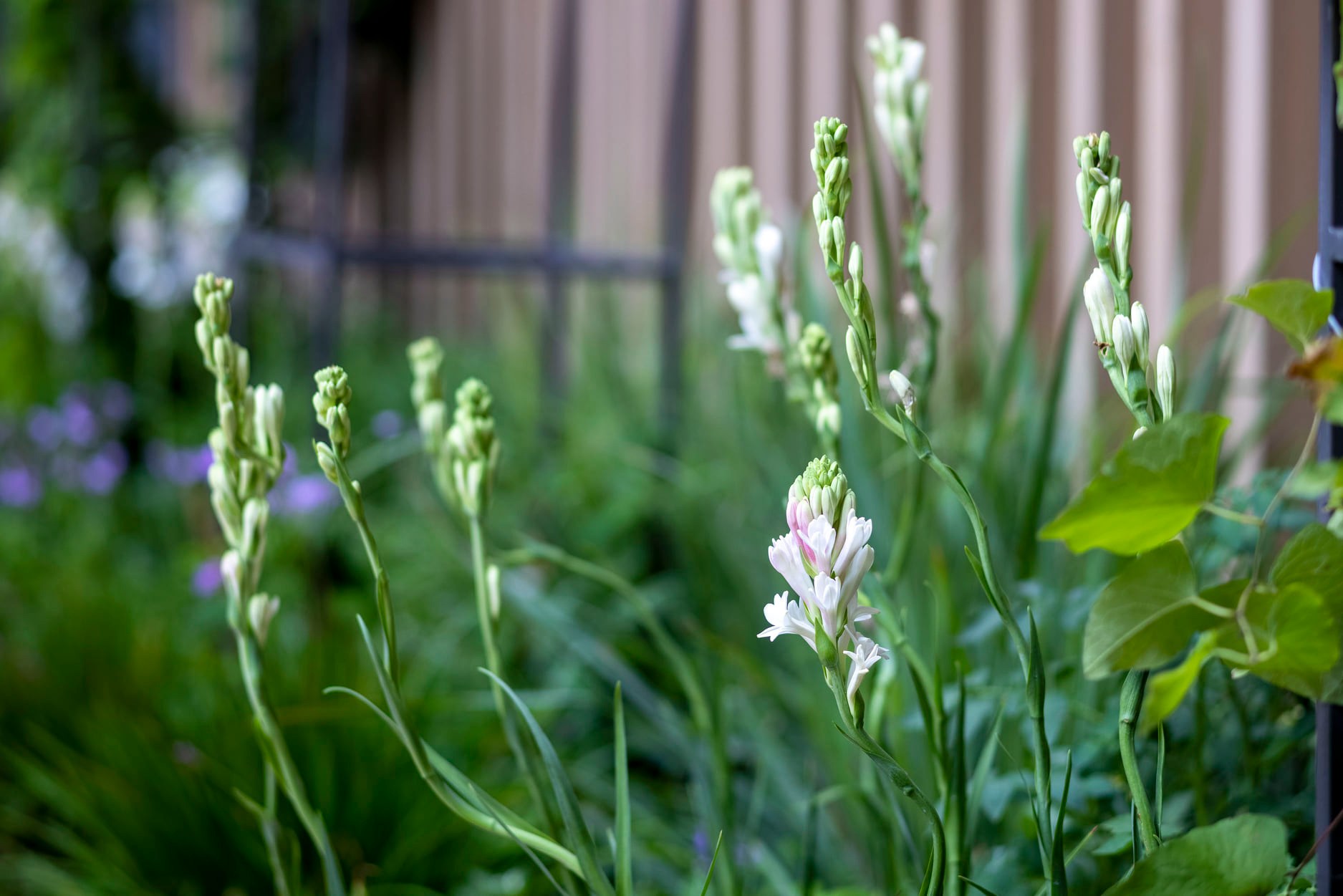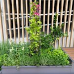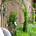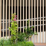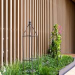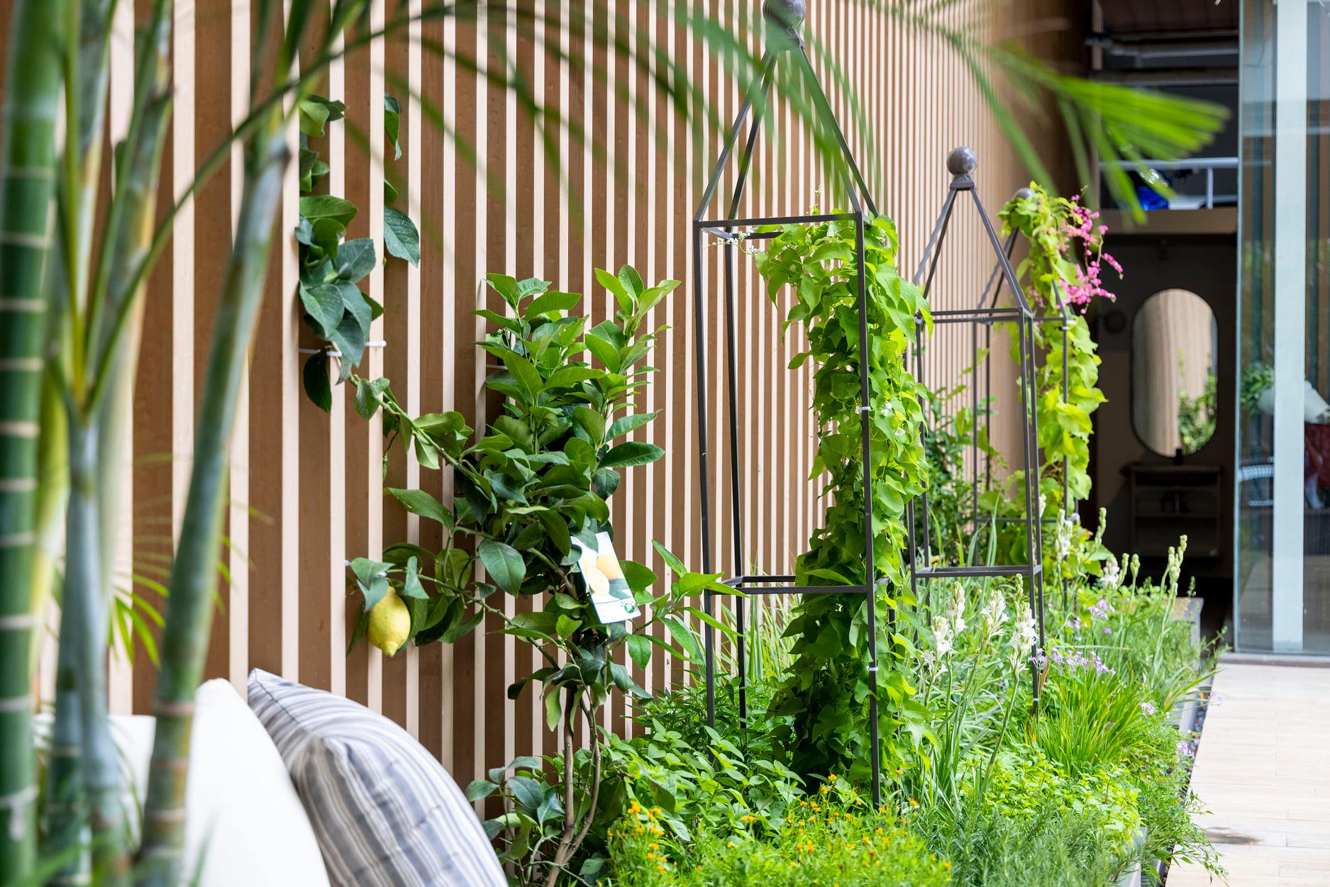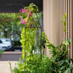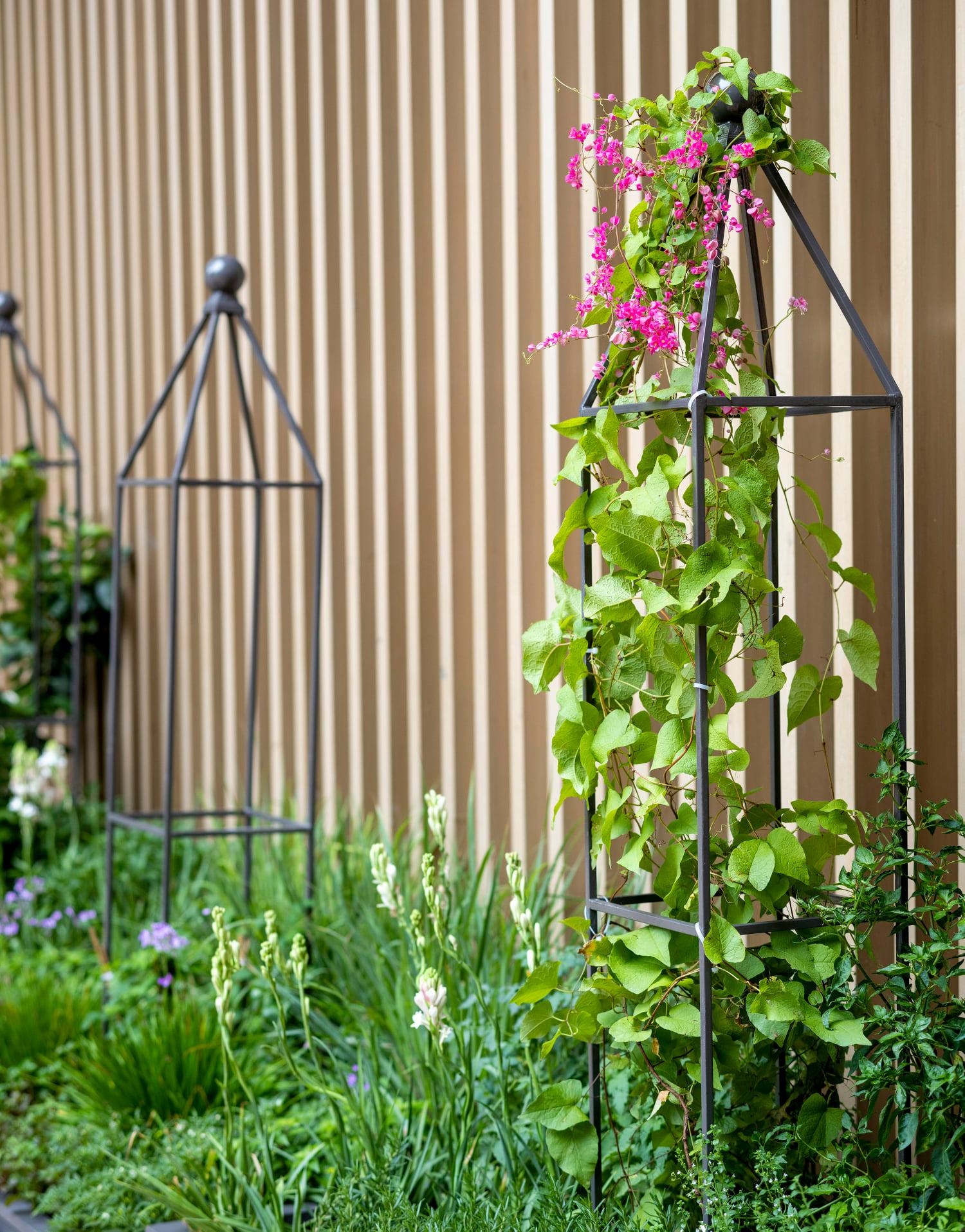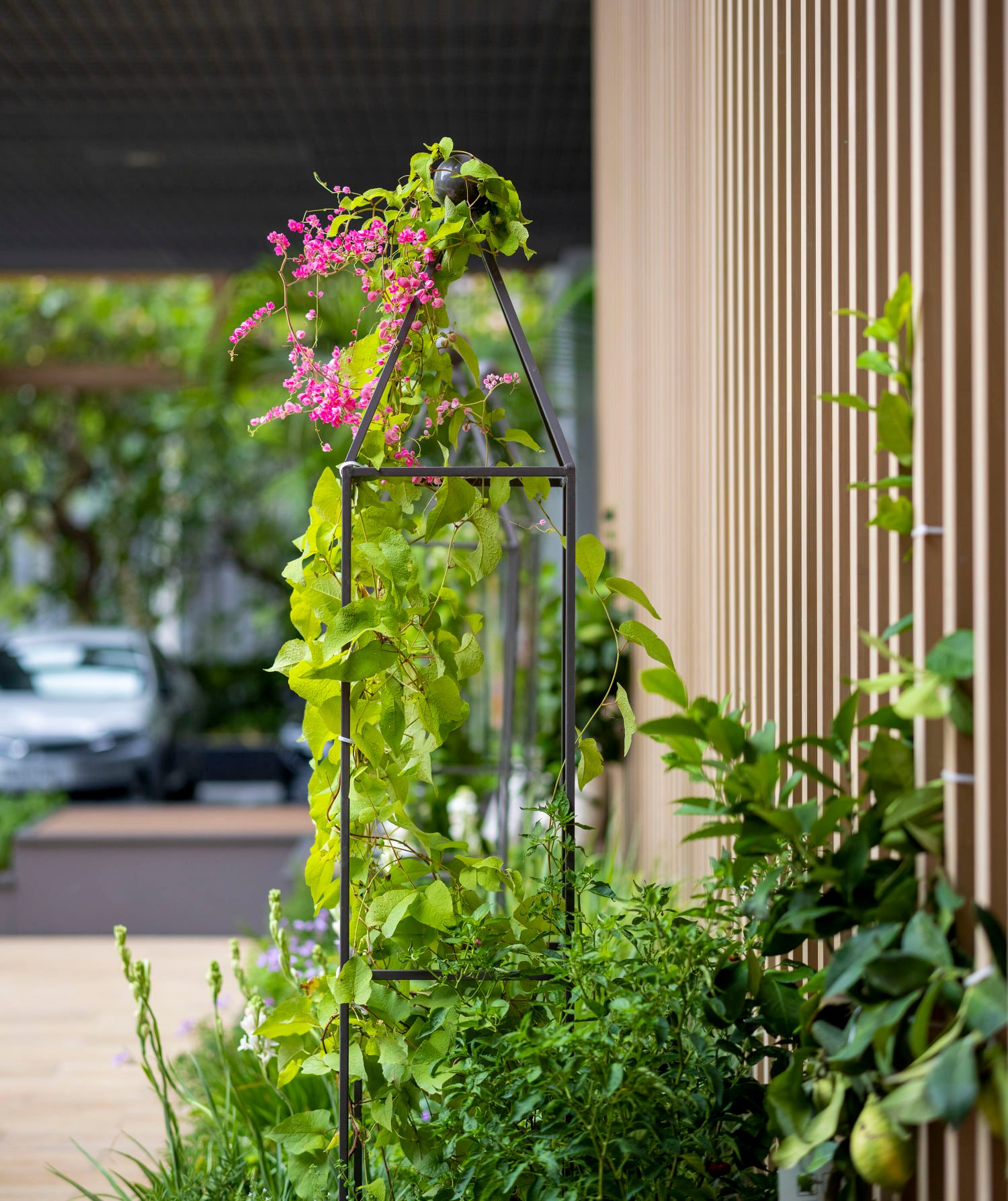 เพื่อไม่ให้สวนดูแบนเรียบจนเกินไป เราออกแบบให้ตรงกลางรับมุมมองด้วยซุ้มไม้เลื้อย 3 จุด ให้ต้นไม้เลื้อยดอกสวยอย่างพวงชมพูและอัญชันได้เกาะเกี่ยว สร้างพื้นที่สีเขียวในแนวตั้ได้เป็นอย่างดี