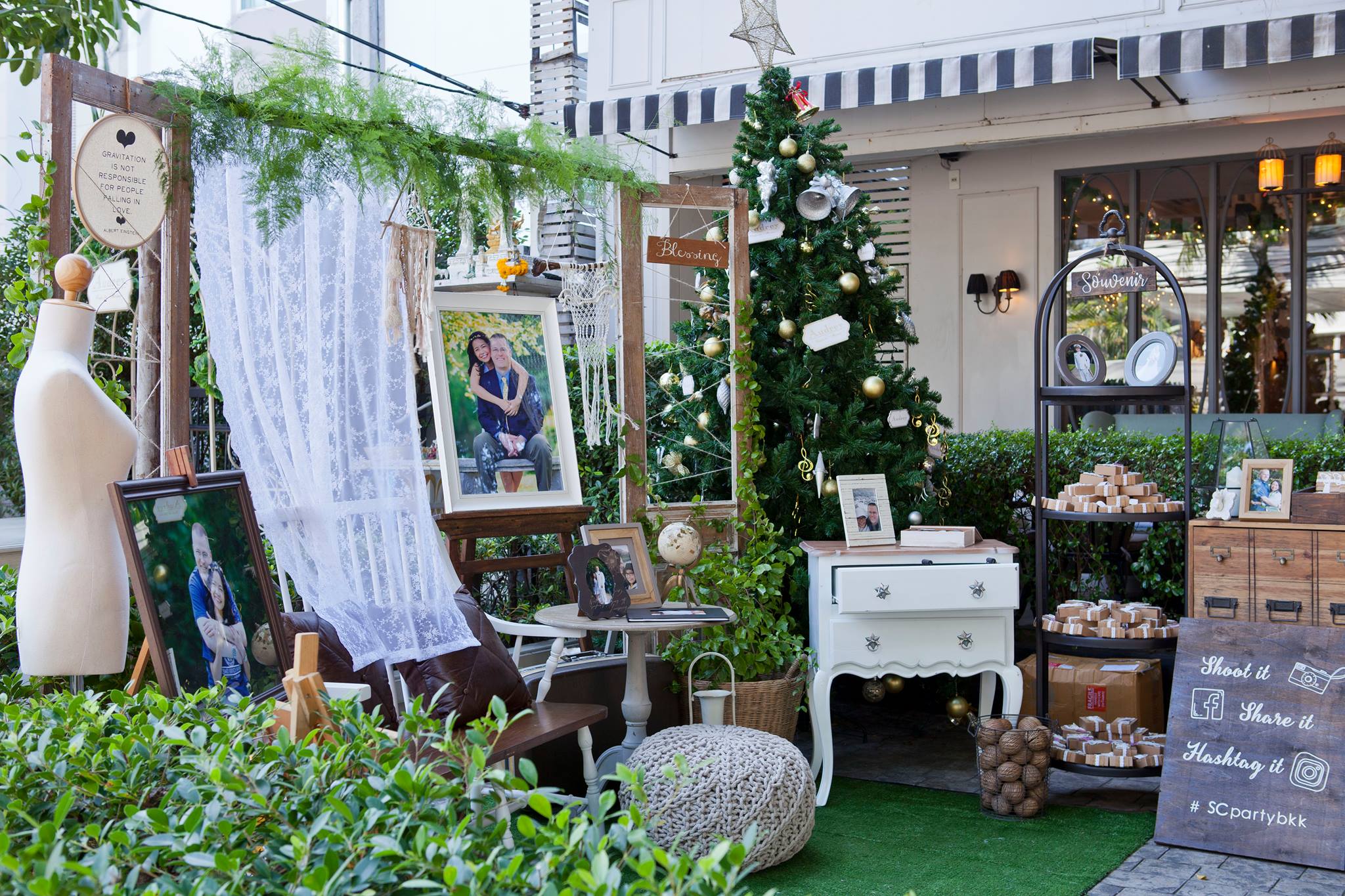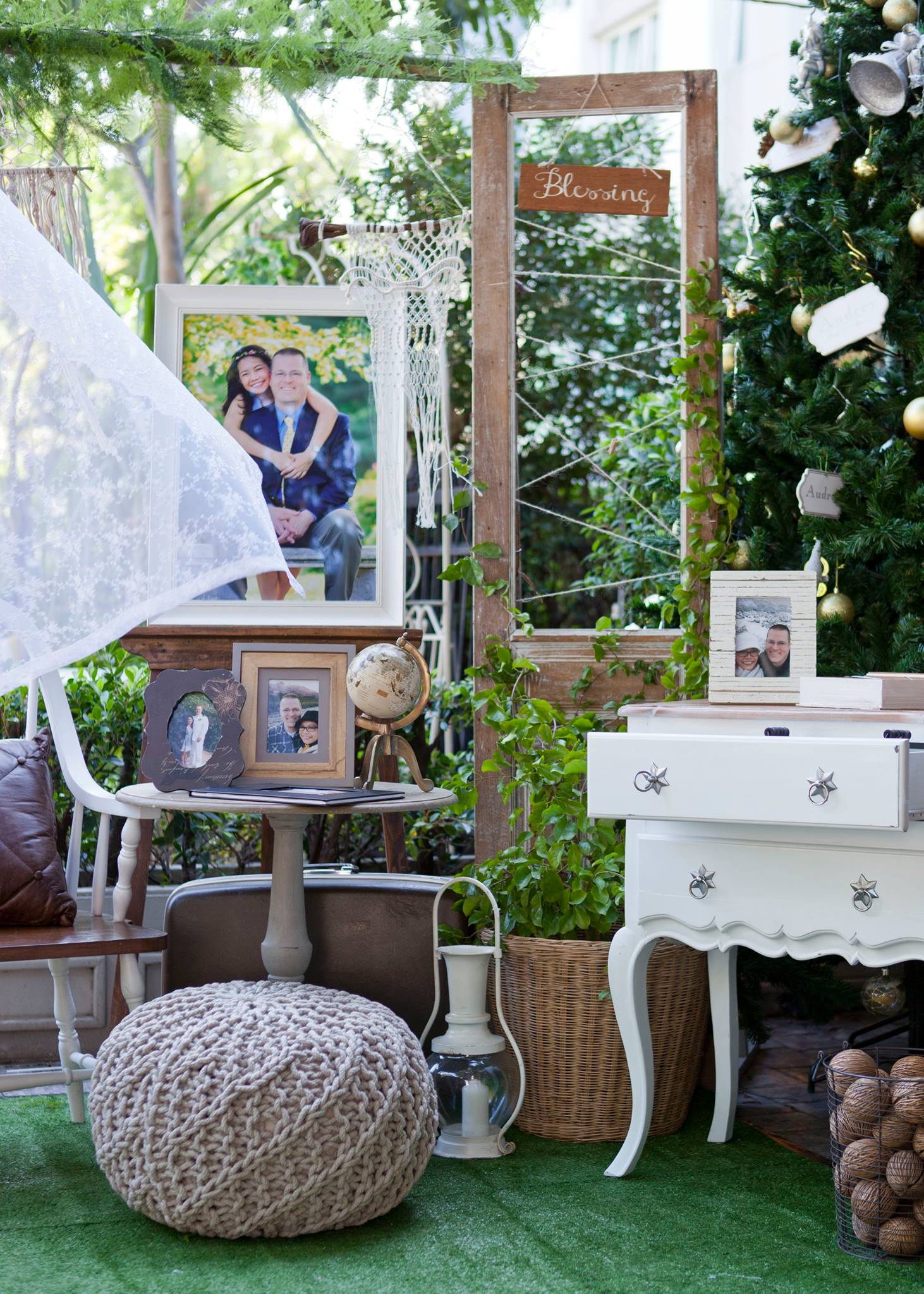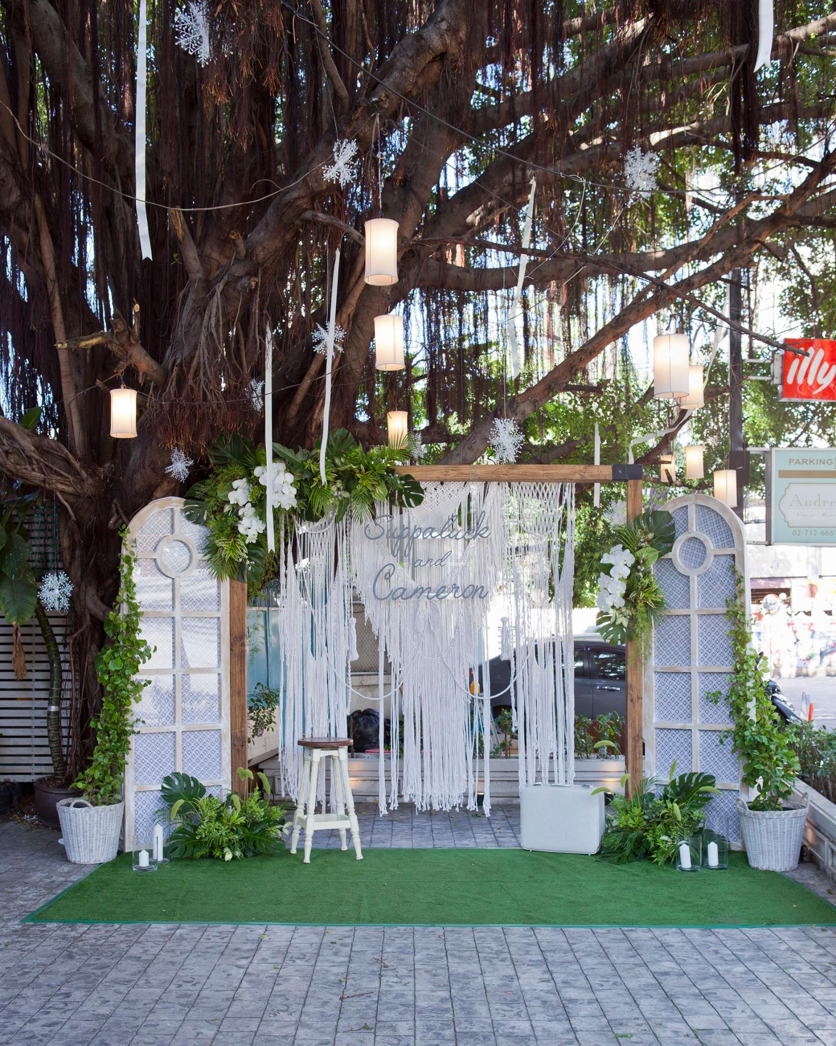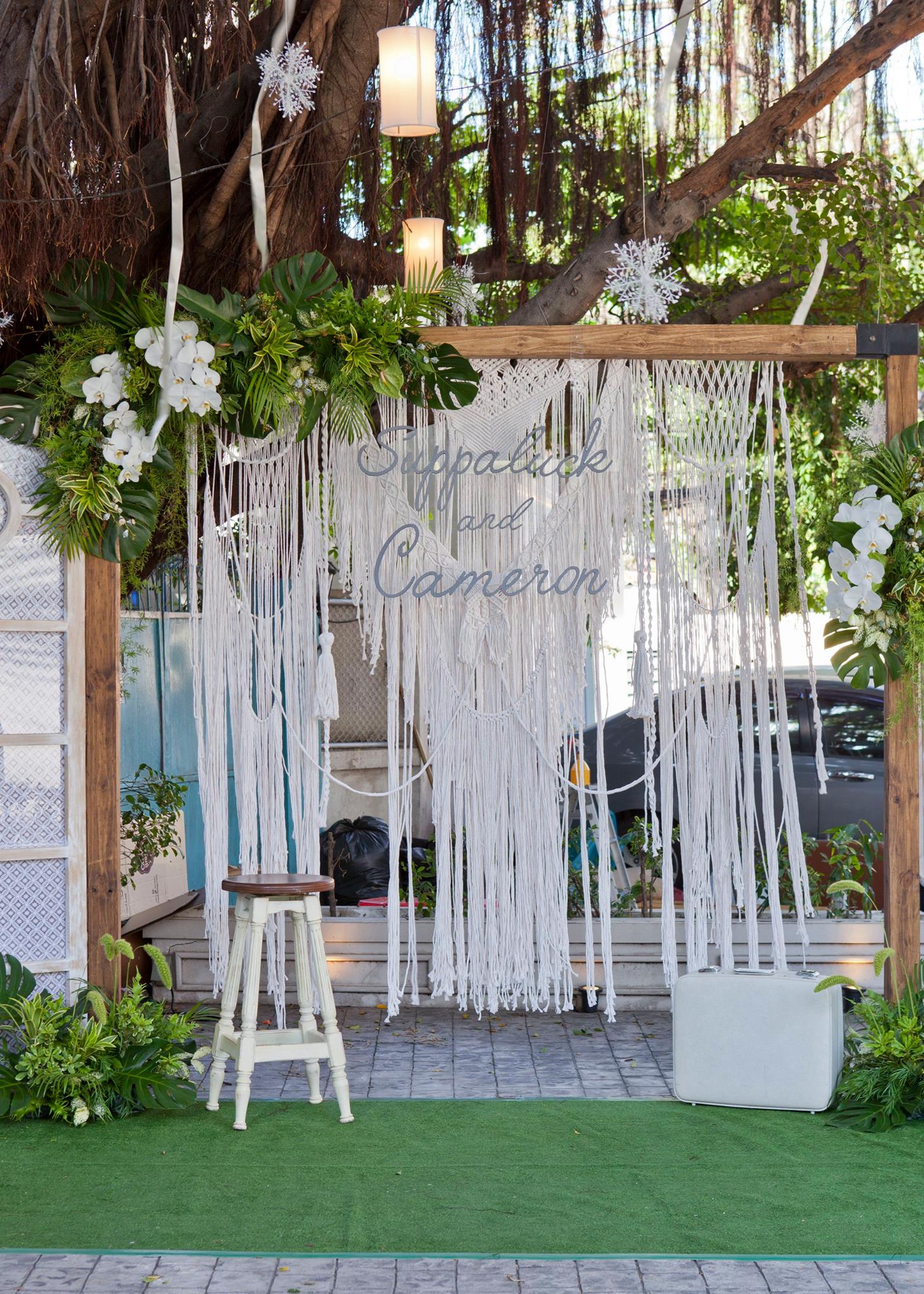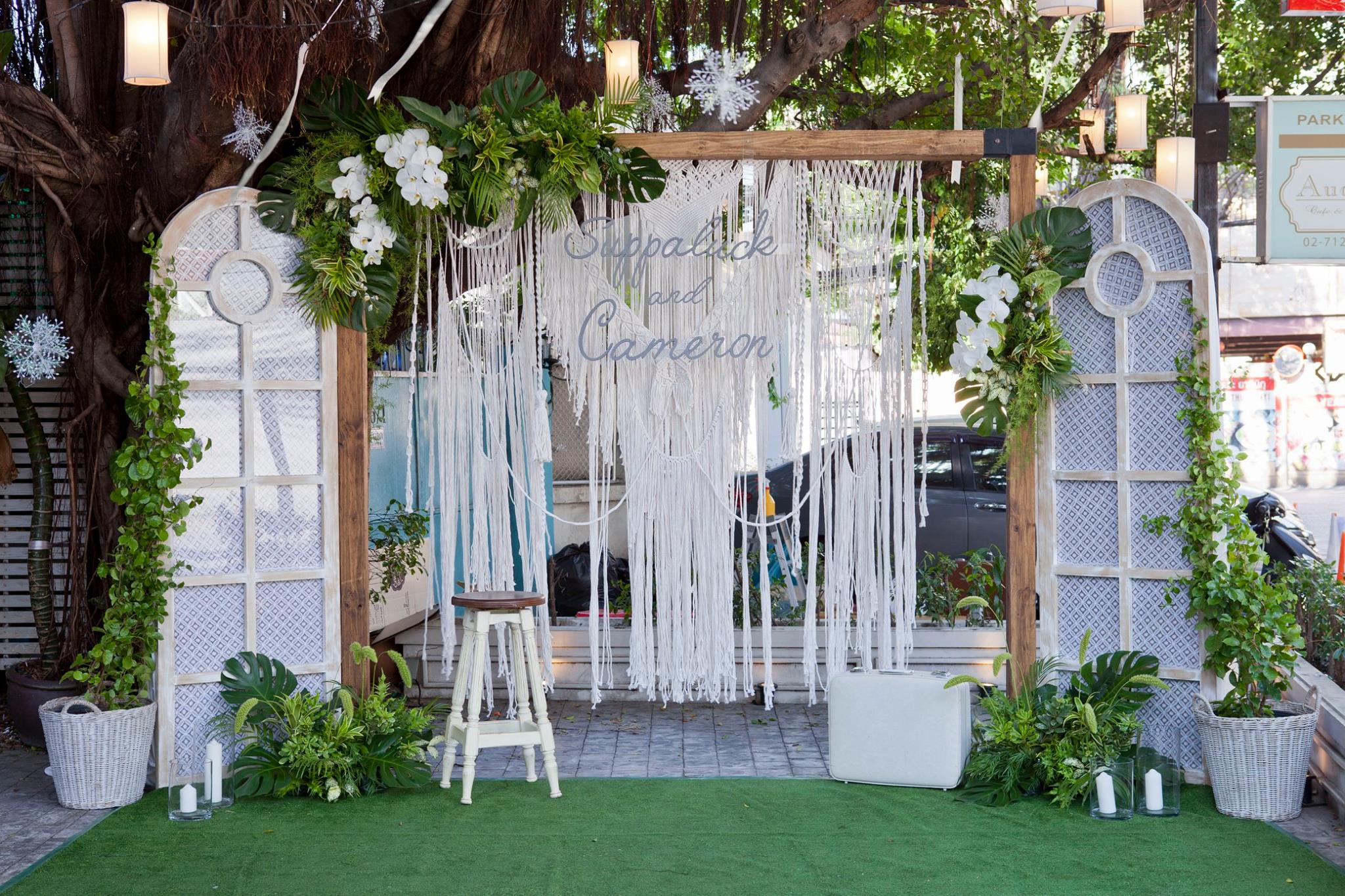 ยินดีกับบ่าวสาวคู่ที่แสนน่ารักอย่างคุณนุ้ย และคุณ Cam อีกครั้งนะคะ และของคุณสำหรับความไว้วางใจให้นุ่นและ Shabby Chic Gardens ได้ดูแลในส่วนของงานตกแต่งสถานที่ ทั้งให้อิสระทางไอเดียทำให้งานน่ารักออกมาแบบอบอุ่นๆ ตามโจทย์ที่เจ้าสาวอยากได้เลยค่ะ ต้นไม้ใหญ่สร้างร่มเงาและเส้นสายทั้งยังเป็น background ได้เป็นอย่างดีสำหรับมุมเอกของการต้อนรับแขก ดูเข้ากันสุดๆ กับงาน macrame เก๋ๆ Little Pink Knot ส่วนมุมลงทะเบียนและรับของชำร่วยก็ชิคไม่แพ้กัน เพราะบ่าวสาวแจ้งว่าไม่รับซองนะคะ แต่เชิญชวนให้ร่วมกันบริจาคเงินให้กับโครงการก้าวคนละก้าว อ้าว+ เก๋ไปกันอี๊กคร้าาา ส่วนของชำร่วยเราก็จัดวางบนชั้นให้แบบสวยๆ ให้แขกสามารถหยิบได้เองเลยค่ะ ติดกันเป็นมุม display gallery รูปภาพของบ่าวสาวและมุมอวยพร จัดวางเก้าอี้ให้นั่งเซลฟี่กันแบบชิวๆ กันไปเลยคร้า บรรยาขนาดนี้แล้วคงต้องไปชมด้วยตาตัวเองกันเลยค่ะ