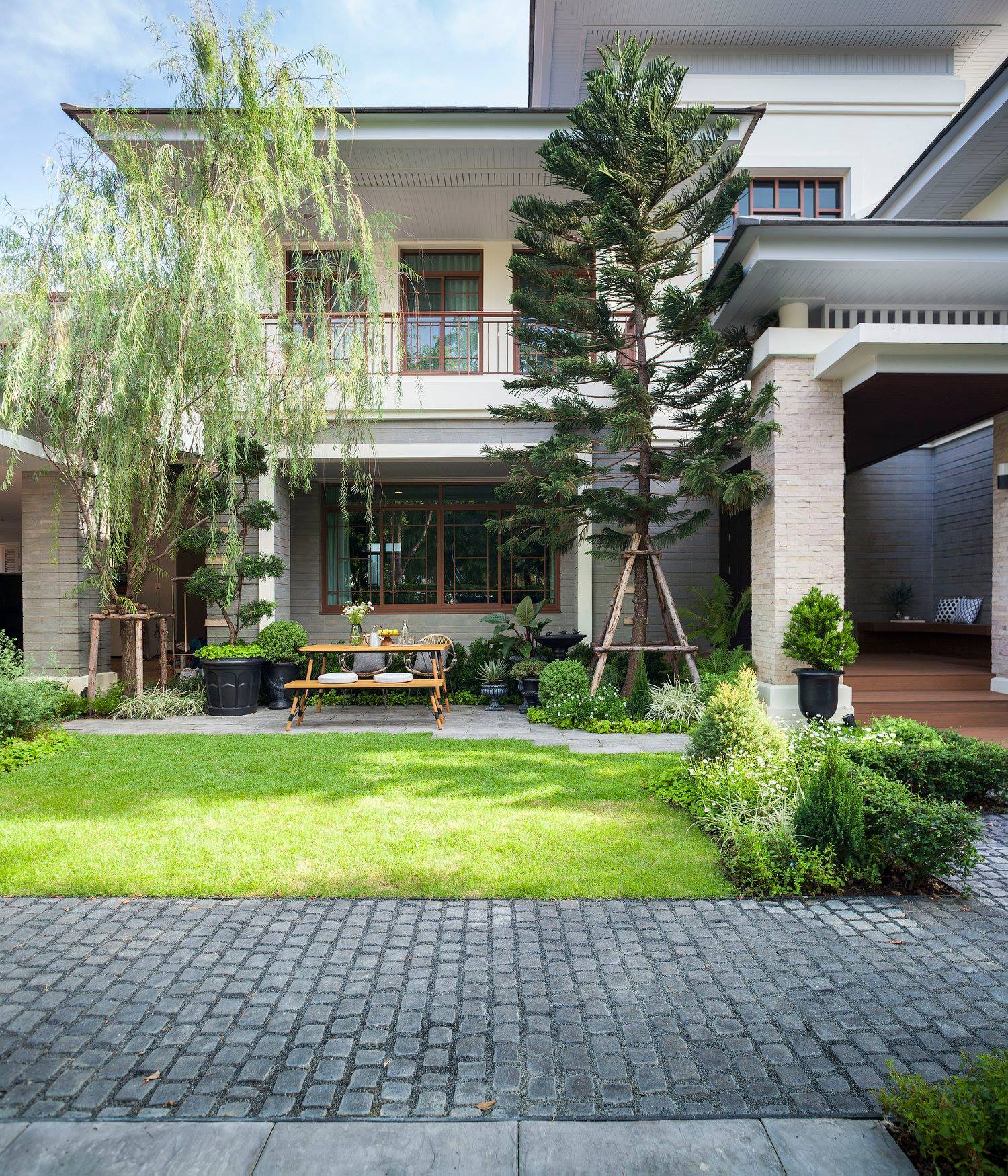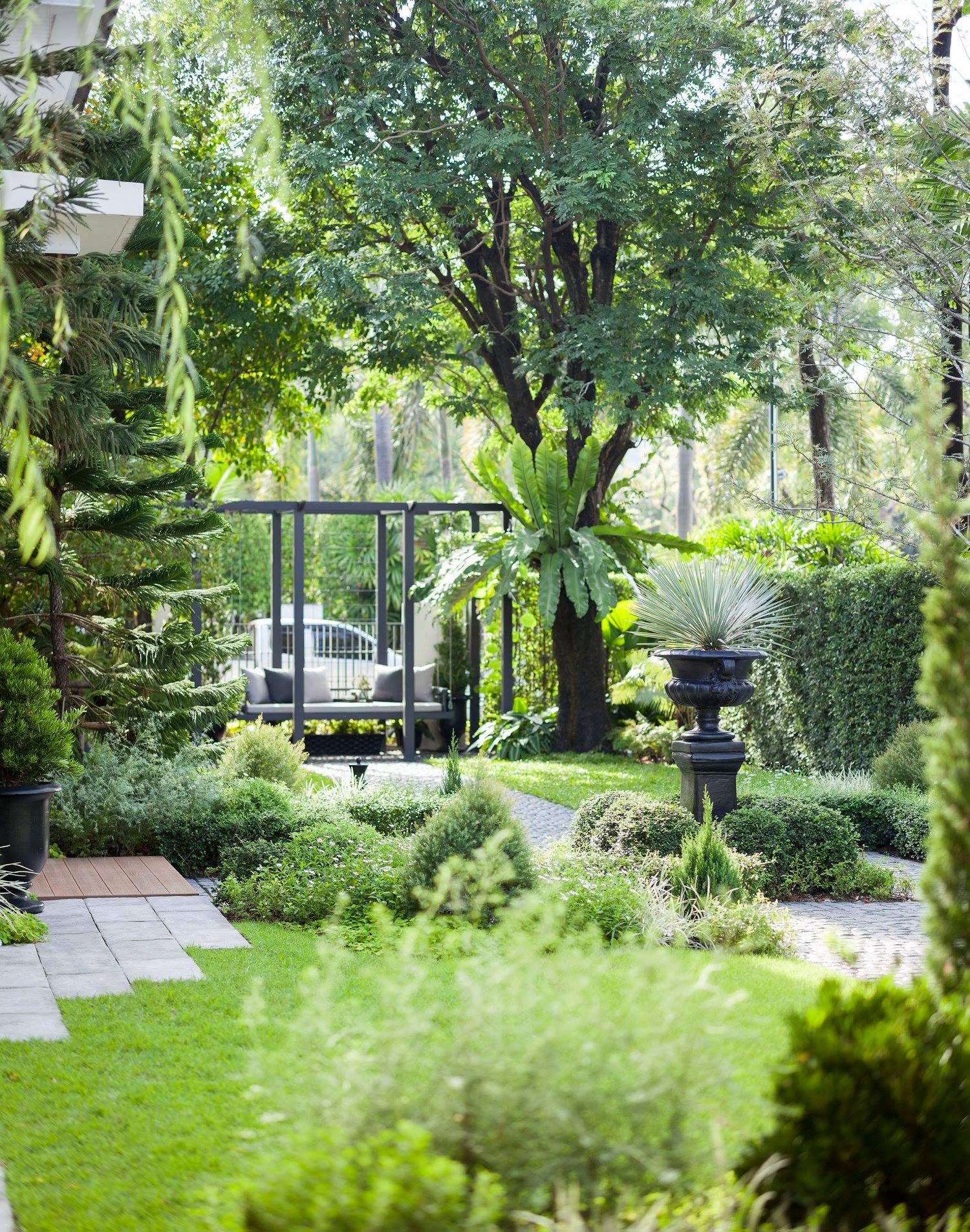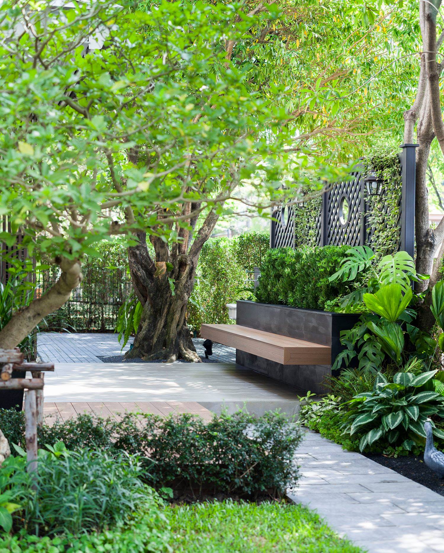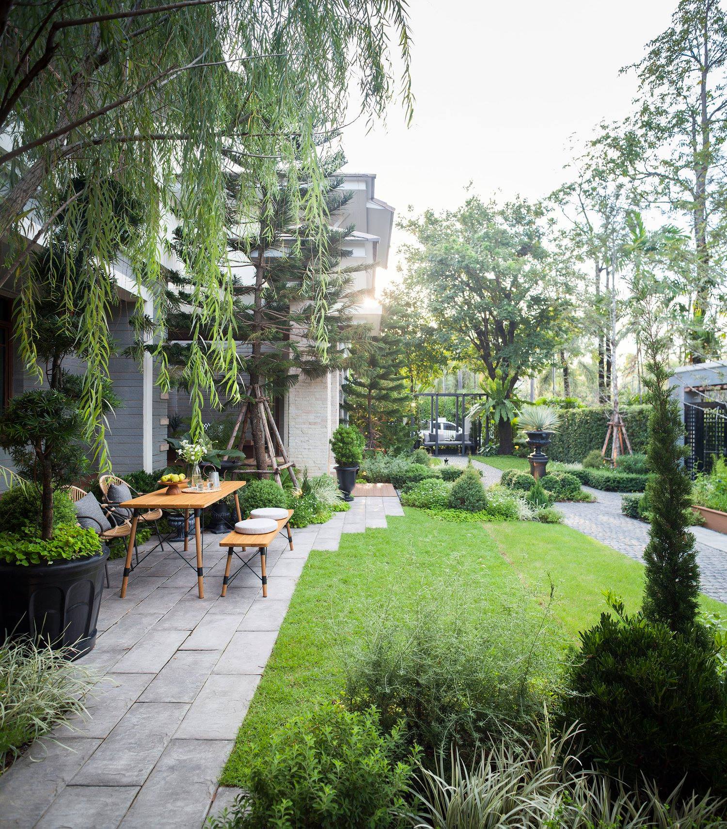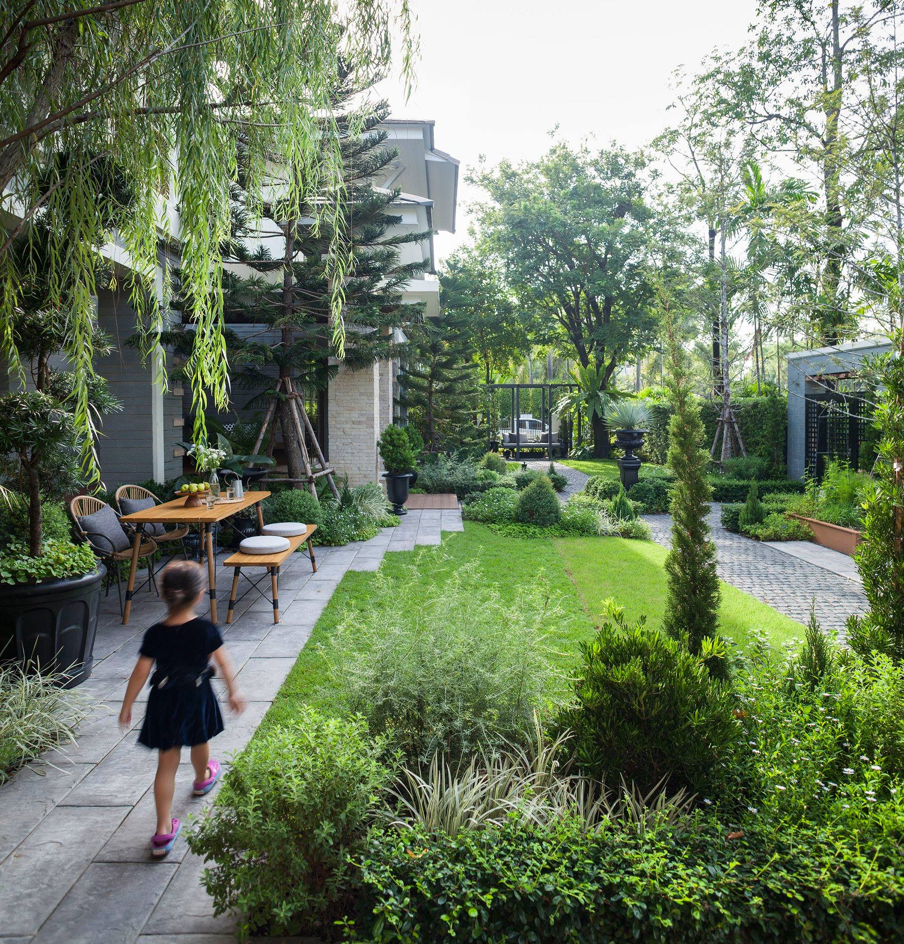 สวนนี้ก็เป็นอีกผลงานหนึ่งที่เราภาคภูมิใจ เพราะได้ใส่ไอเดียและฟังก์ชั่นไว้แบบครบครัน แบบที่เรียกได้ว่าไม่มีกั๊ก ทุกจุดผ่านการคิดวิเคราะห์มุมมองให้เกิดความเหมาะสมกับการใช้งานและสวยงามที่สุด ประกอบกับการทำการบ้านระหว่างเจ้าของบ้านและทีมงานของเราในการปรับหาจุดที่ลงตัว ปล่อยอิสระในการออกแบบและจัดสรรพื้นที่ ทำให้เกิดความสอดคล้องกับการใช้งานในชีวิตประจำวัน สวนแห่งนี้จึงตอบโจทย์สำหรับคนรักสวนอังกฤษที่ชอบความเป็นระเบียบเรียบร้อย สะอาด โปร่งโล่ง เดินสะดวกใช้งานสบาย แต่จะสวยงามแค่ไหนตามมาชมภาพกันเลยค่ะ
