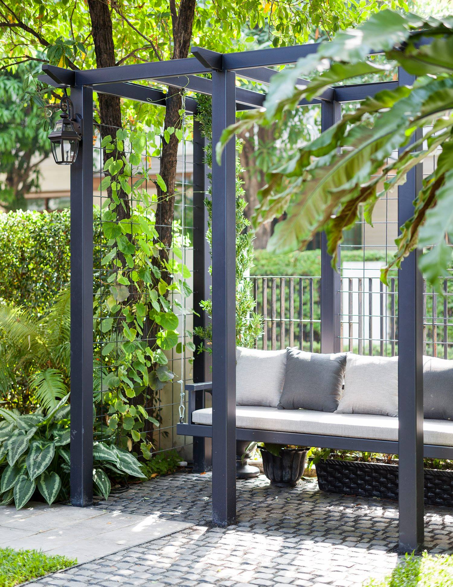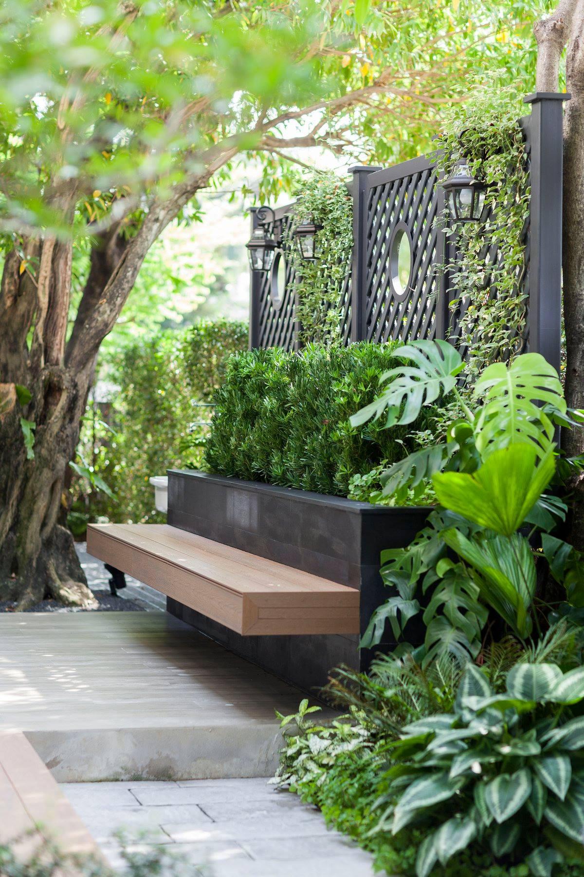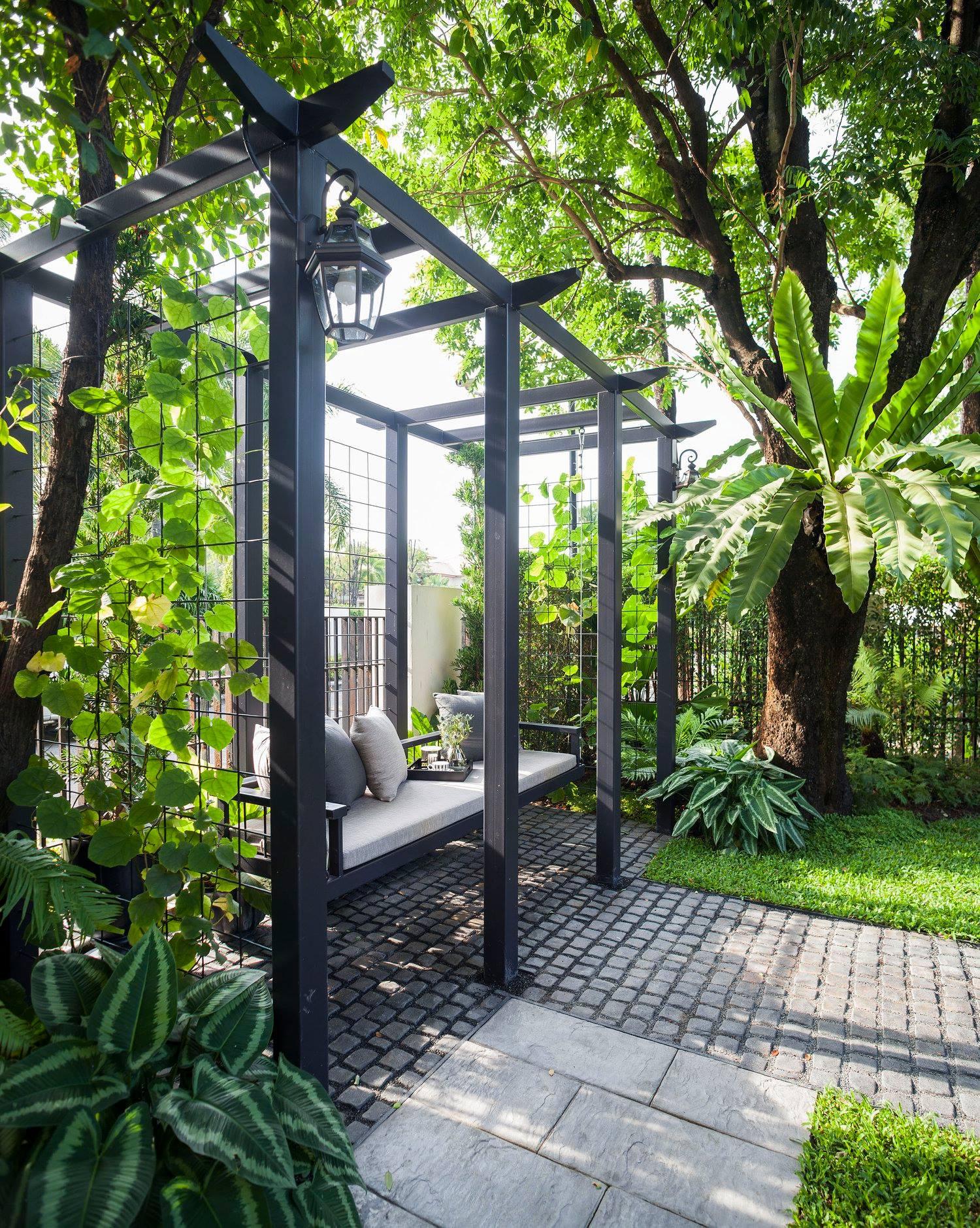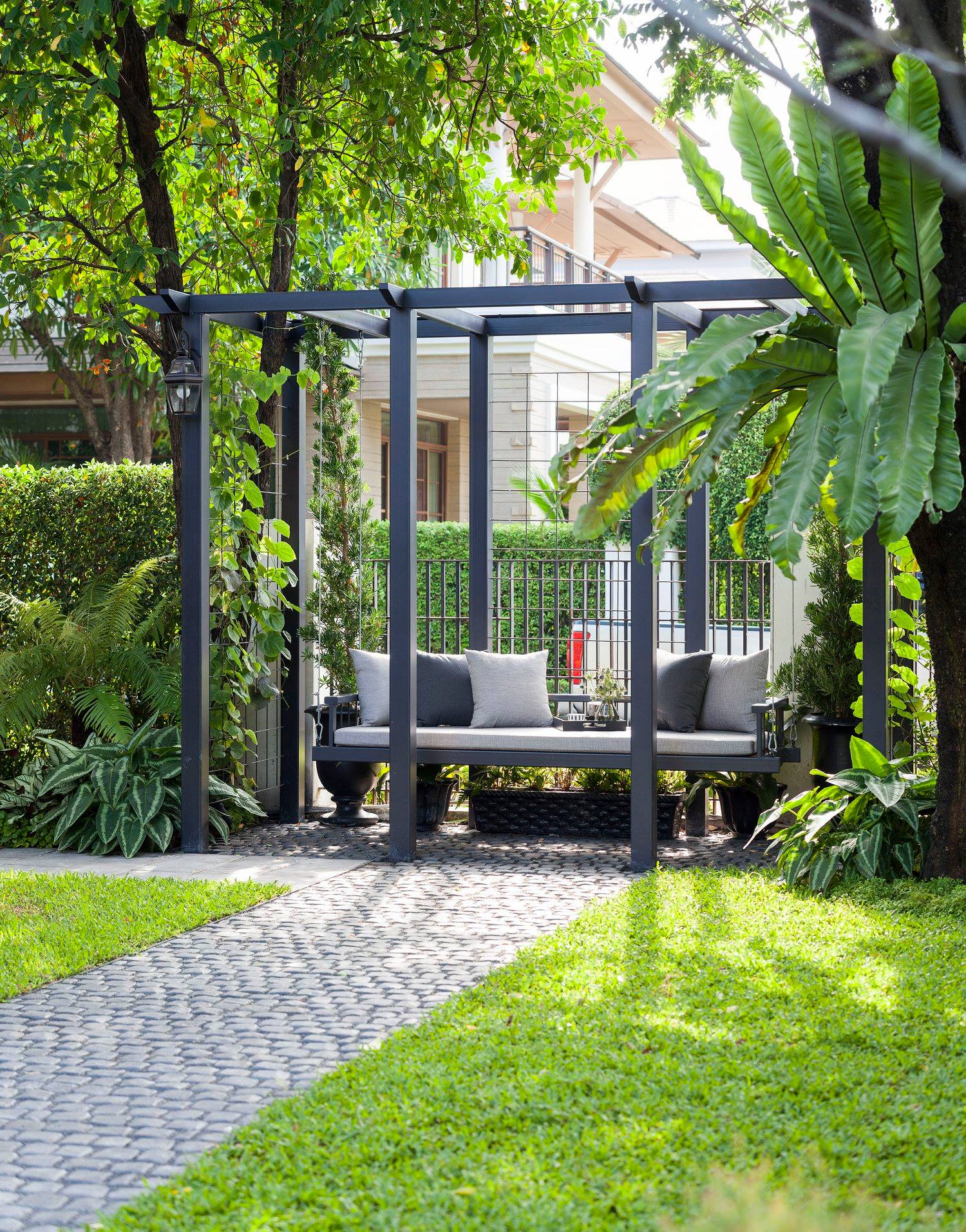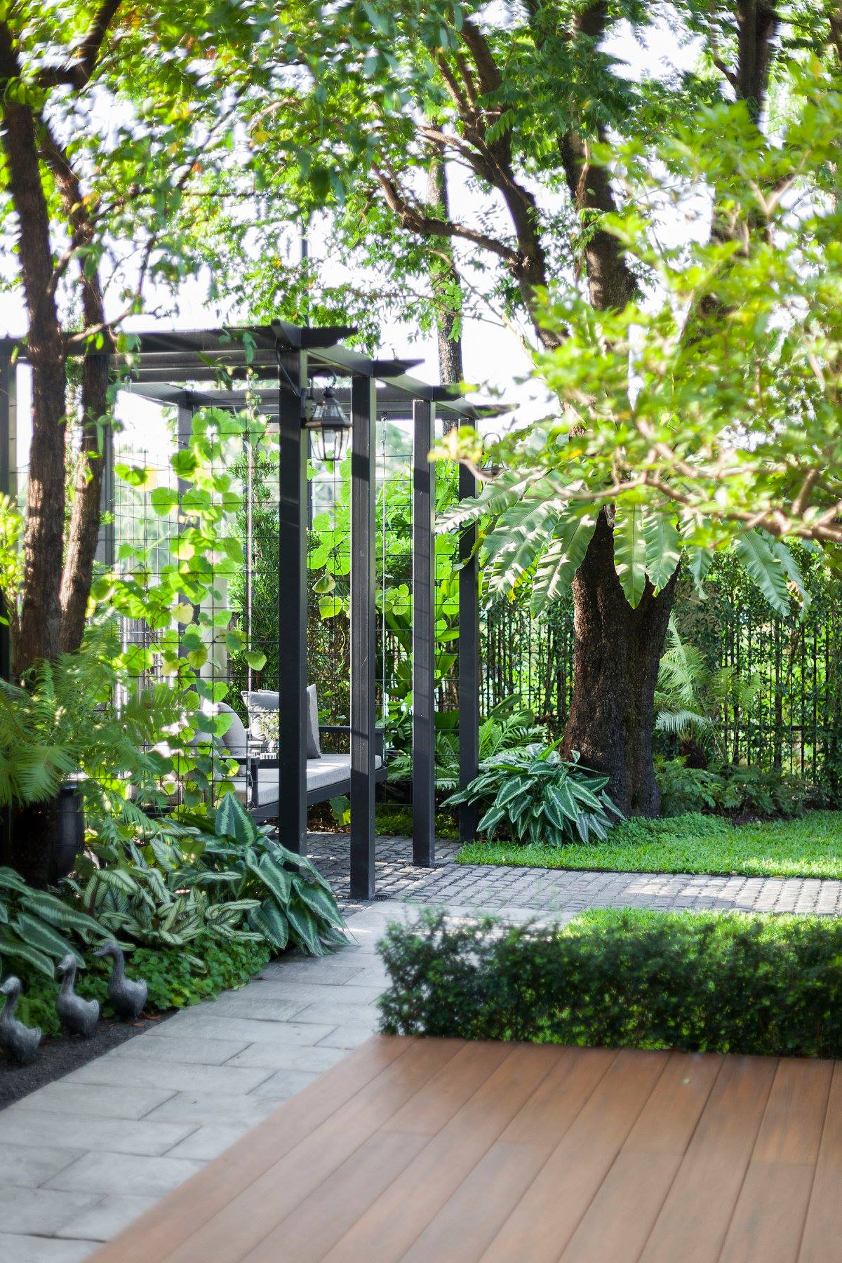 สวนนี้ก็เป็นอีกผลงานหนึ่งที่เราภาคภูมิใจ เพราะได้ใส่ไอเดียและฟังก์ชั่นไว้แบบครบครัน แบบที่เรียกได้ว่าไม่มีกั๊ก ทุกจุดผ่านการคิดวิเคราะห์มุมมองให้เกิดความเหมาะสมกับการใช้งานและสวยงามที่สุด ประกอบกับการทำการบ้านระหว่างเจ้าของบ้านและทีมงานของเราในการปรับหาจุดที่ลงตัว ปล่อยอิสระในการออกแบบและจัดสรรพื้นที่ ทำให้เกิดความสอดคล้องกับการใช้งานในชีวิตประจำวัน สวนแห่งนี้จึงตอบโจทย์สำหรับคนรักสวนอังกฤษที่ชอบความเป็นระเบียบเรียบร้อย สะอาด โปร่งโล่ง เดินสะดวกใช้งานสบาย แต่จะสวยงามแค่ไหนตามมาชมภาพกันเลยค่ะ
