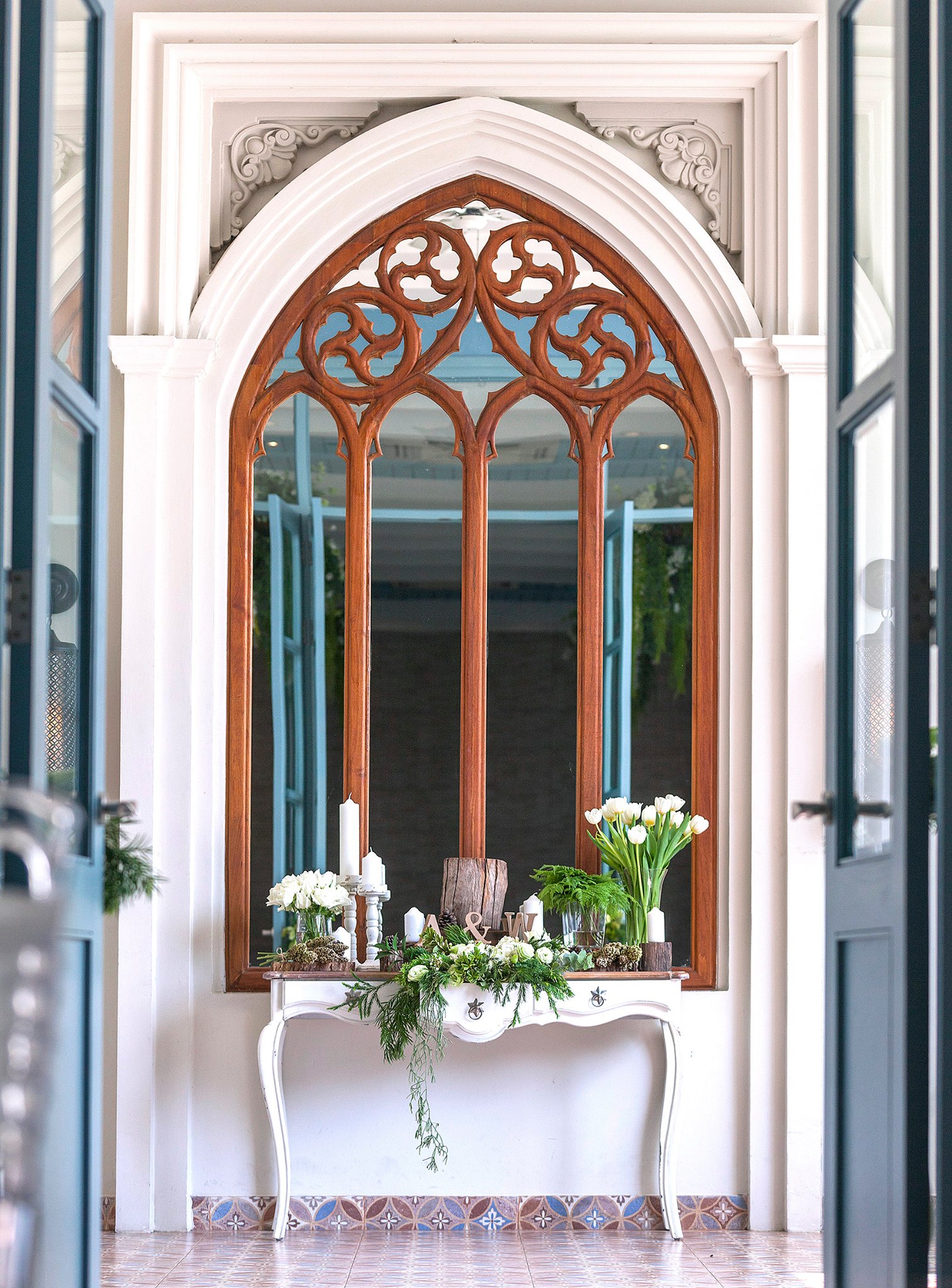 วันนี้เอางาน outdoor เก๋ๆ สดๆ ร้อนๆ และต้องระวังฝน มาฝากทุกคนค่ะ ต้องขอขอบคุณพี่อ้อมและพี่บอยมากๆ ที่ไว้ใจ shabby chic gardens ให้ดูแลในส่วนงานตกแต่งมุมน่ารักๆ ในงานนี้มีทั้งพิธีคริสต์ในช่วงบ่าย และงานเลี้ยงฉลองในช่วงค่ำ สำหรับมุมพิธีการเราเลือกใช้จุดเด่นของสถานที่บริเวณโถงทางเดินที่มีกระจกสวยบานใหญ่เป็นมุม hi-light สำหรับทำพิธี ก่อนจะดำเนินงานเข้าสู่งานฉลองบริเวณลานสนามหญ้าด้านนอกของตัวอาคารที่เปิดโล่งรับลมเย็นๆ ยามค่ำคืน พระเอกของลานคงอยู่ที่กระโจมสีขาวที่ดูเบาสบายน่าพักผ่อน ซึ่งใช้เป็นจุดต้อนรับแขกของทั้งคู่แบบเรียบเก๋ และโต๊ะลงทะเบียนที่ใช้ถังไวน์มาวางเพิ่มบรรยากาศให้ชิลล์ไปกันใหญ่ อยากเห็นว่าจะชิวแค่ไหนไปชมกันเลยค่ะ