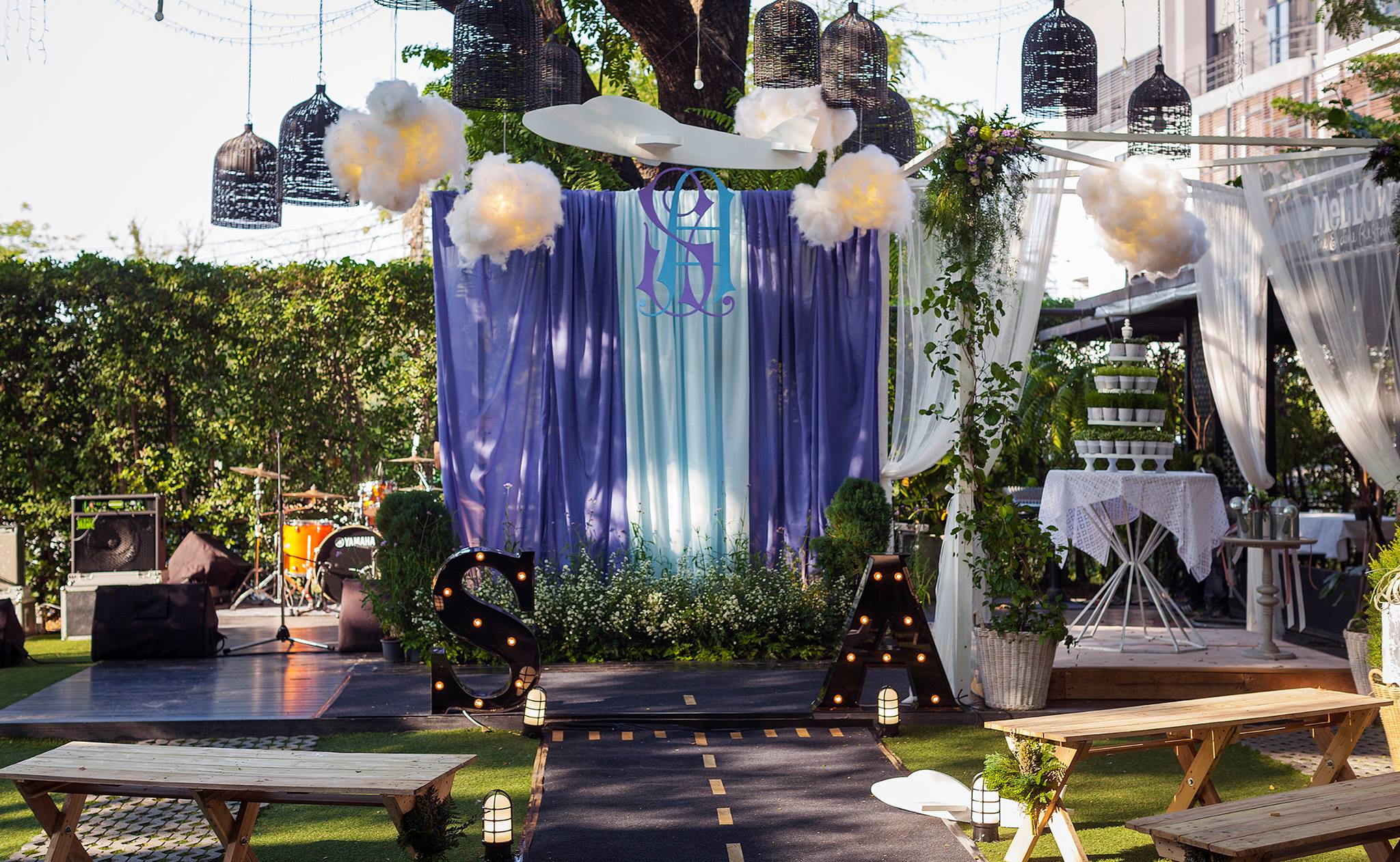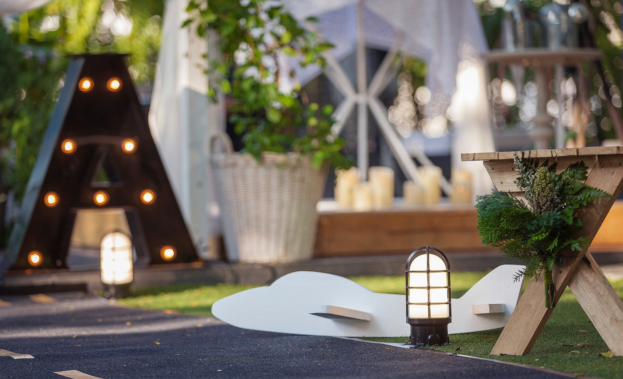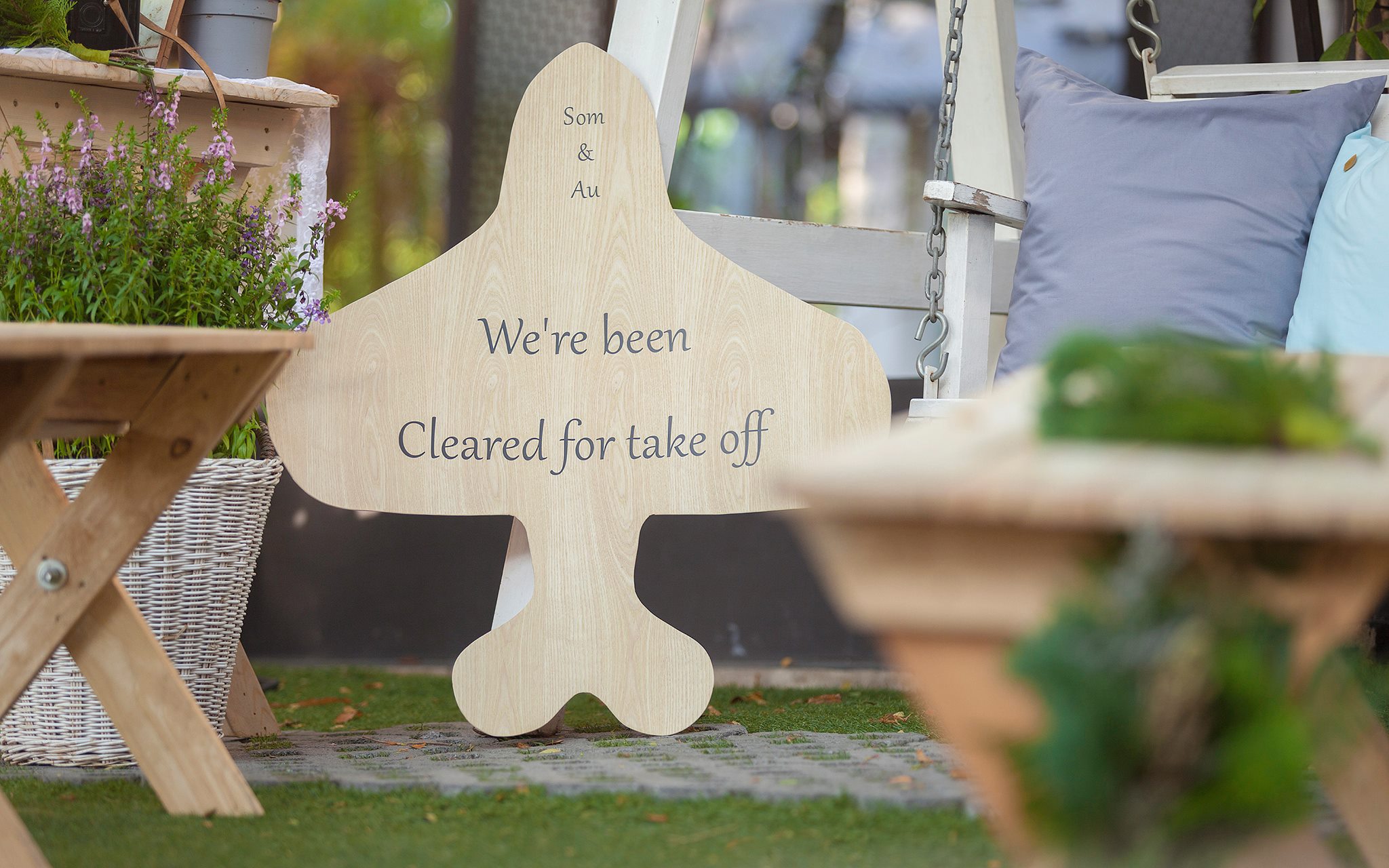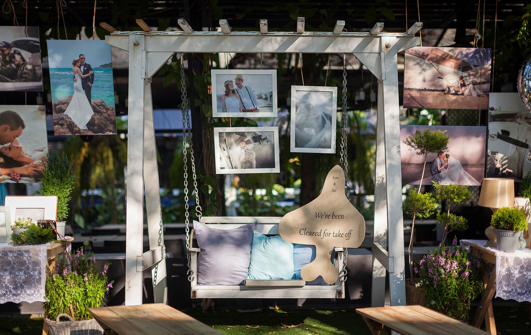 งานนี้ต้องขอบคุณอู๋และคุณส้มที่น่ารักที่สุด ที่ไว้ใจ shabby chic gardens ให้ได้คลีเอทกันสุดพลัง เพราะเรายกสนามบินขนาดย่อมๆ มาไว้กันกลางงานเลยทีเดียว ทั้งเครื่องบินลำใหญ่ที่ใช้เป็นพระเอก และเหล่าฝูงบินลูกสมุน ท่ามกลางปุยเมฆสีขาวเรืองแสงในยามค่ำคืน อีกจุดที่ชื่นชอบไม่แพ้กันคือทางเดินสำหรับเปิดตัวบ่าวสาวที่เราไม่ต้องปูพรมแดง แต่ถูกเปลี่ยนเป็นรันย์เวย์ขนาดกระทัดรัดที่มีโคมไฟสนามนำสายตาขนาบทั้งสองข้างของทางเดิน ทำให้งานนี้ดูน่ารัก เหมาะกับคู่รักสุดเก๋ของค่ำคืน อย่าง คุณอู๋-นักบินสุดเท่ห์ แห่งบางกอกแอร์เวย์ และคุณส้ม-แอร์โอสเตทสุดสวย ของการบินไทย ที่ทำให้งานสมบูรณ์แบบที่สุด ขอบคุณจริงๆ คะที่ให้เราได้ทำอะไรๆ สนุกๆ อย่างนี้ เย่ เย่